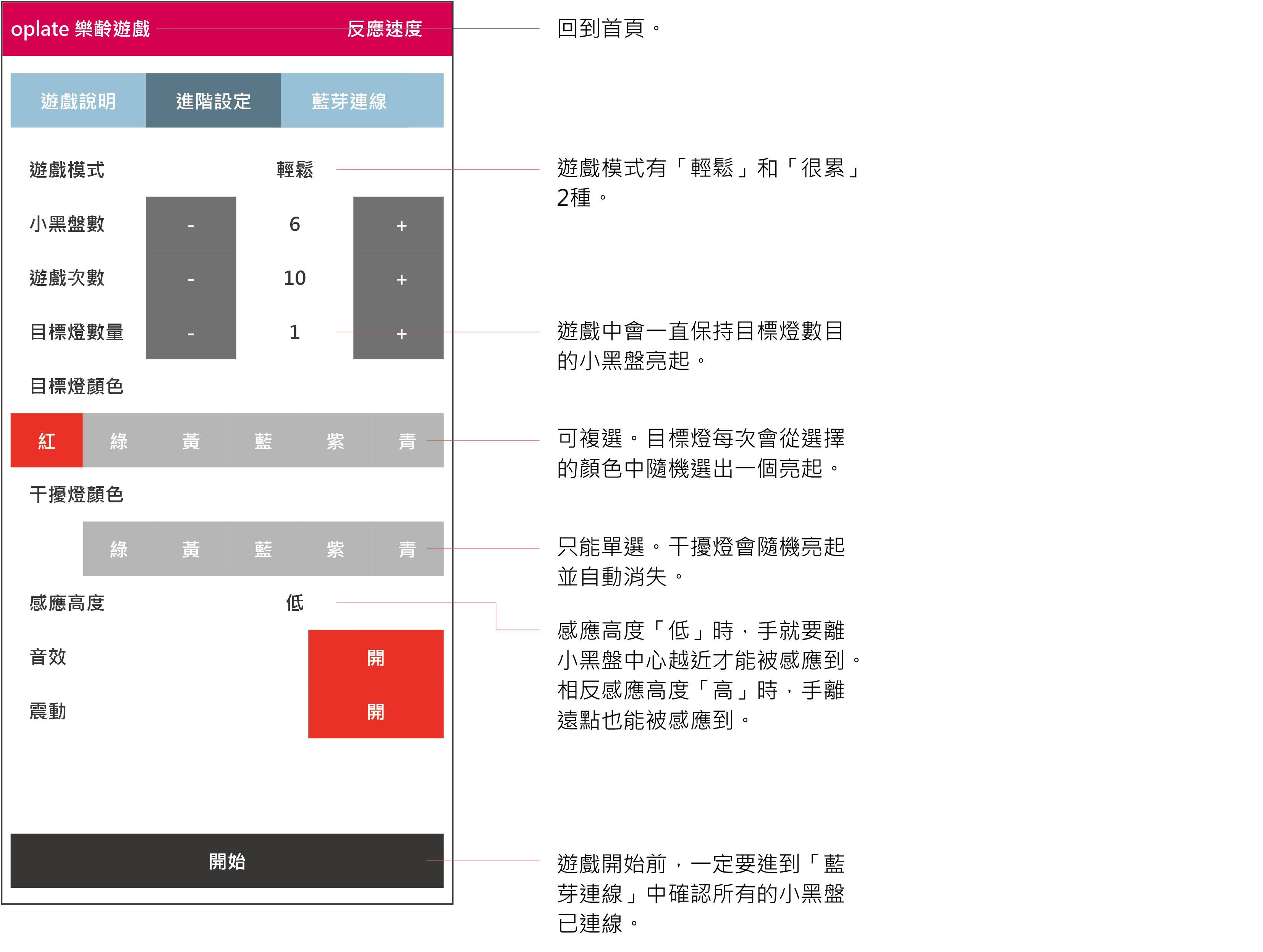 小黑盤會隨機亮起,用手或是腳去感應讓小黑盤暗掉,是反應訓練的入門遊戲。