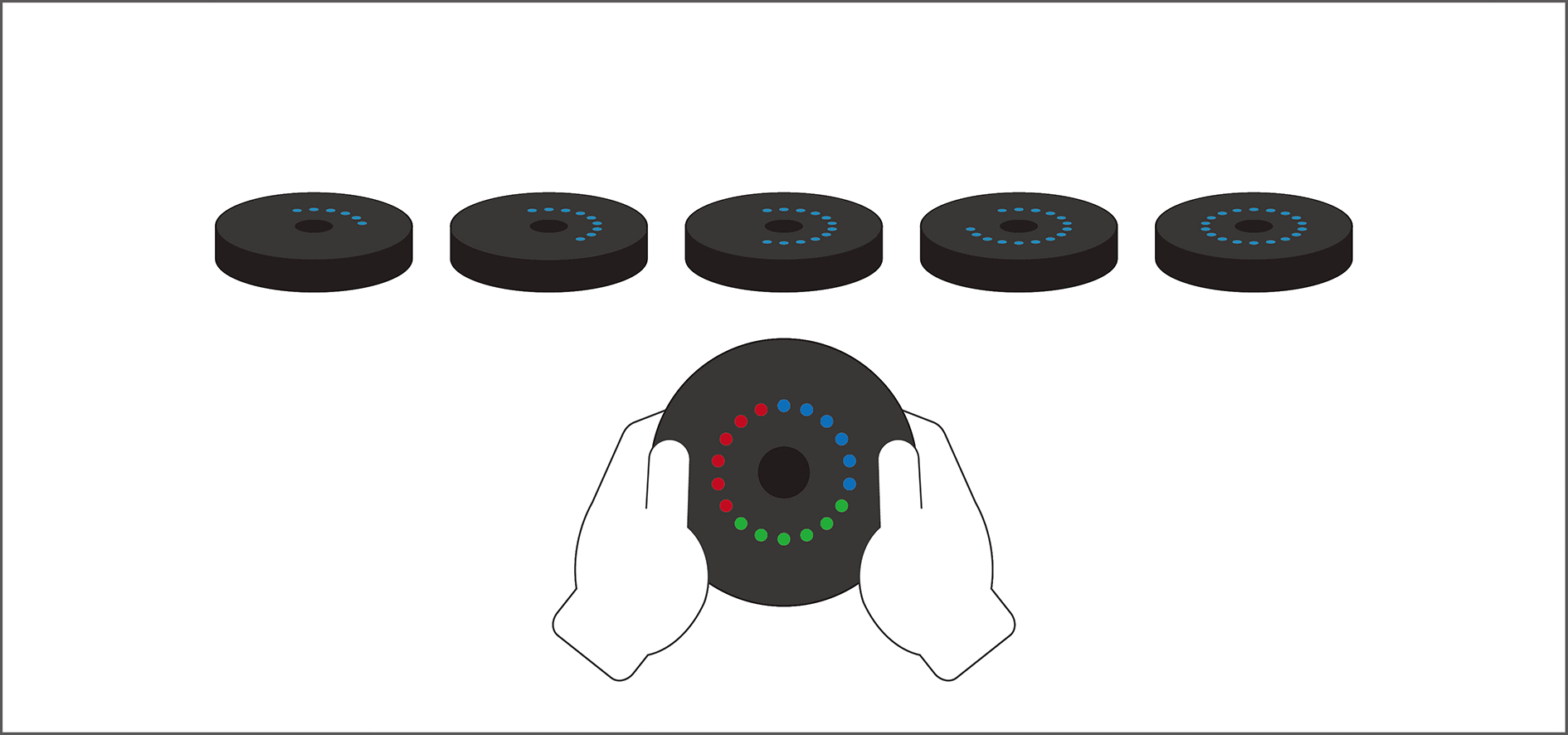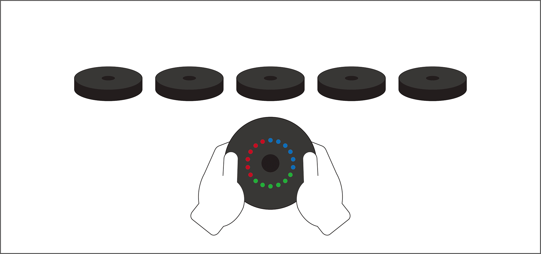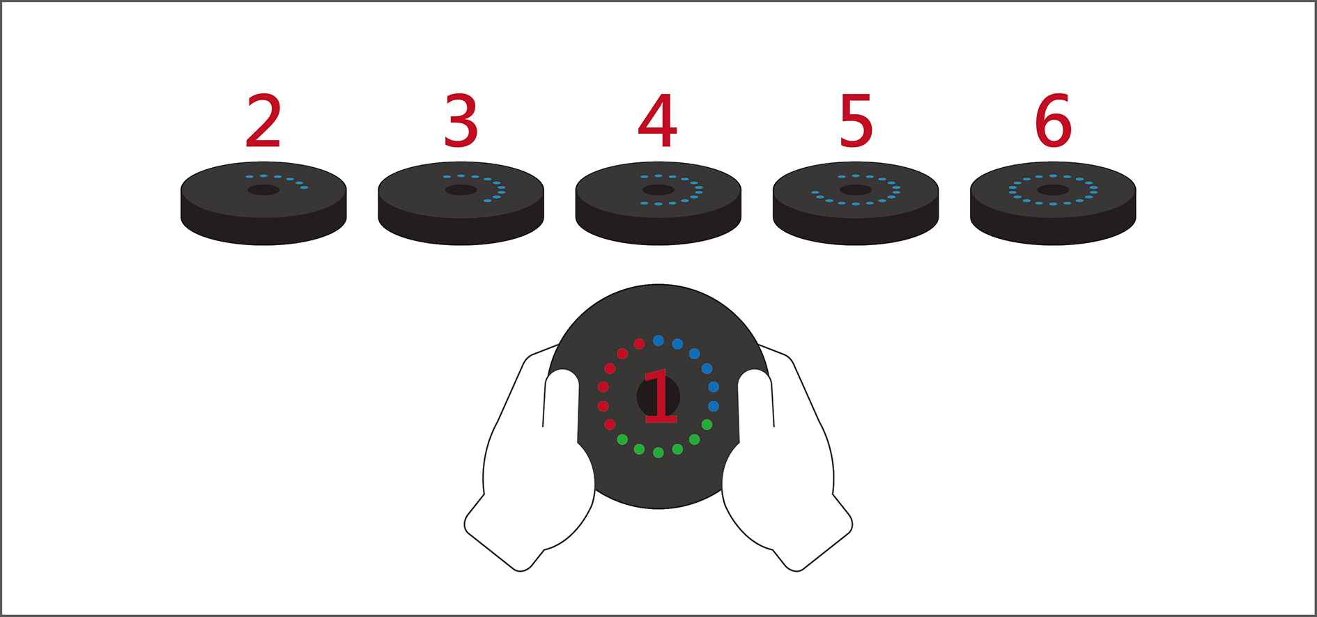 1. 手上拿著一號小黑盤,其他小黑盤從燈光少到多由左至右放至桌上。
