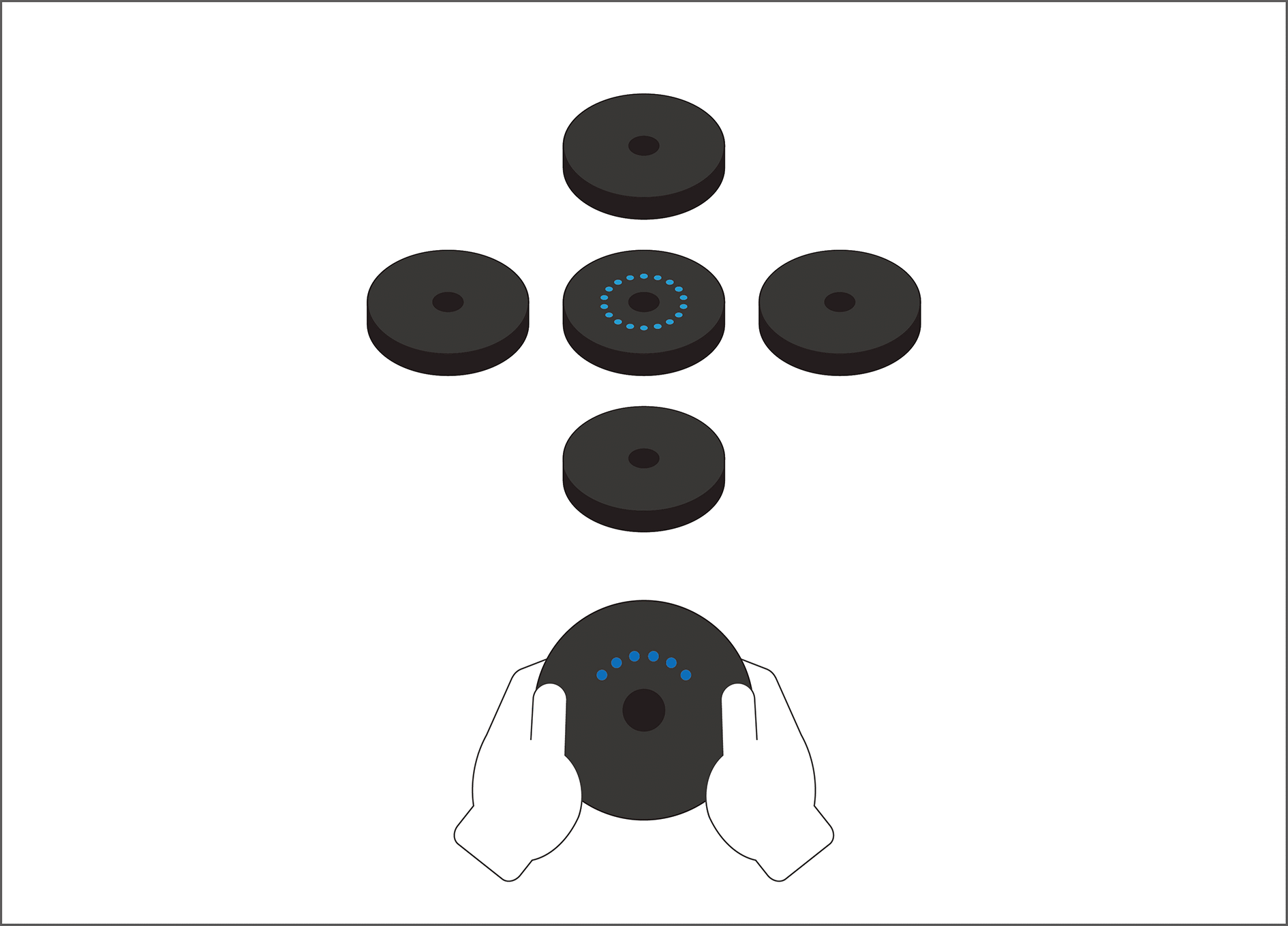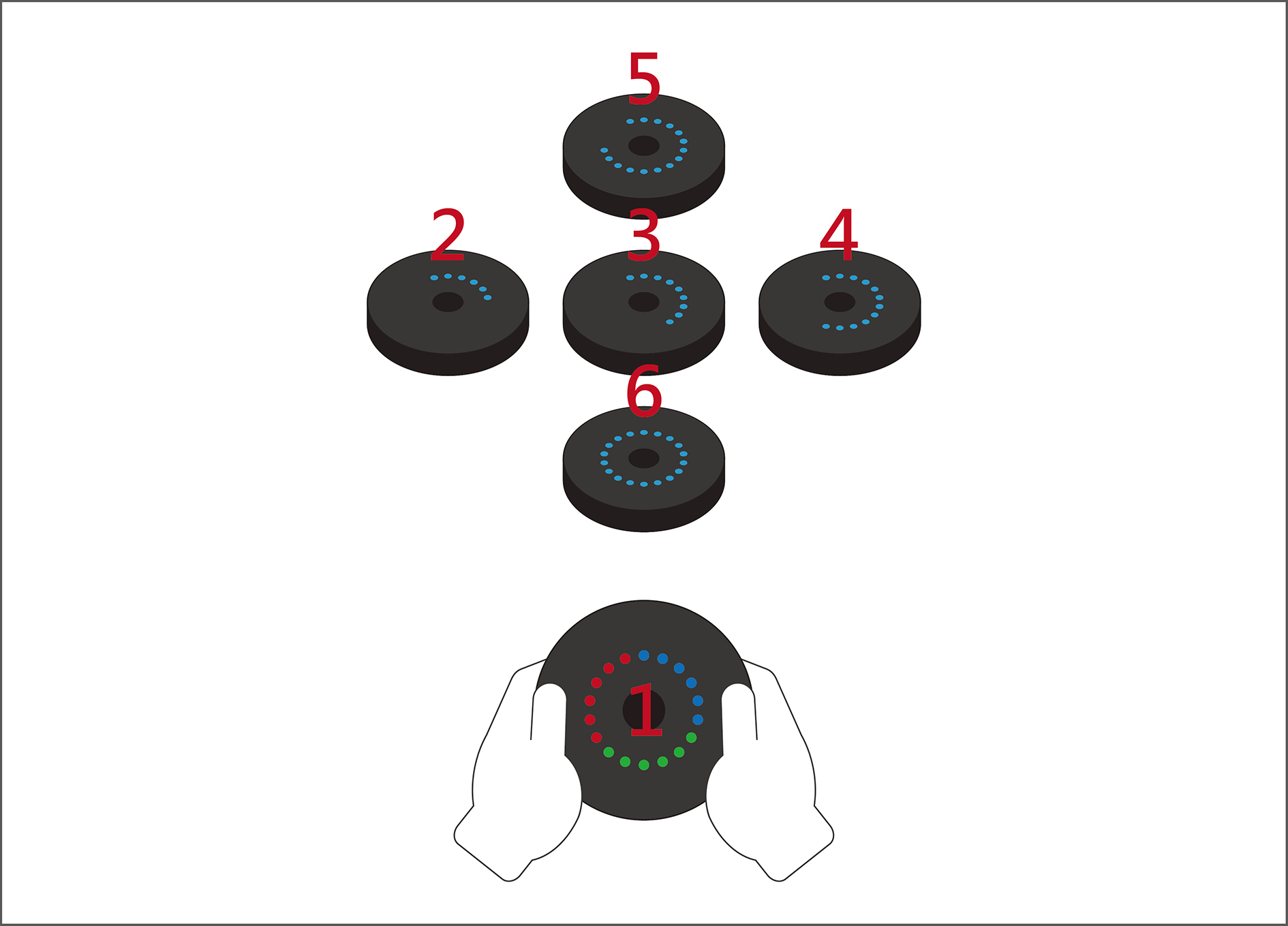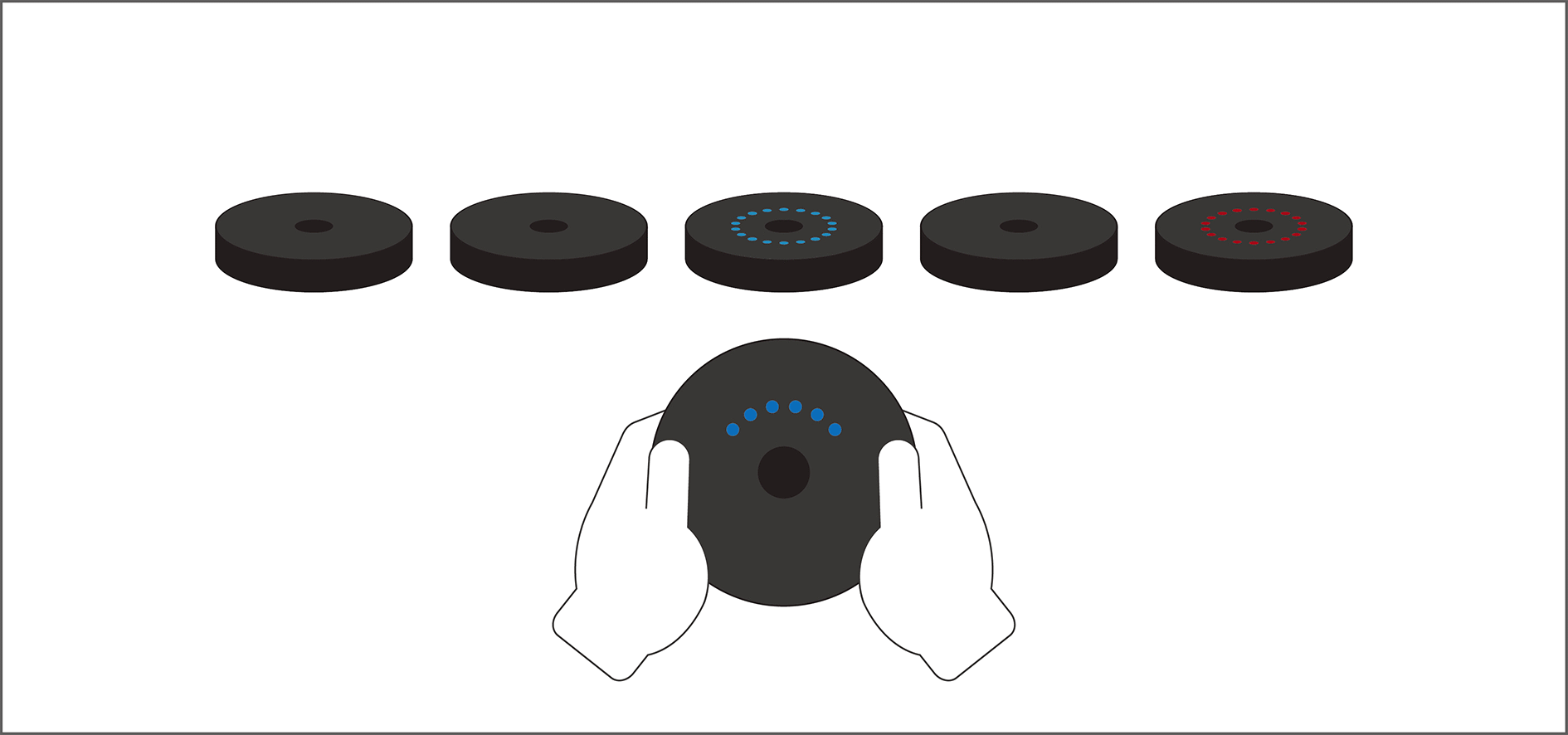 3. 將手上小黑盤左右轉動一下,桌上小黑盤中會出現指示燈號,會隨著手中小黑盤轉動而移動到相對應的位置。注意手中的小黑盤要立起來垂直於地面。