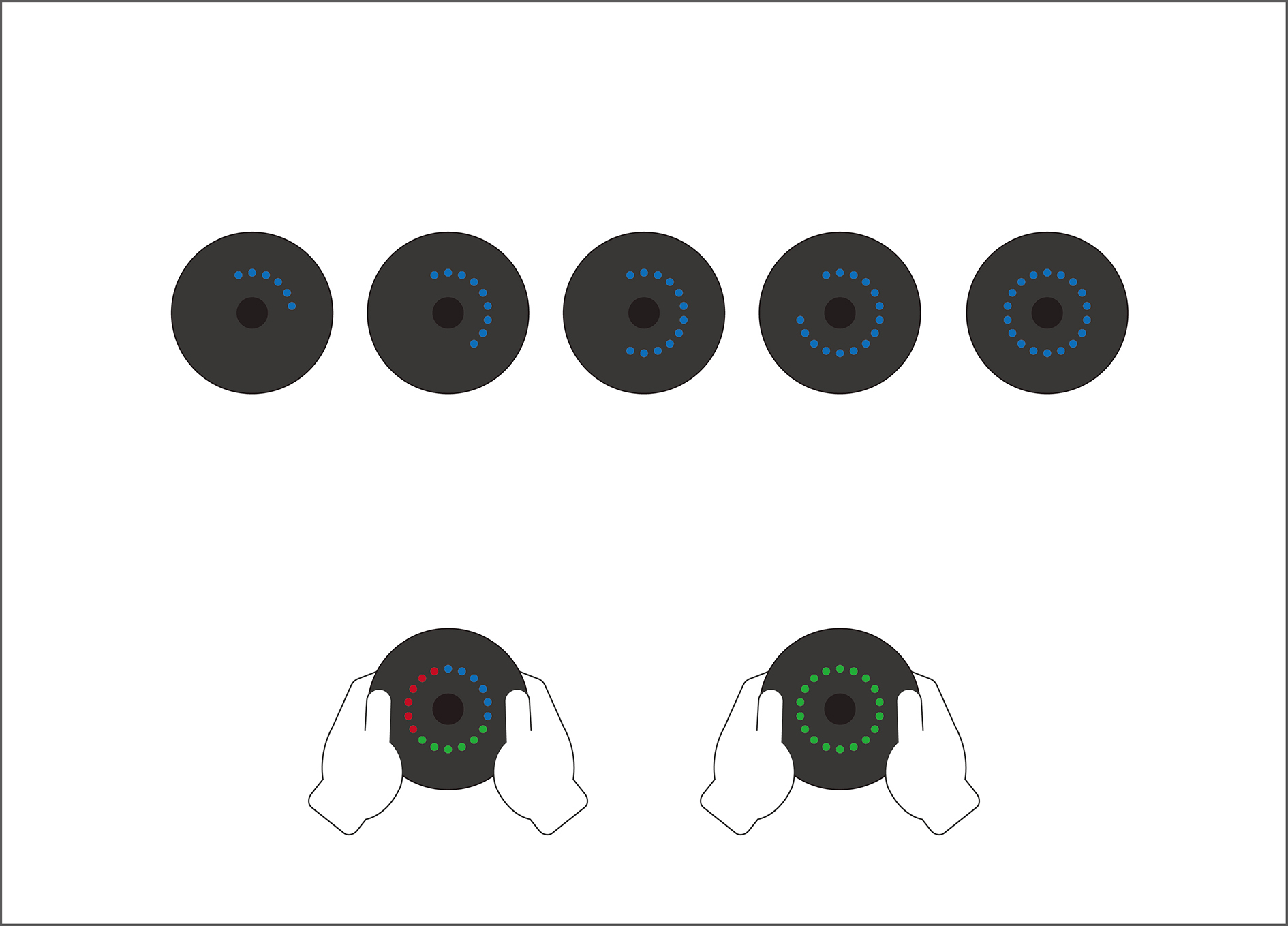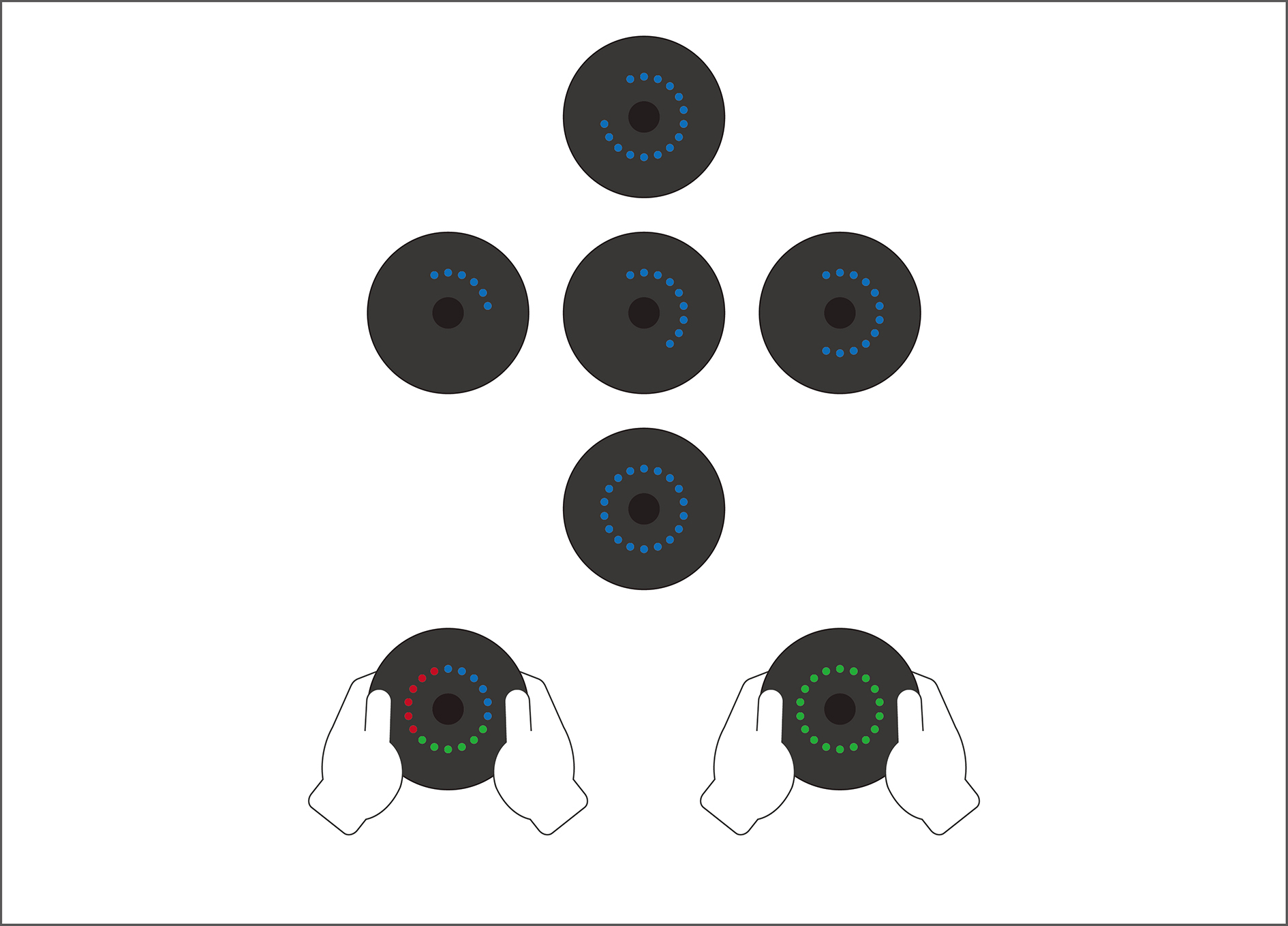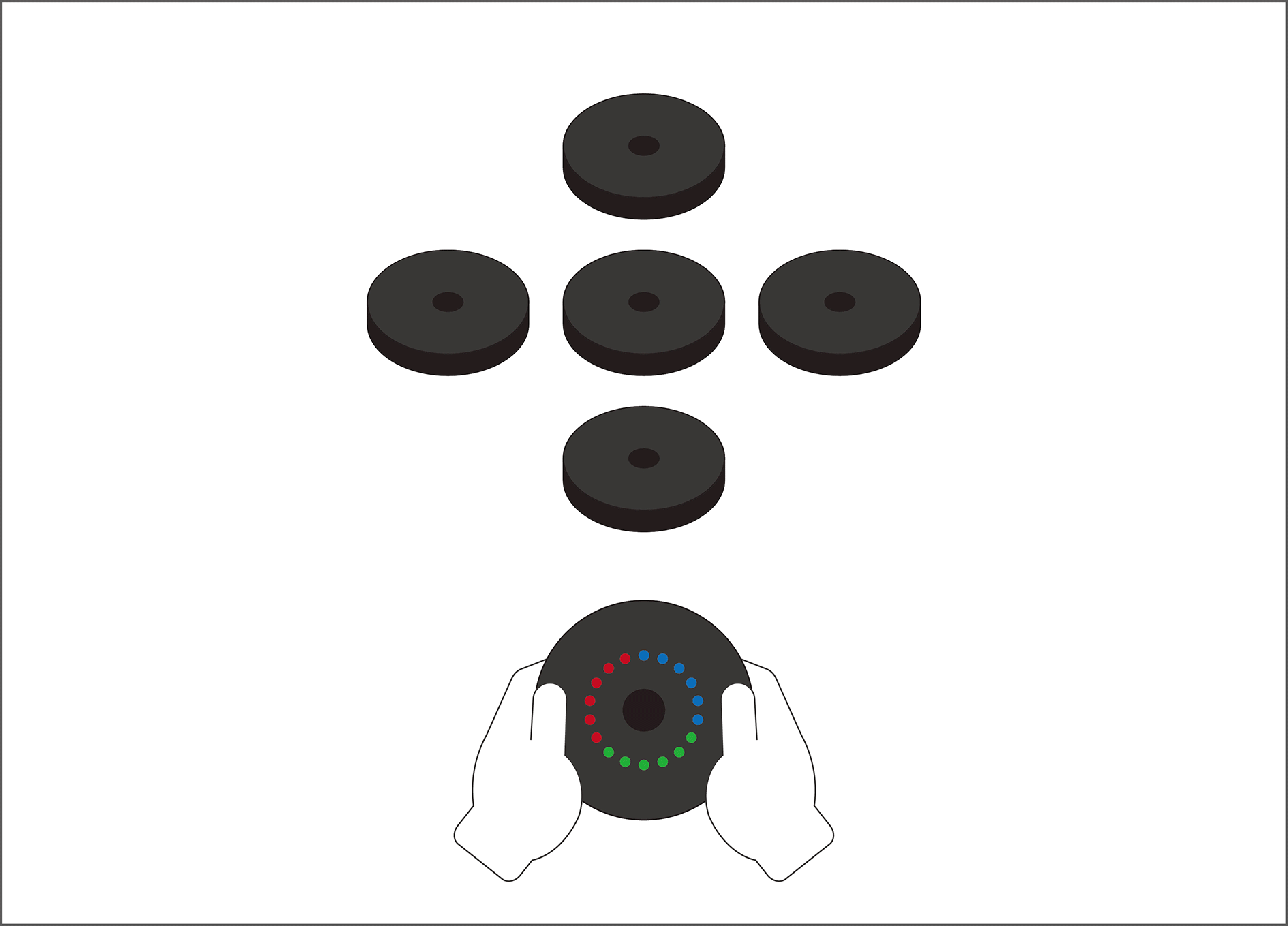 透過左右旋轉手中的小黑盤,比賽看誰先將自己的燈光移動到題目燈(紅燈)的位置。