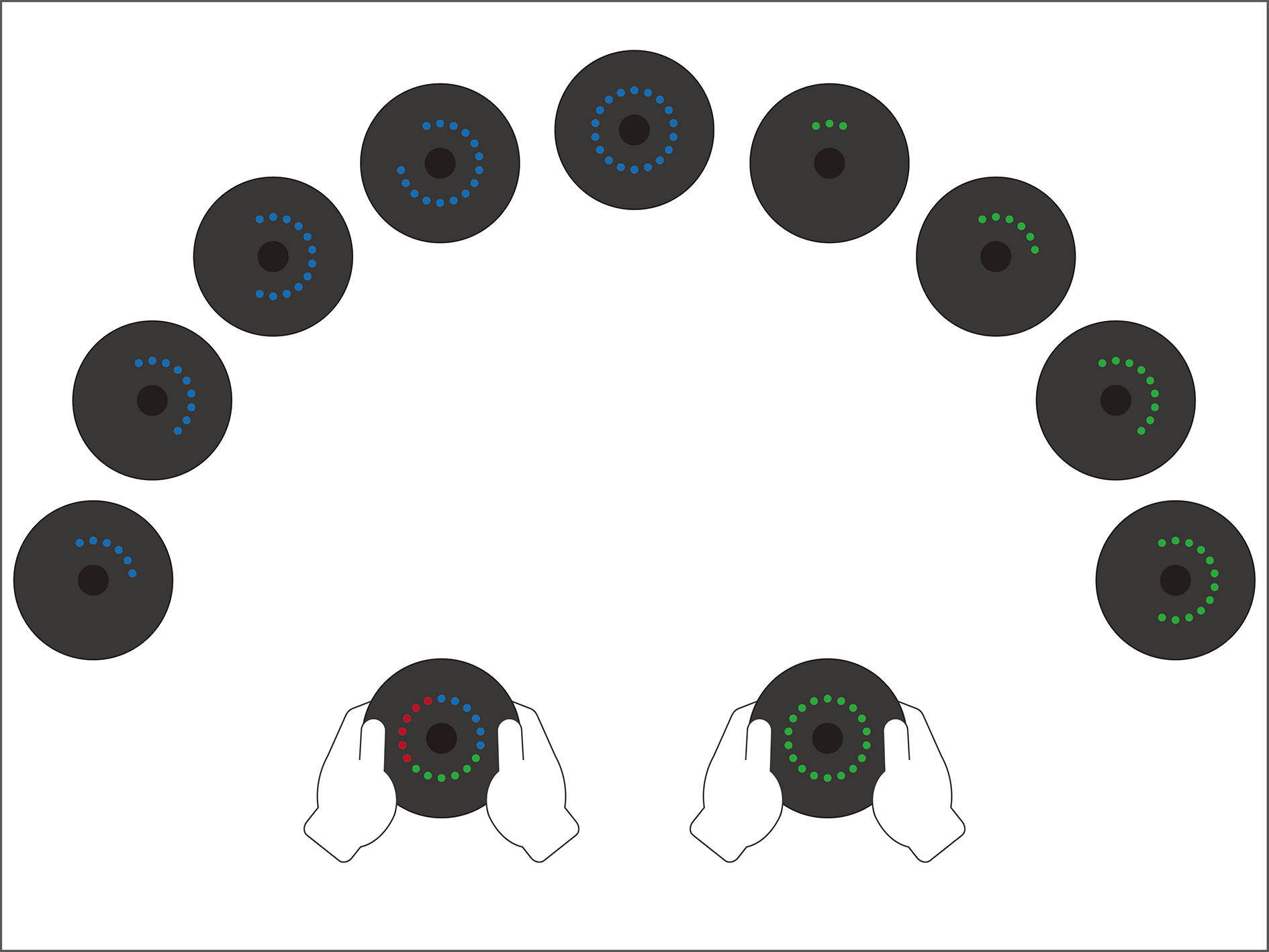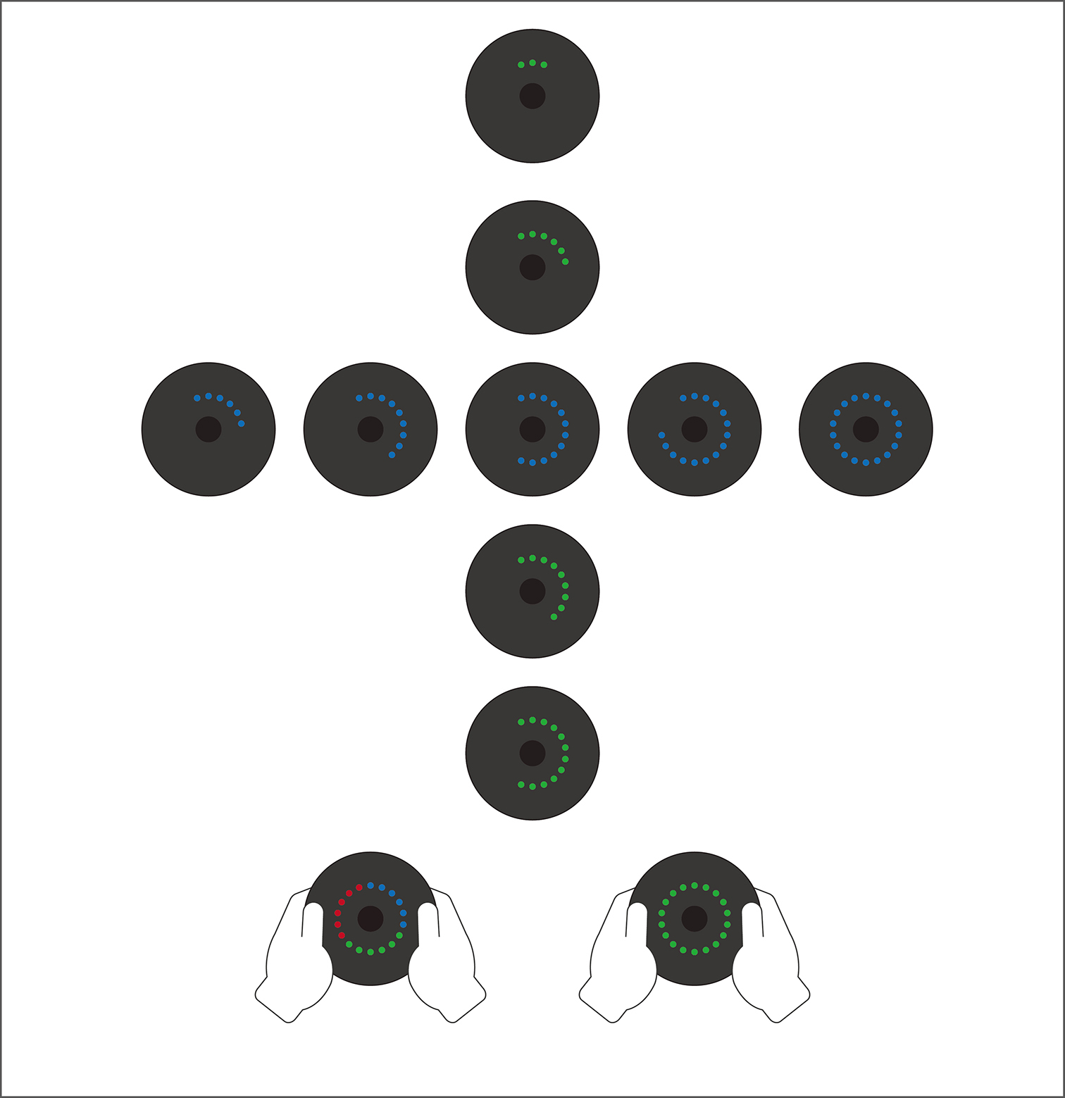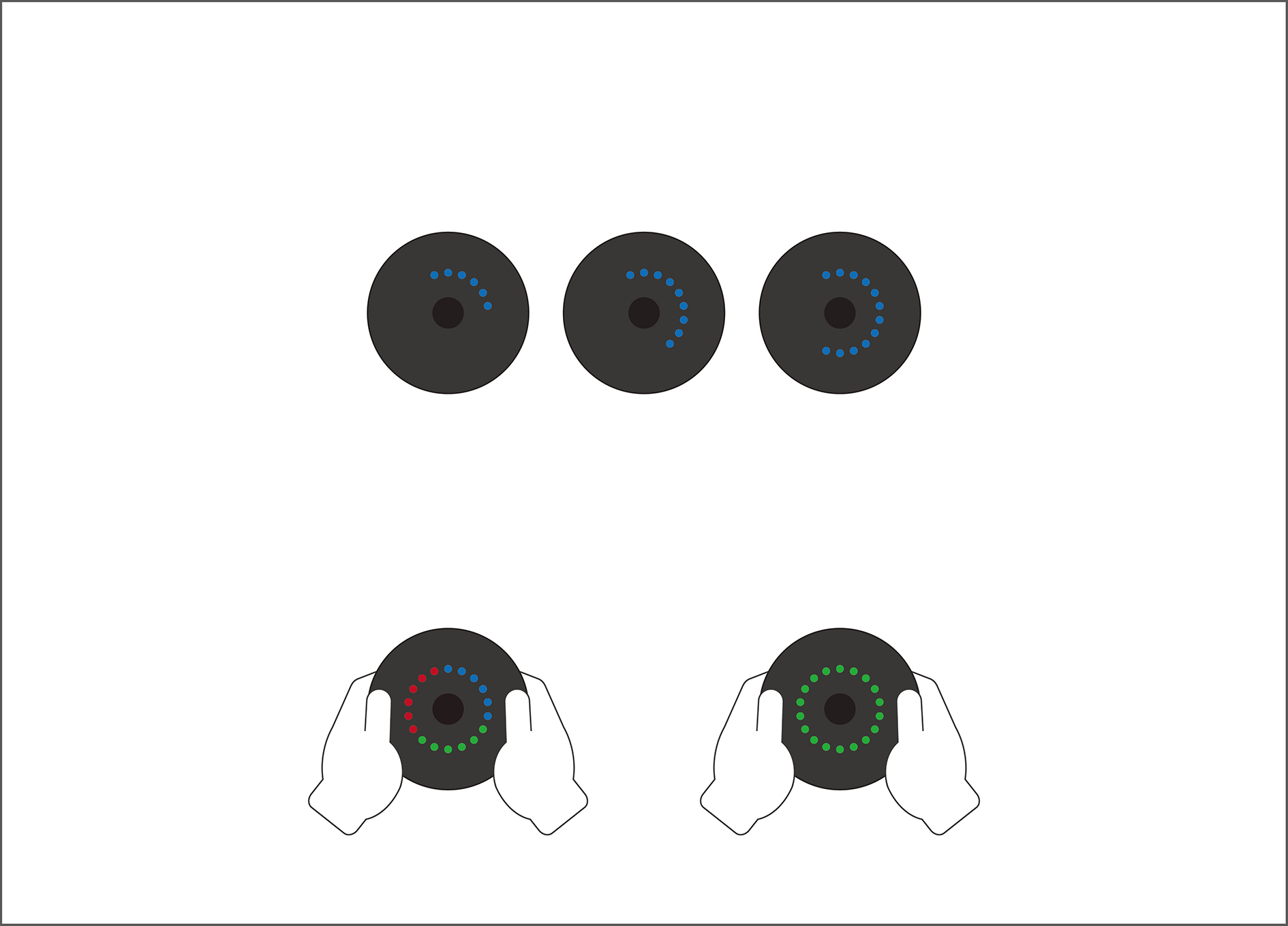 透過左右旋轉手中的小黑盤,比賽看誰先將自己的燈光移動到題目燈(紅燈)的位置。
