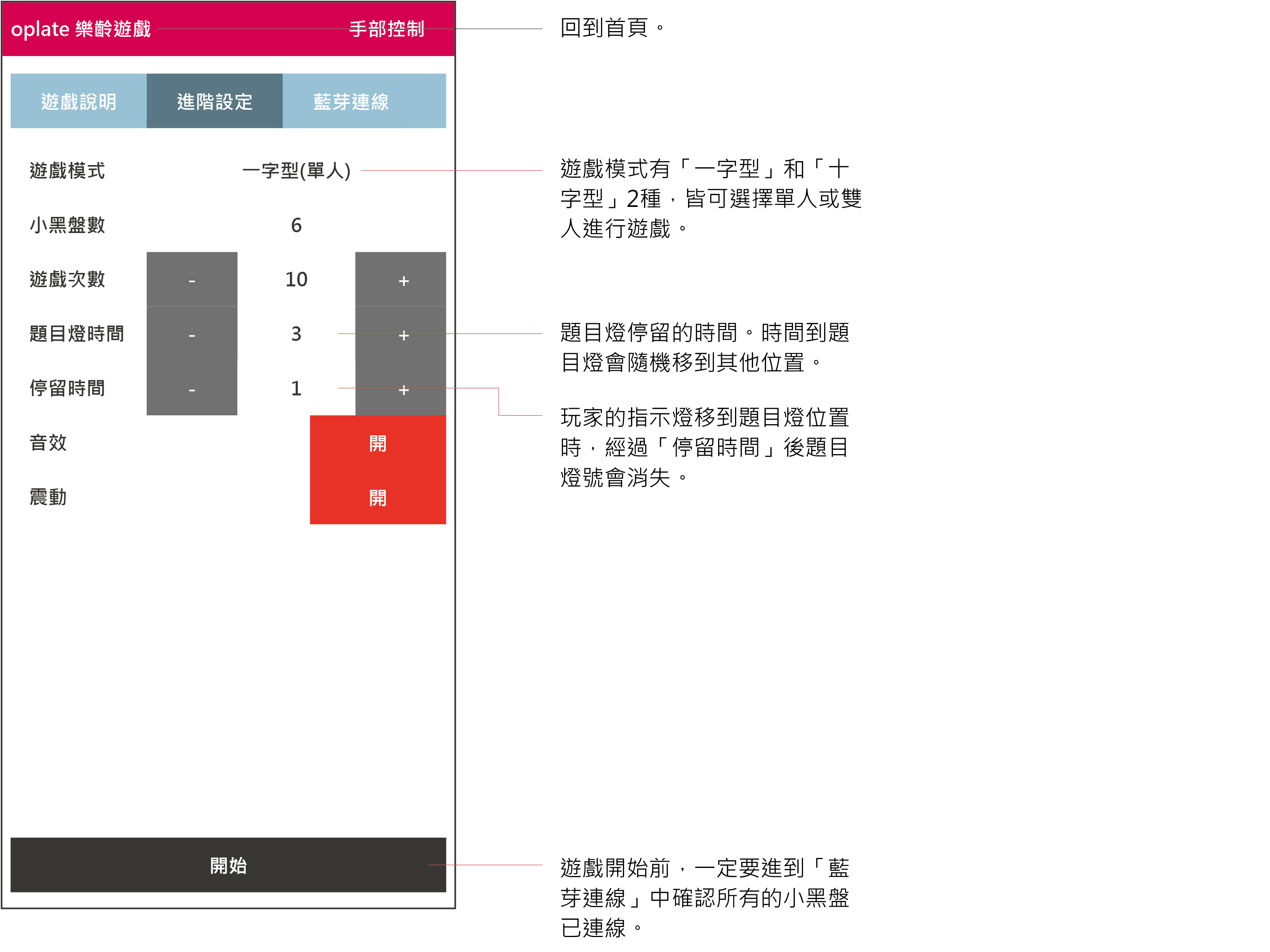 藉由更改「題目燈時間」和「停留時間」,可以調整遊戲的難易度。