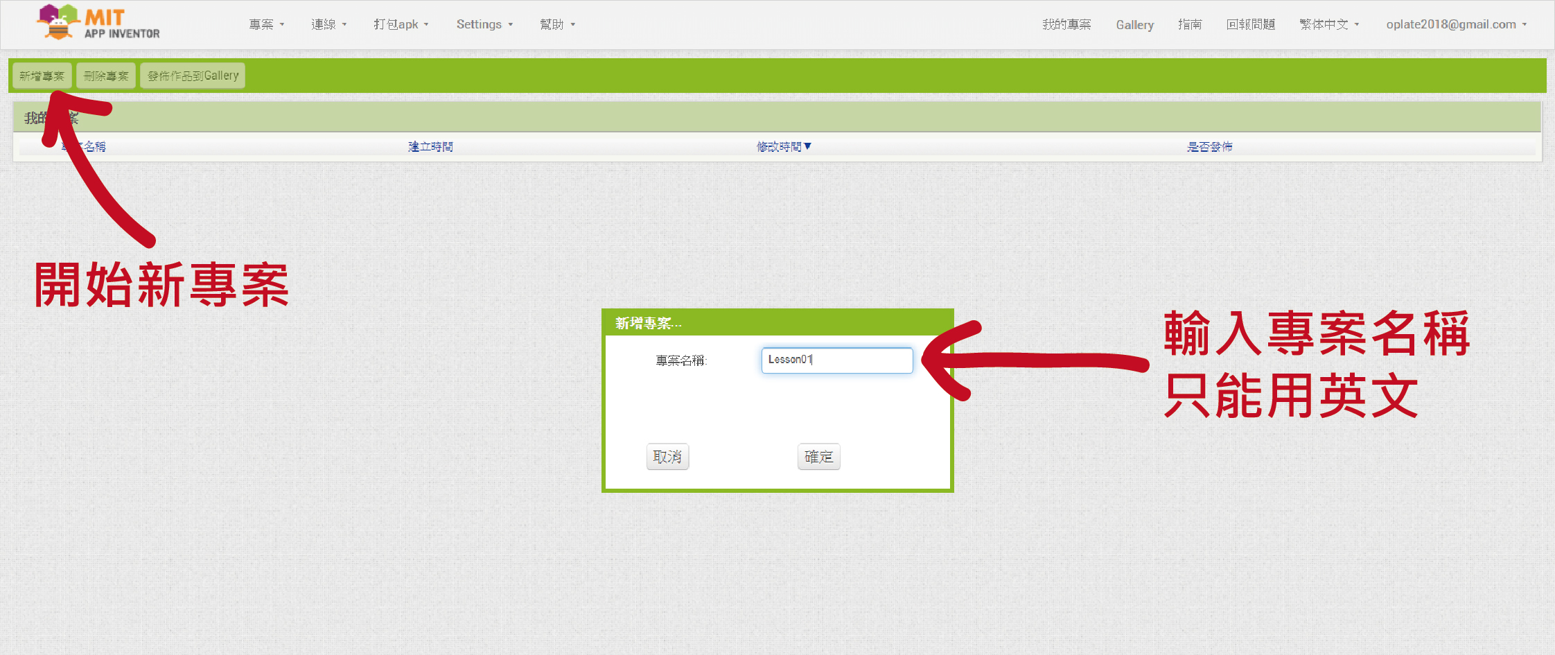 7. 左上角點擊「新增專案」,輸入名稱「Lesson01」開始新專案。