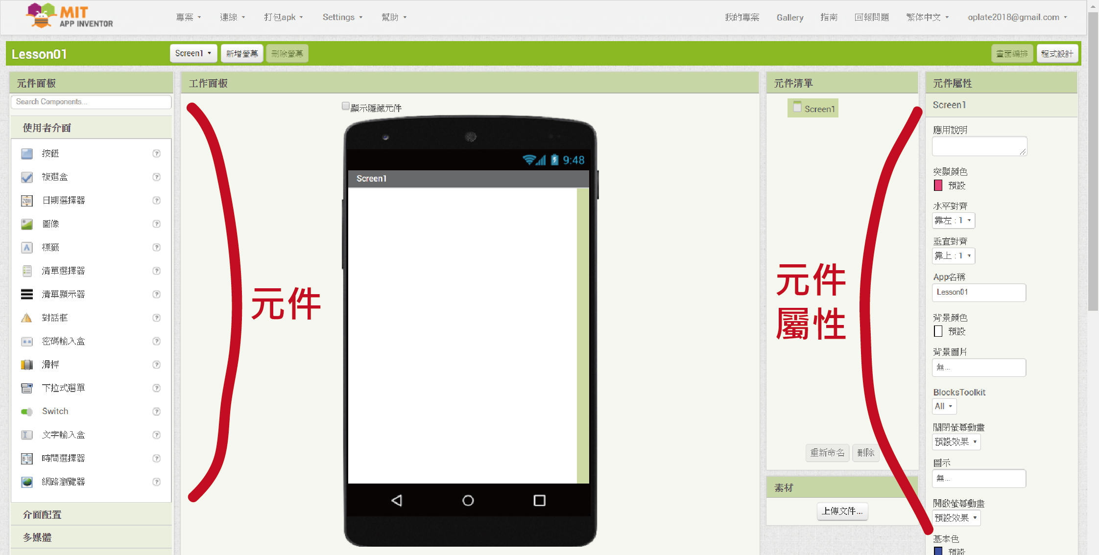 中間手機圖案是設計使用者介面的地方,可以直接把左邊「元件面板」內想要的元件拉進手機中。