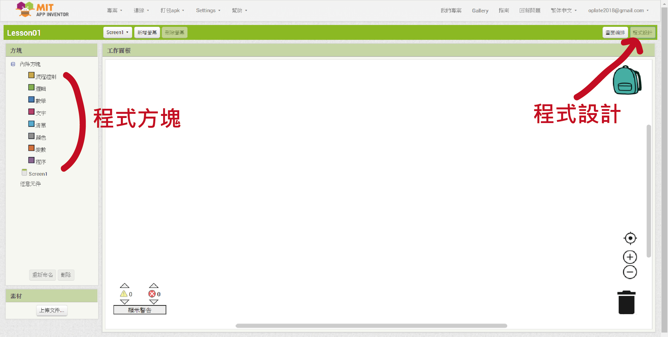 10. 簡單來說,我們app的製作流程就是在「畫面編排」的地方放置好各個元件,再進入「程式設計」的地方把元件的功能加上去就完成了。