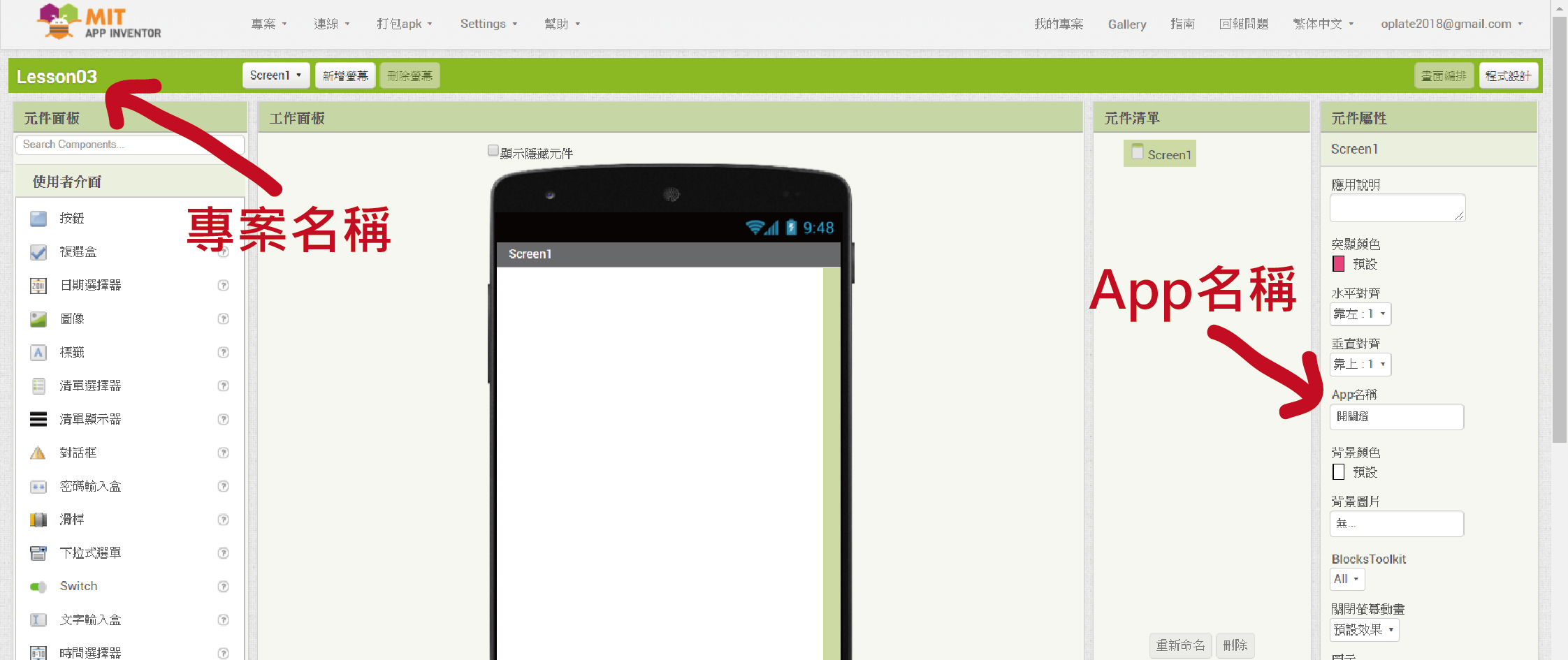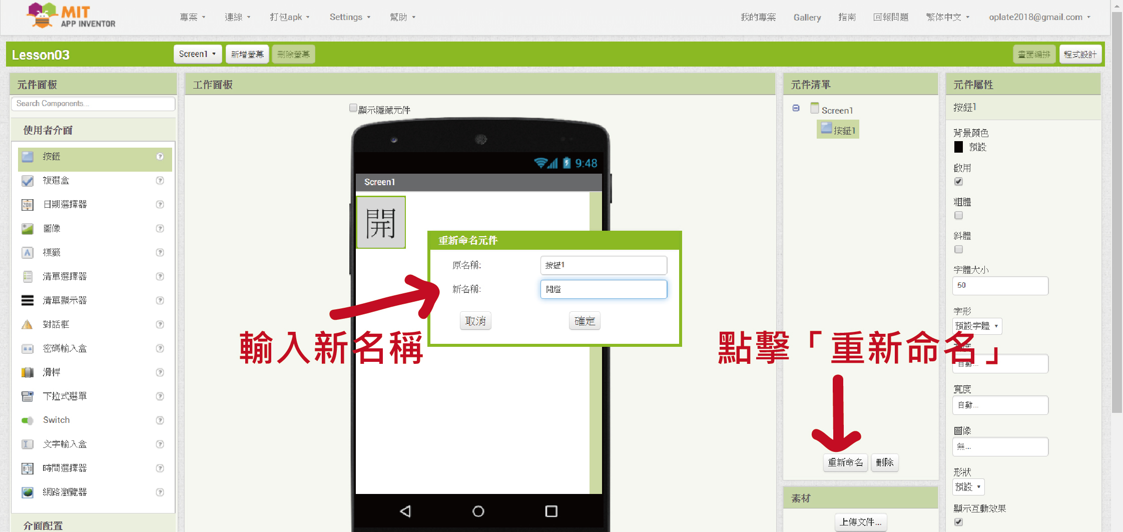 4. 然後點擊「元件清單」下方的「重新命名」,將「按鈕1」換成新名稱「開燈」。