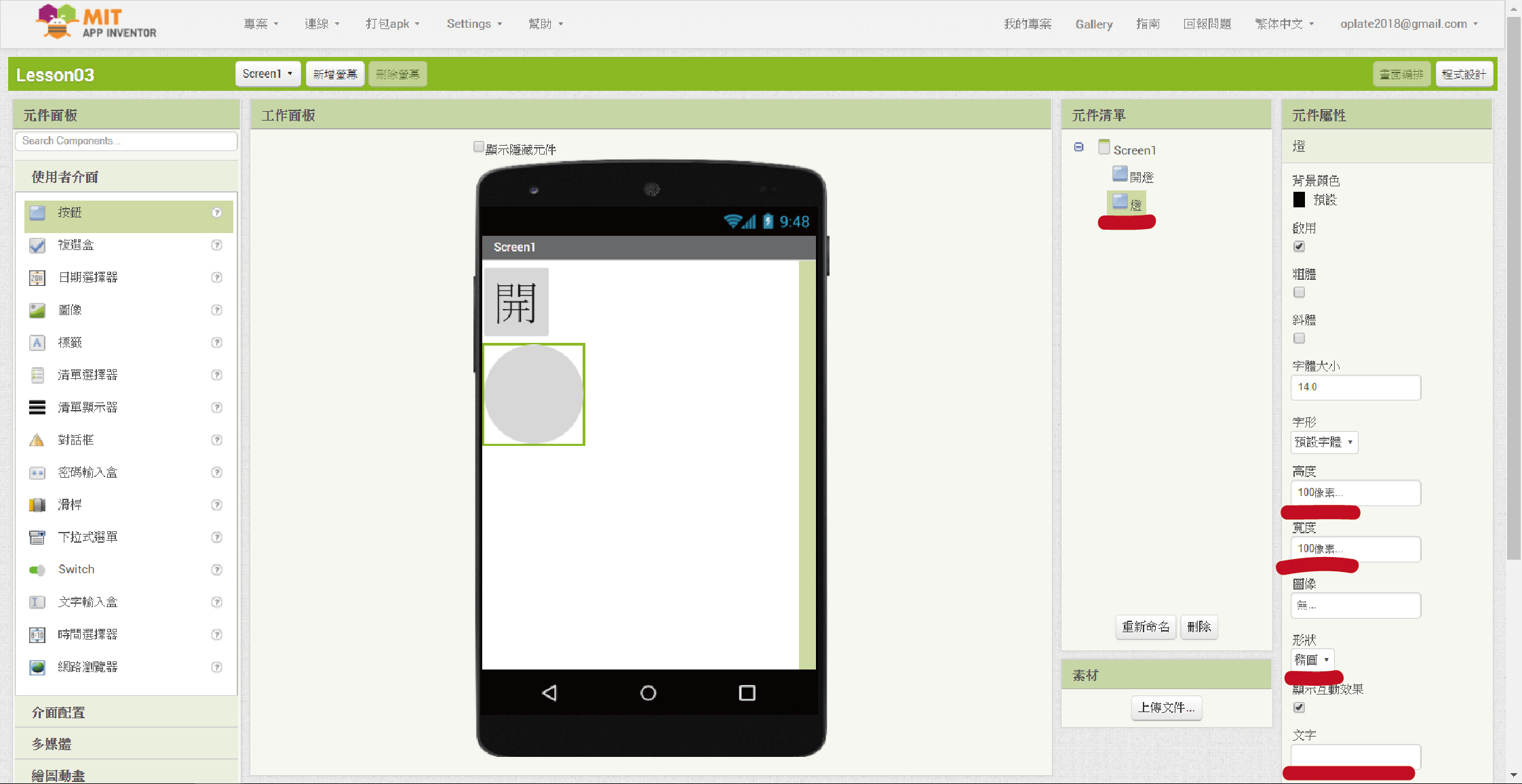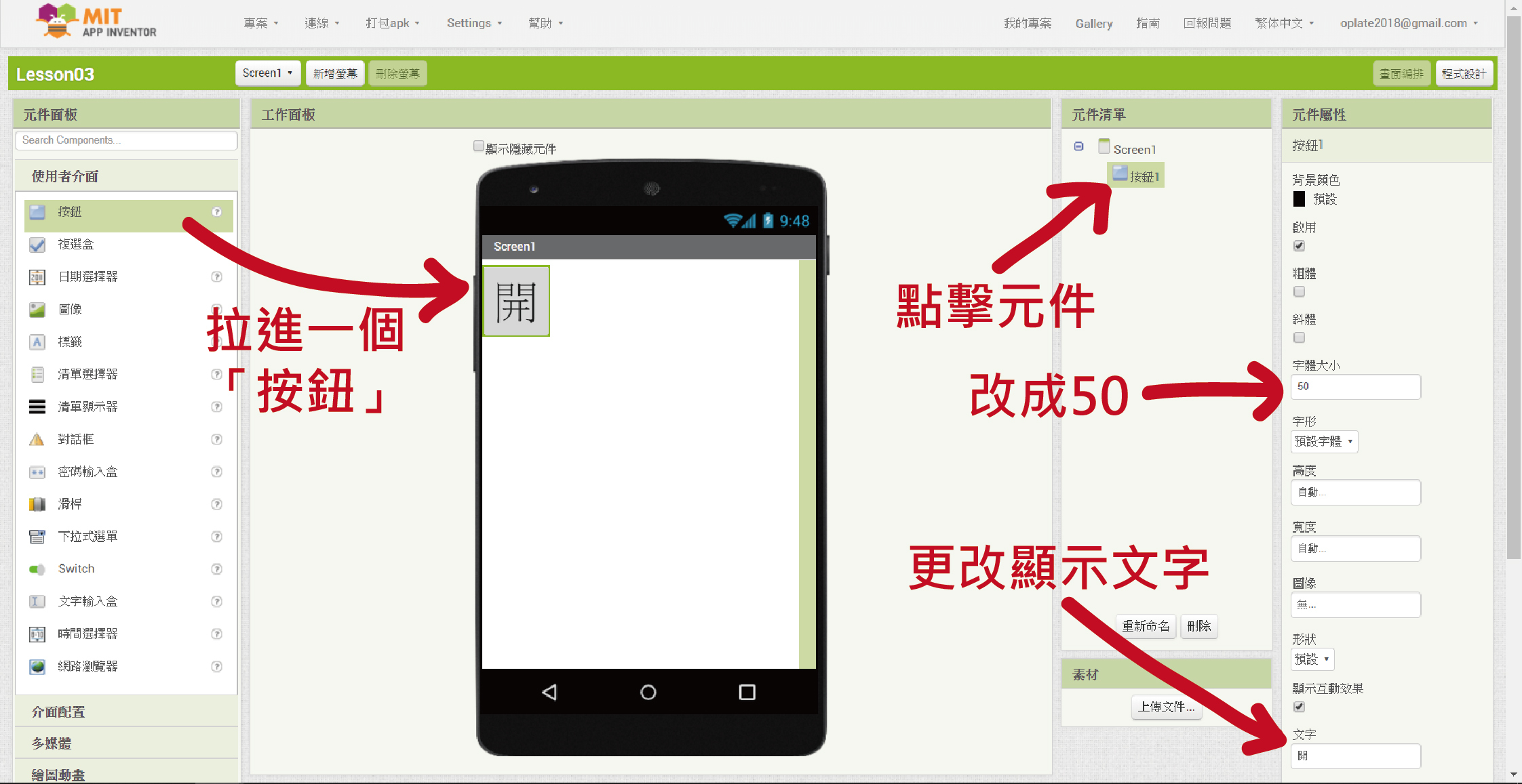 我們先將按鈕在畫面中顯示的「文字」改成「開」。
