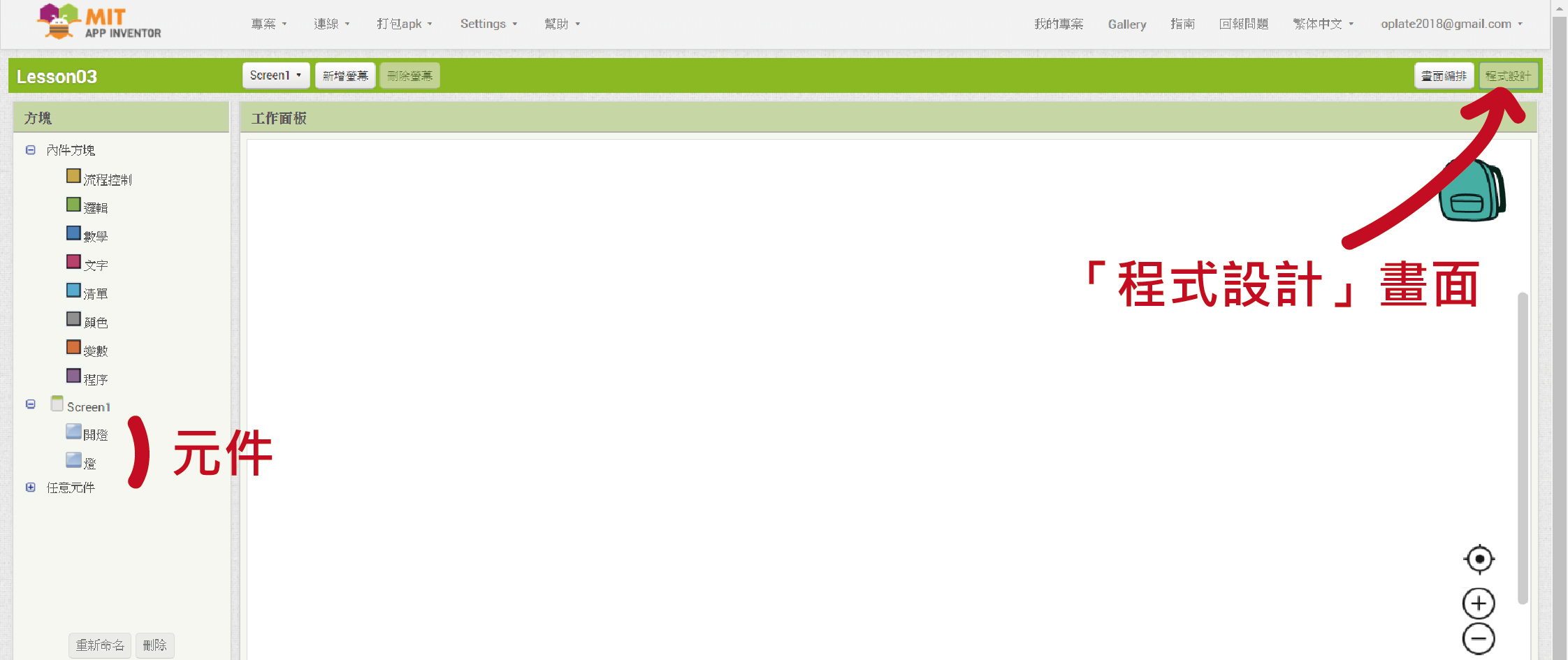 7. 當點擊元件時,會出現可使用的「程式方塊」,每個元件的「程式方塊」內容不太一樣。