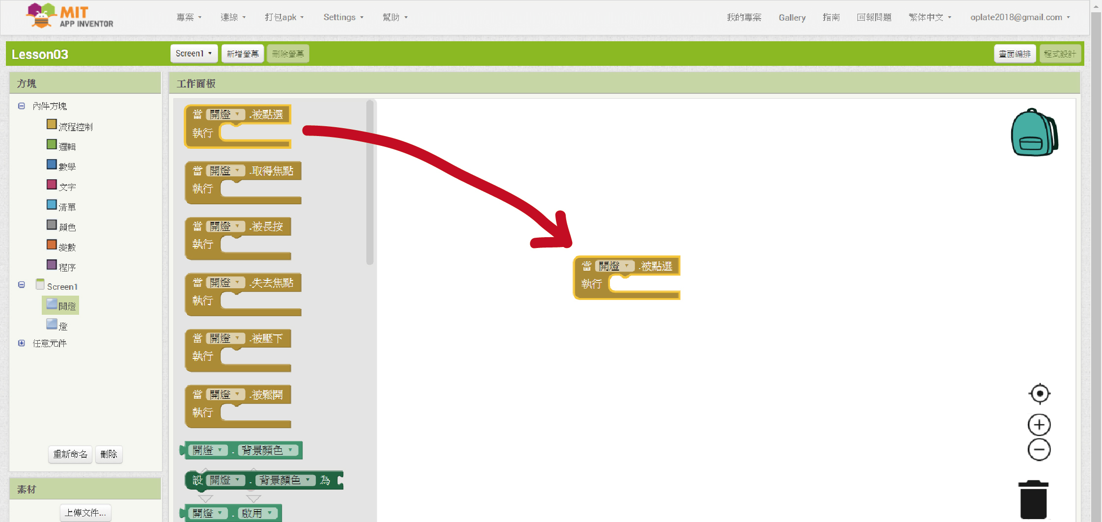 再放到「當"開燈" . 被點選 執行」的後方空位中。