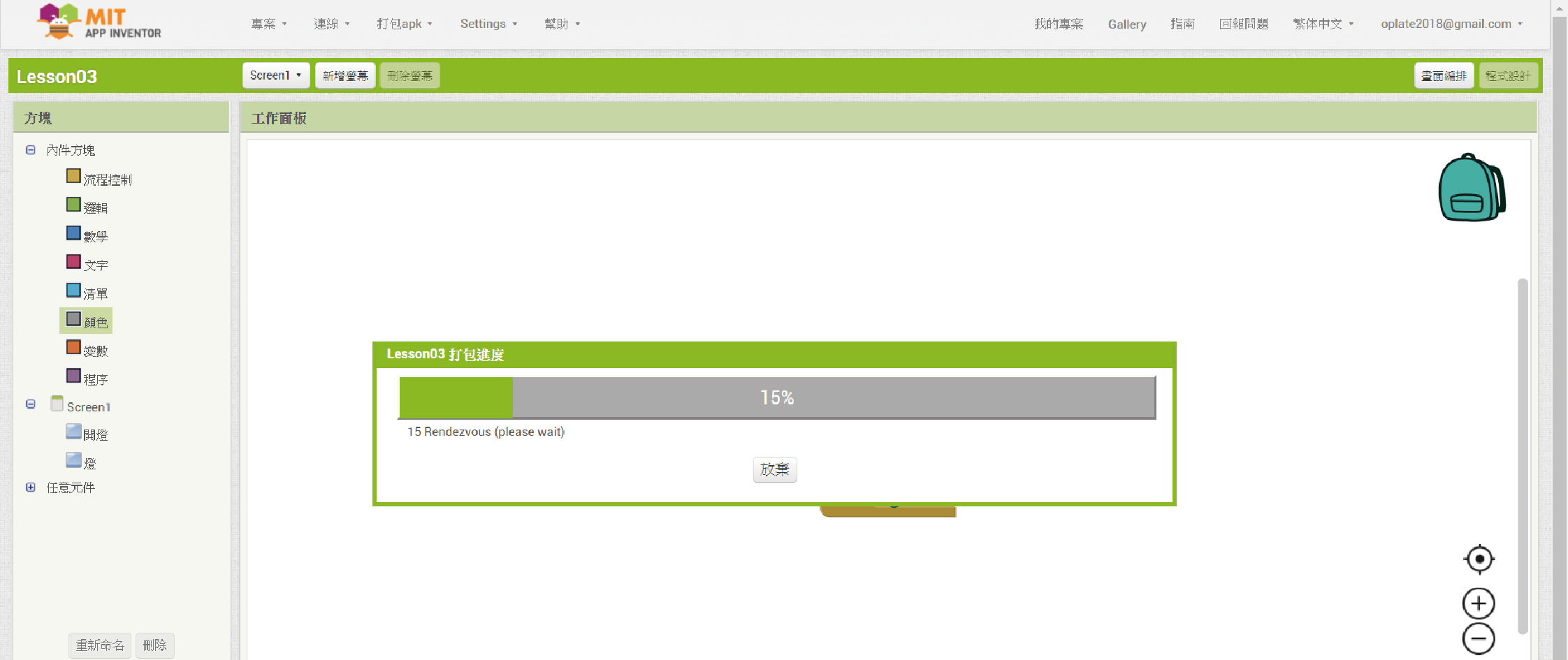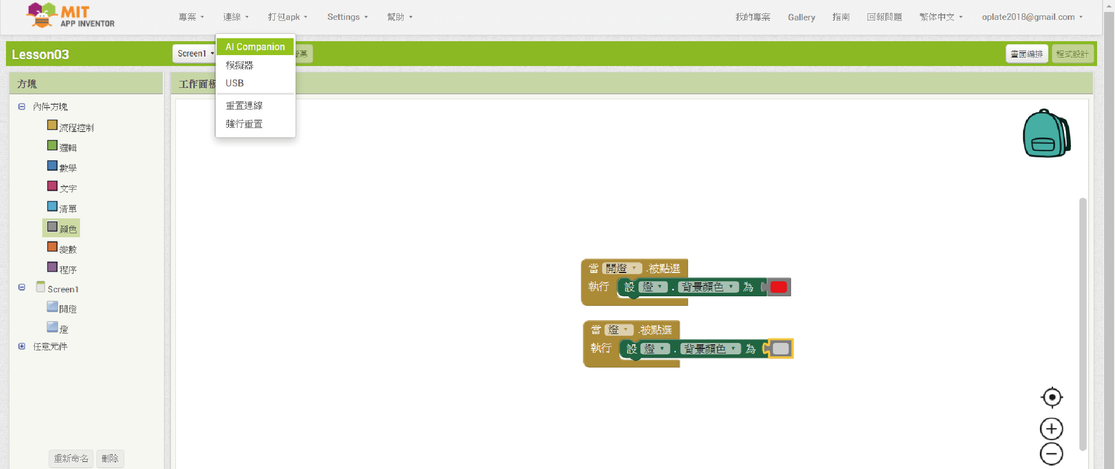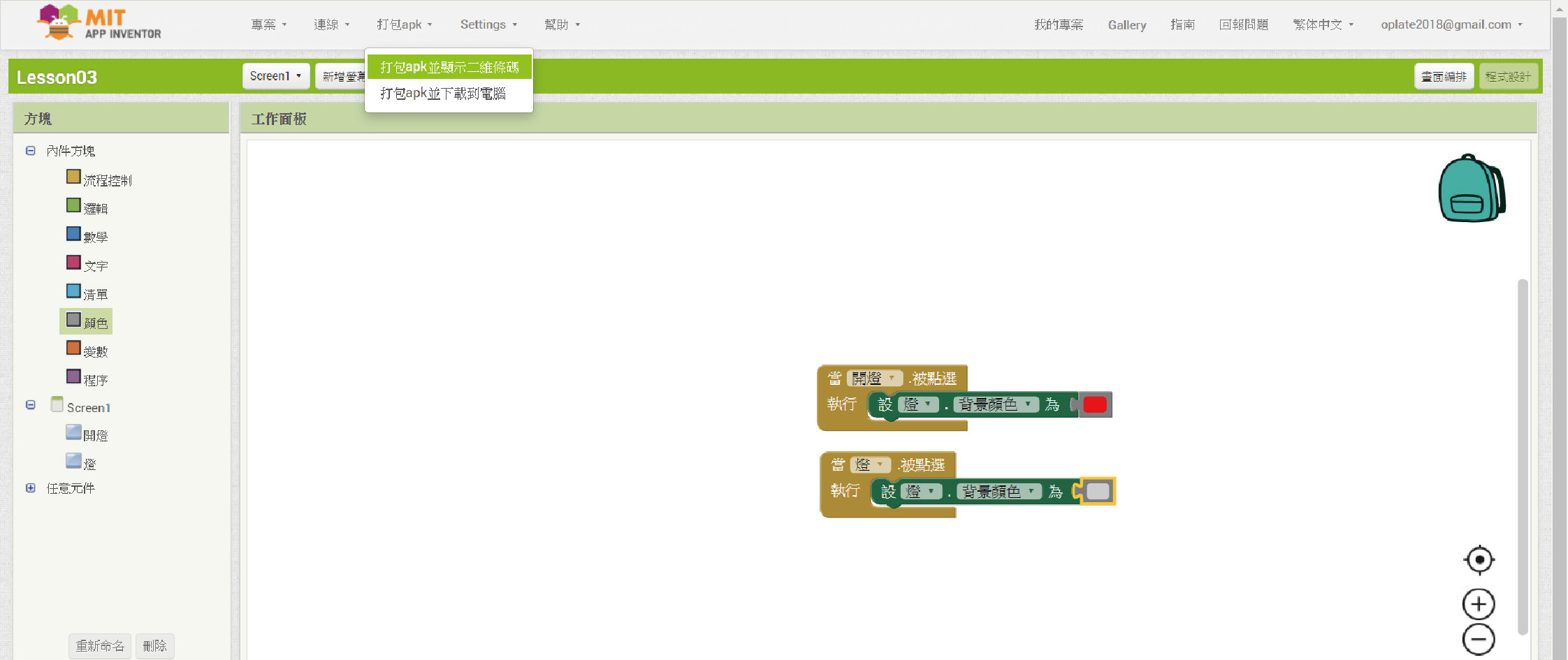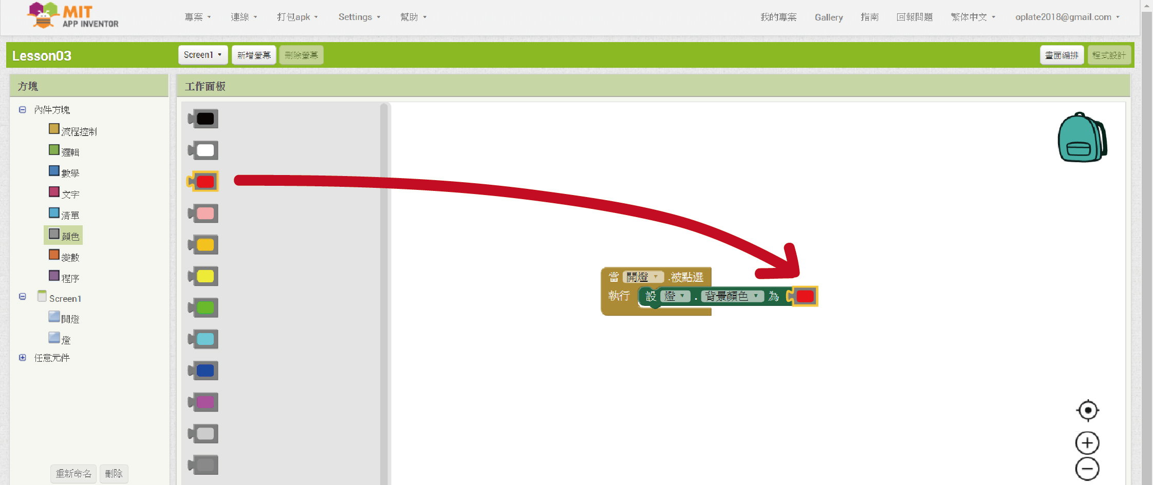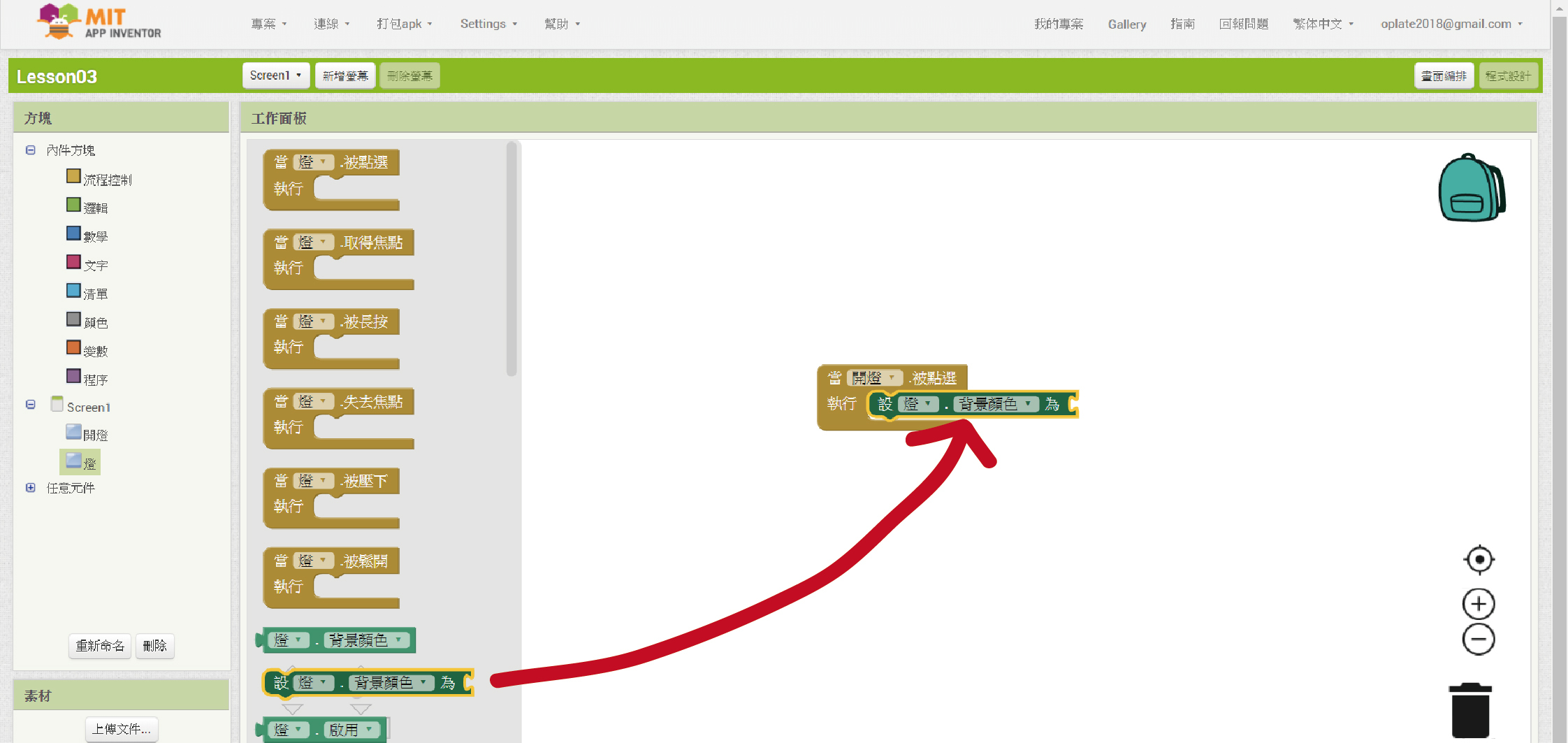 點擊元件「燈」打開「程式方塊」,將「設"燈" . "背景顏色"為」帶進畫面。