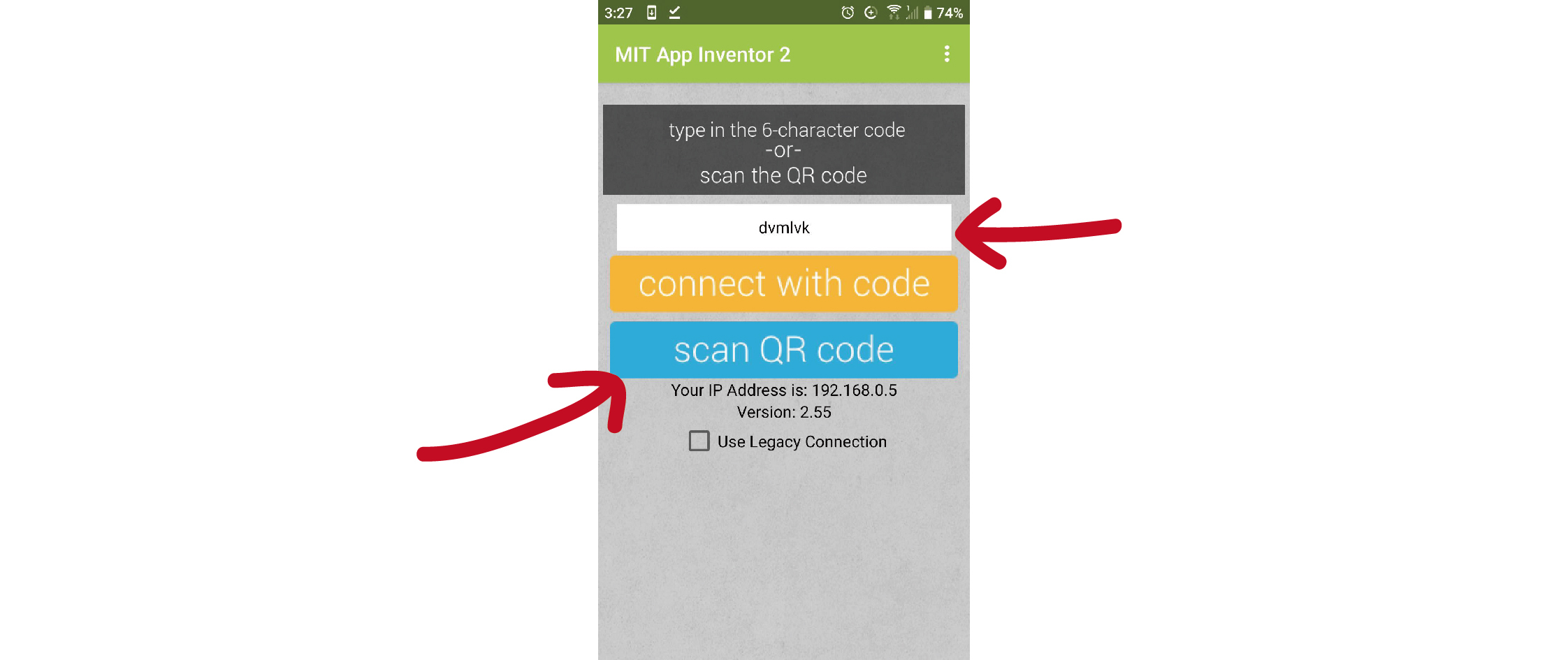13. 打開手機的「MIT AI2 Companion」,用「scan QR code」掃描QR Code或直接輸入六位編碼。