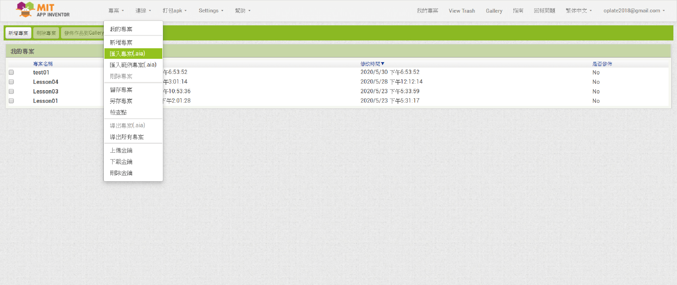 2. 在專案列表左上角「專案」裡點擊「匯入專案(.aia)」。