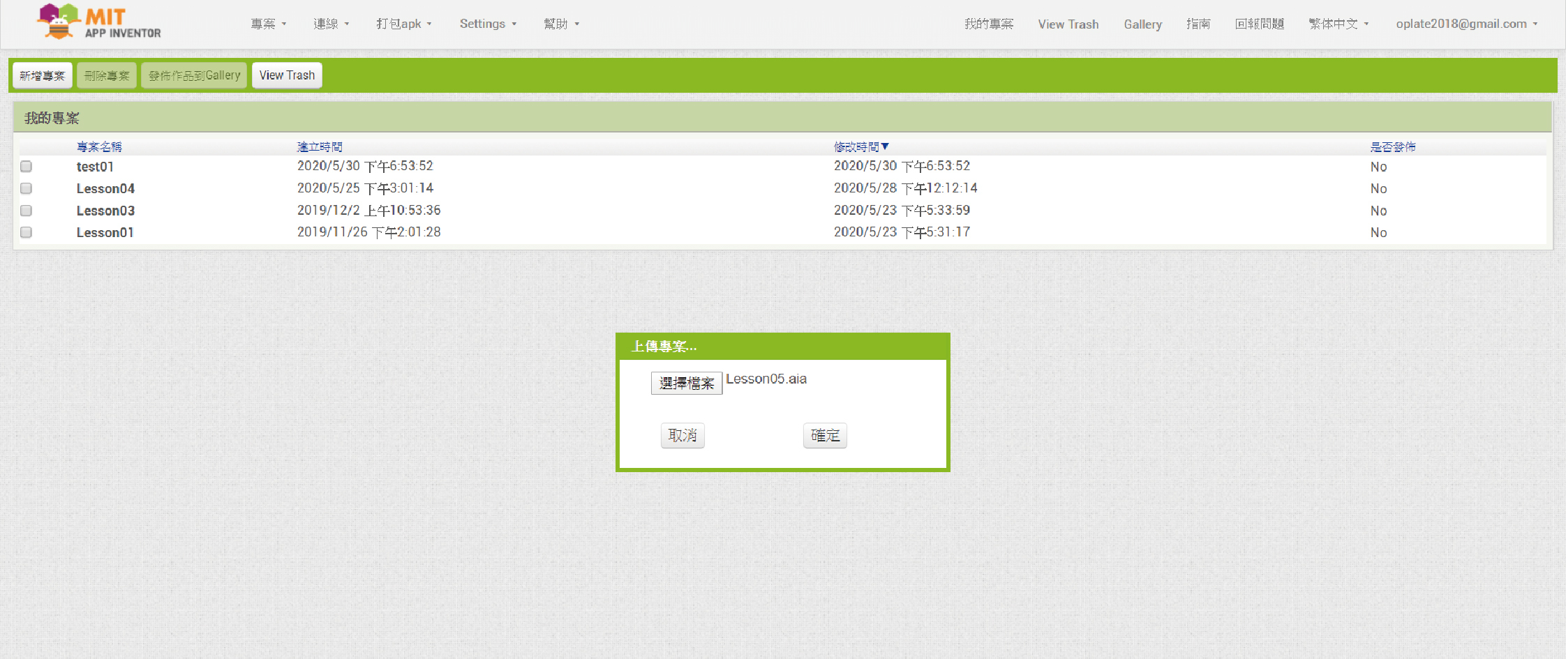 3. 選擇要匯入的專案(這裡是Lesson05.aia),然後按「確定」。