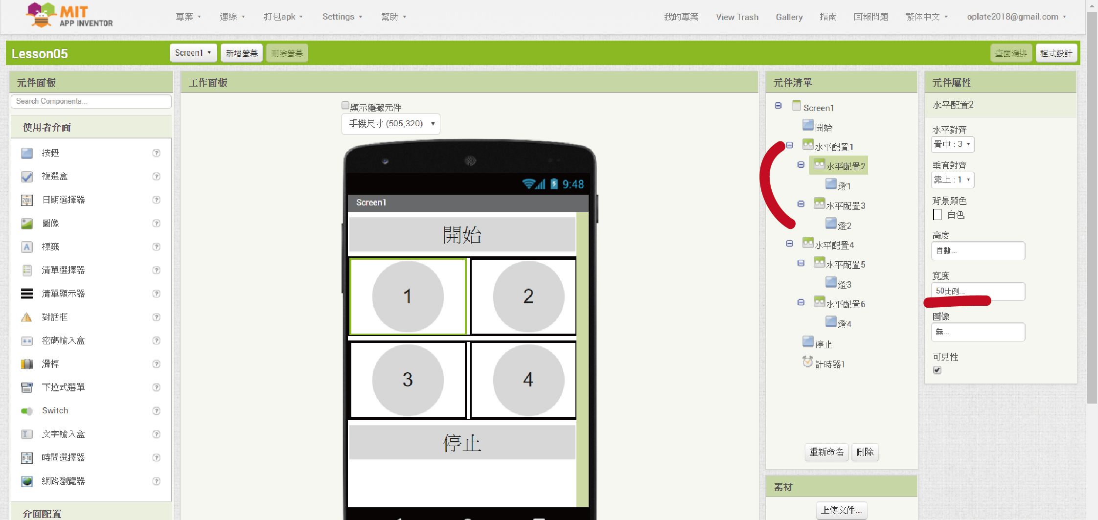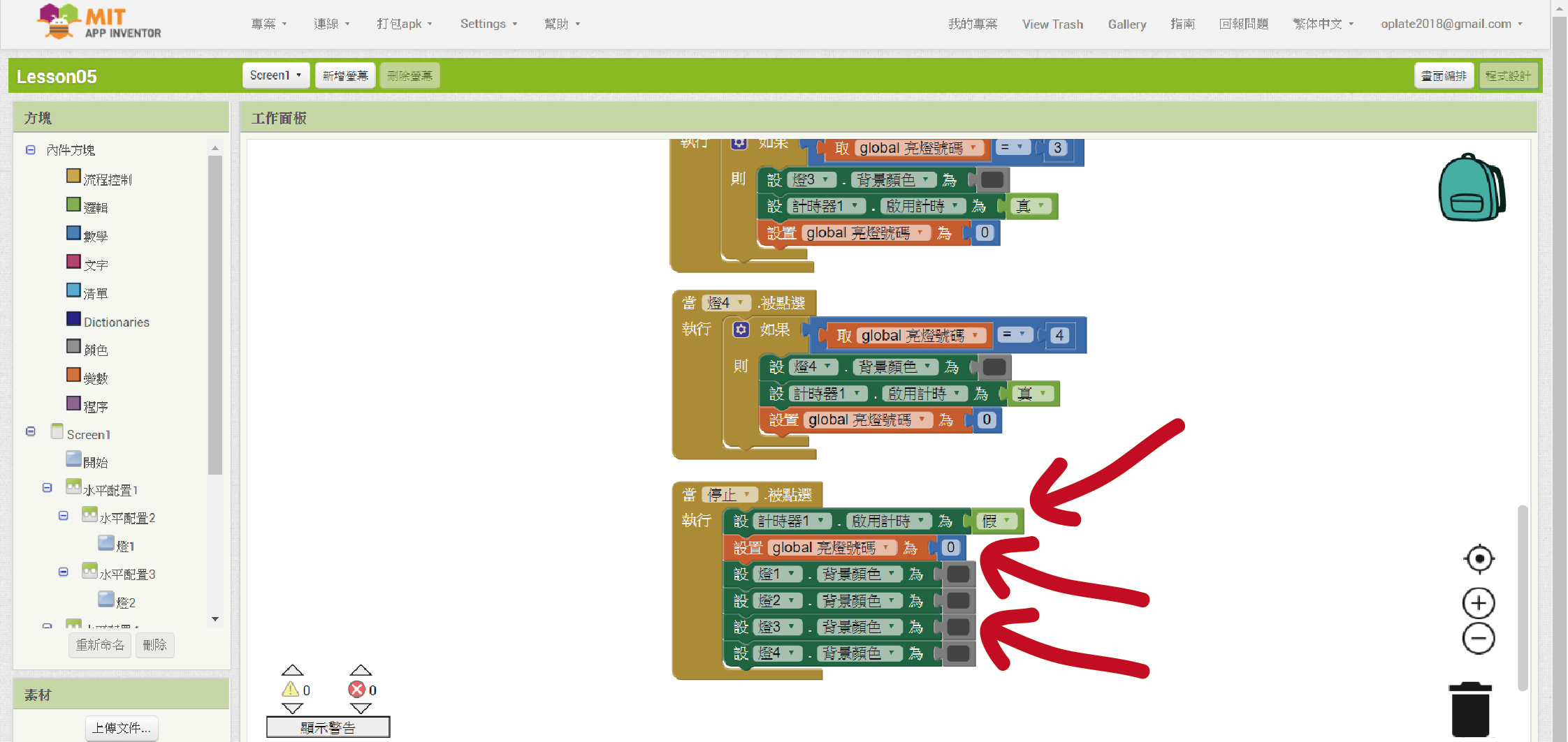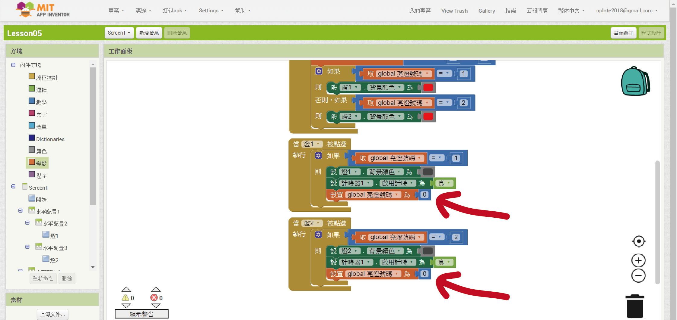 1. 參考解答檔案為Lesson05(.aia檔),下載匯入後可以看到Lesson05的「畫面編排」和「程式設計」內容,和自己做的比較看看有什麼差別吧!