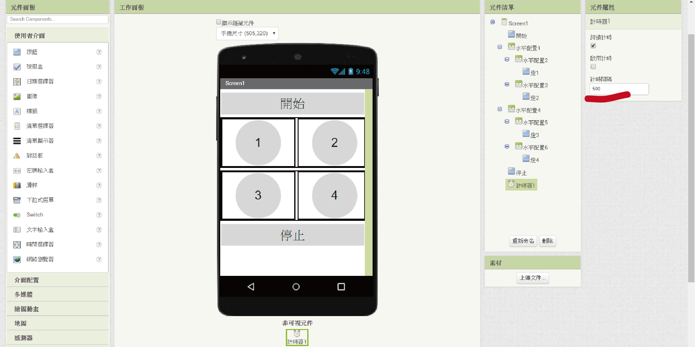 意思就是當「設”計時器1” . “啟用計時”為」「真」的時候,「計時器1」就會開始計時,要經過一秒後(我們的「計時間隔」設定為一秒)才會開始隨機選擇一個燈亮起。