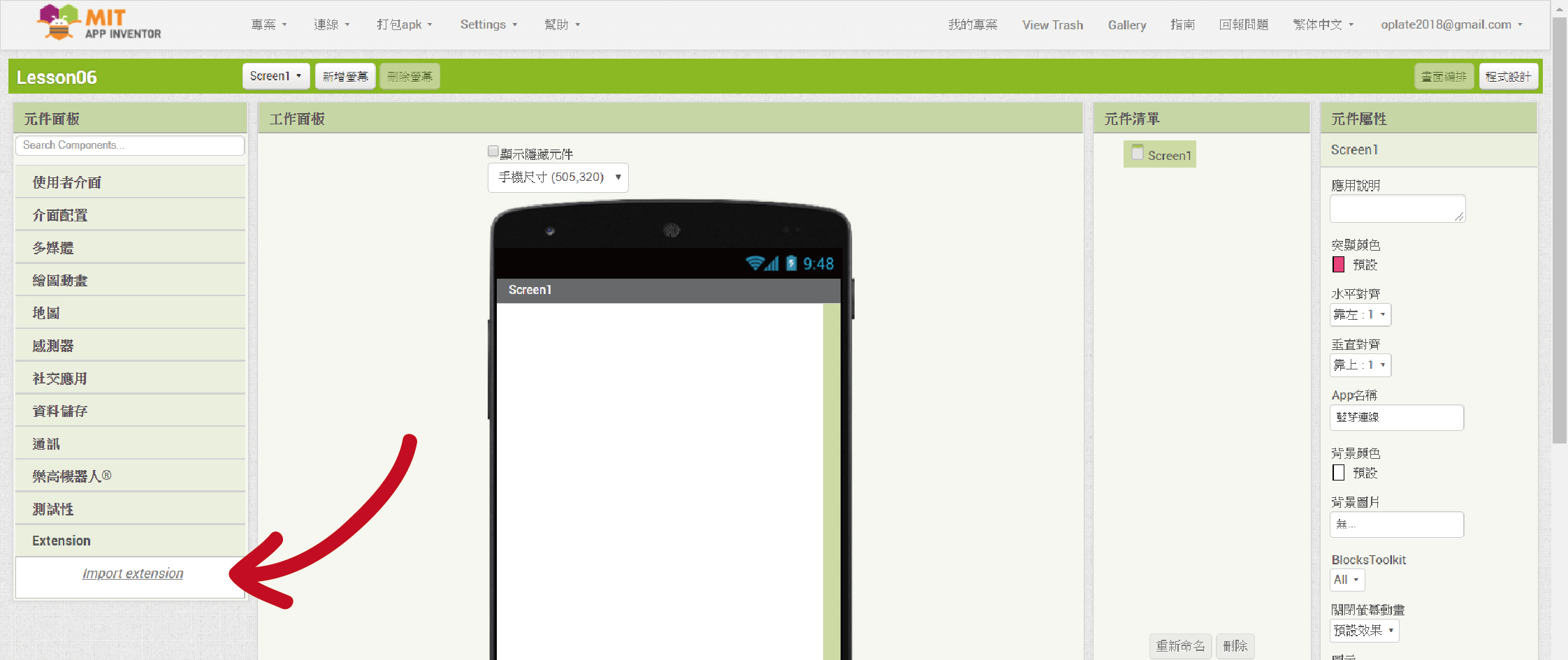 左方「元件面板」中有「Extension」擴充元件,點擊「Import extension」匯入擴充元件。