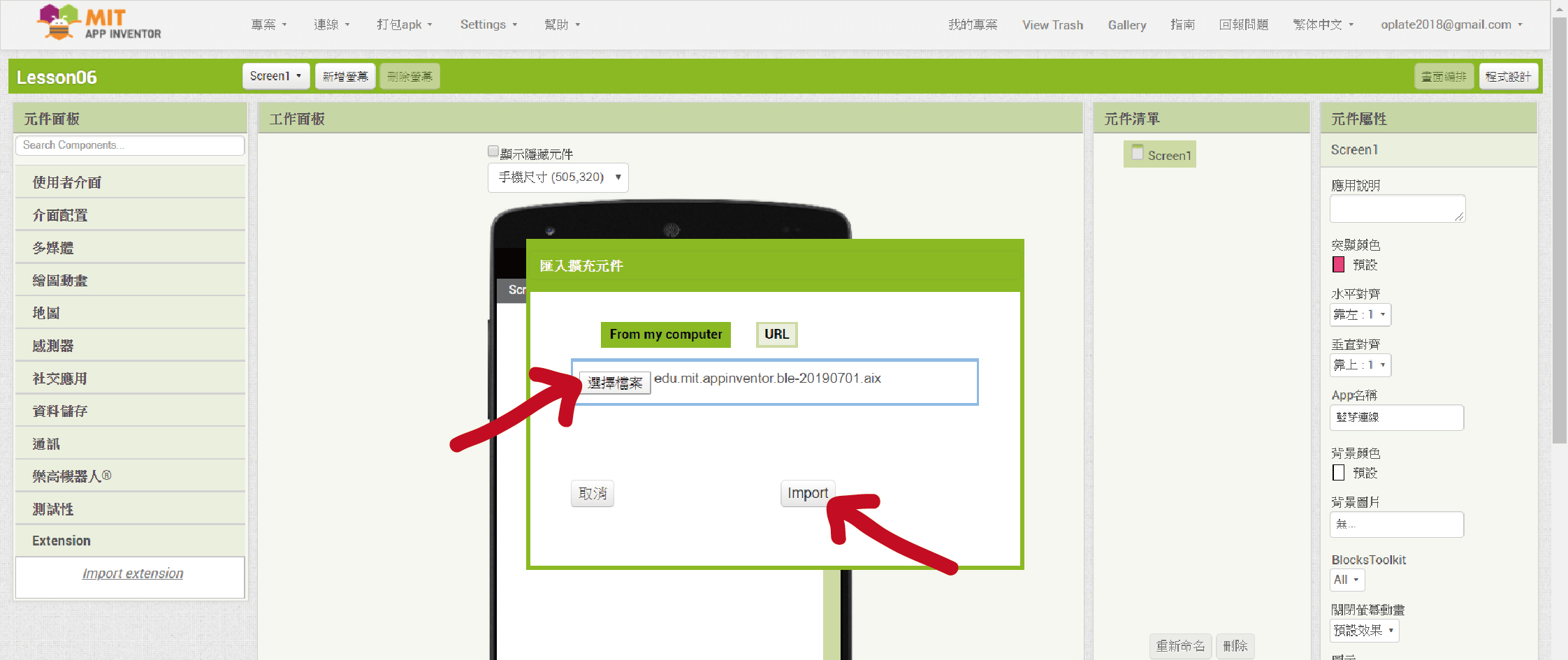 4. 點擊「選擇檔案」,選擇下載的BLE擴充元件,再按「Import」。