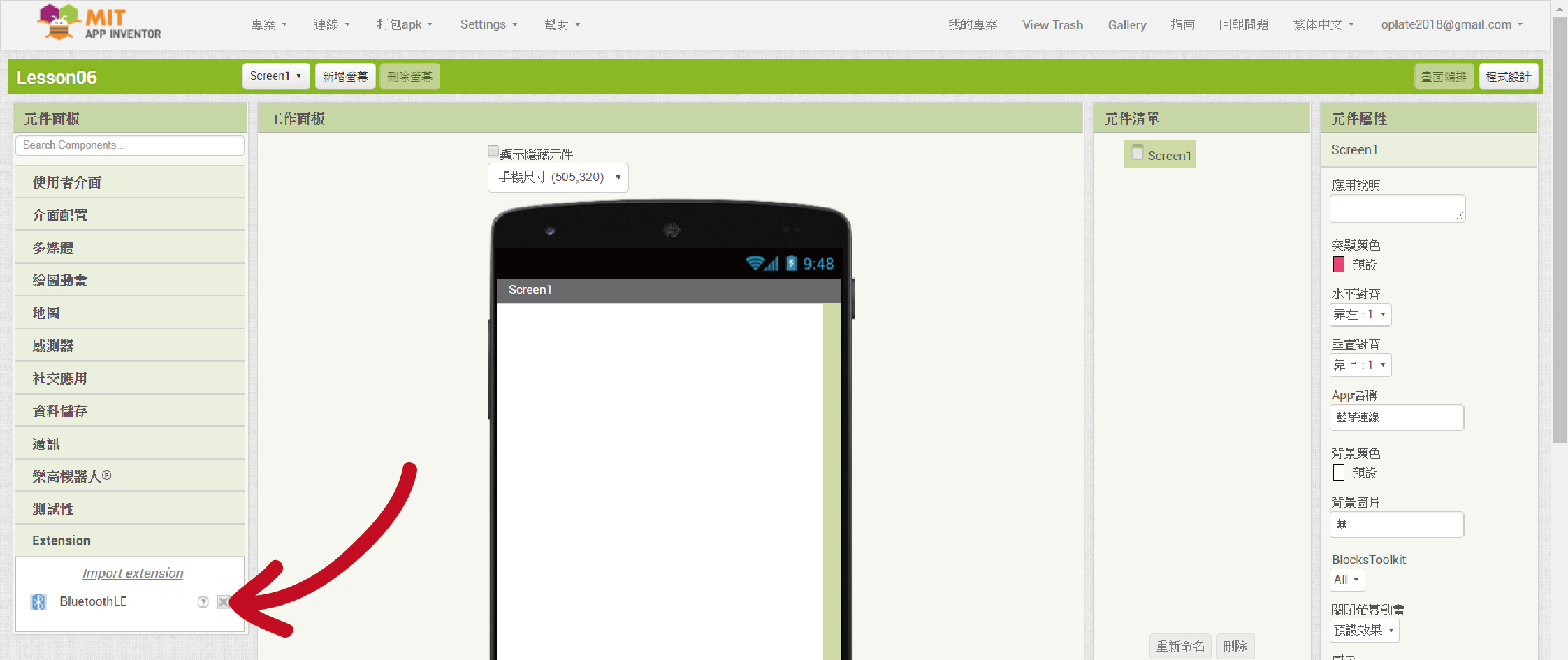 5. 然後在「Extension」裡就會出現「BluetoothLE」擴充元件了。