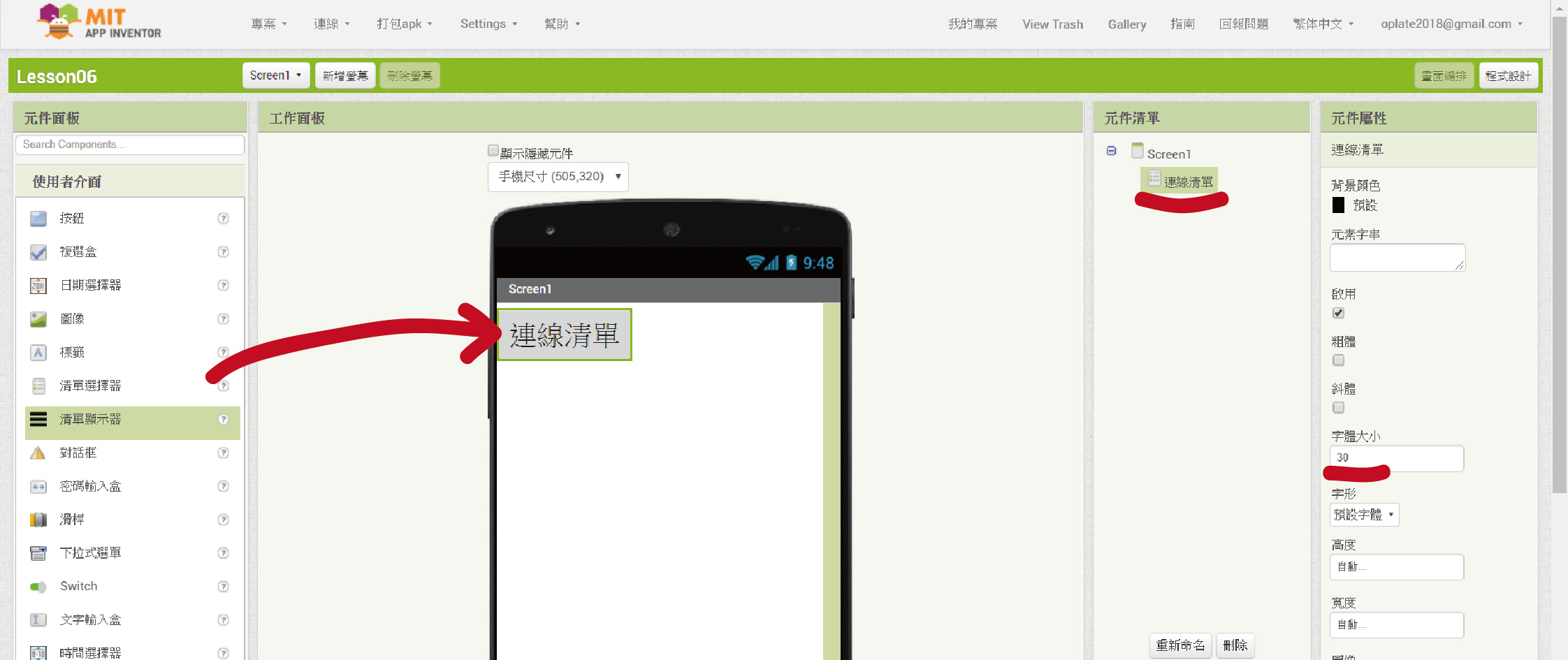 將「元件屬性」裡的「文字」和元件名稱都改為「連線清單」。