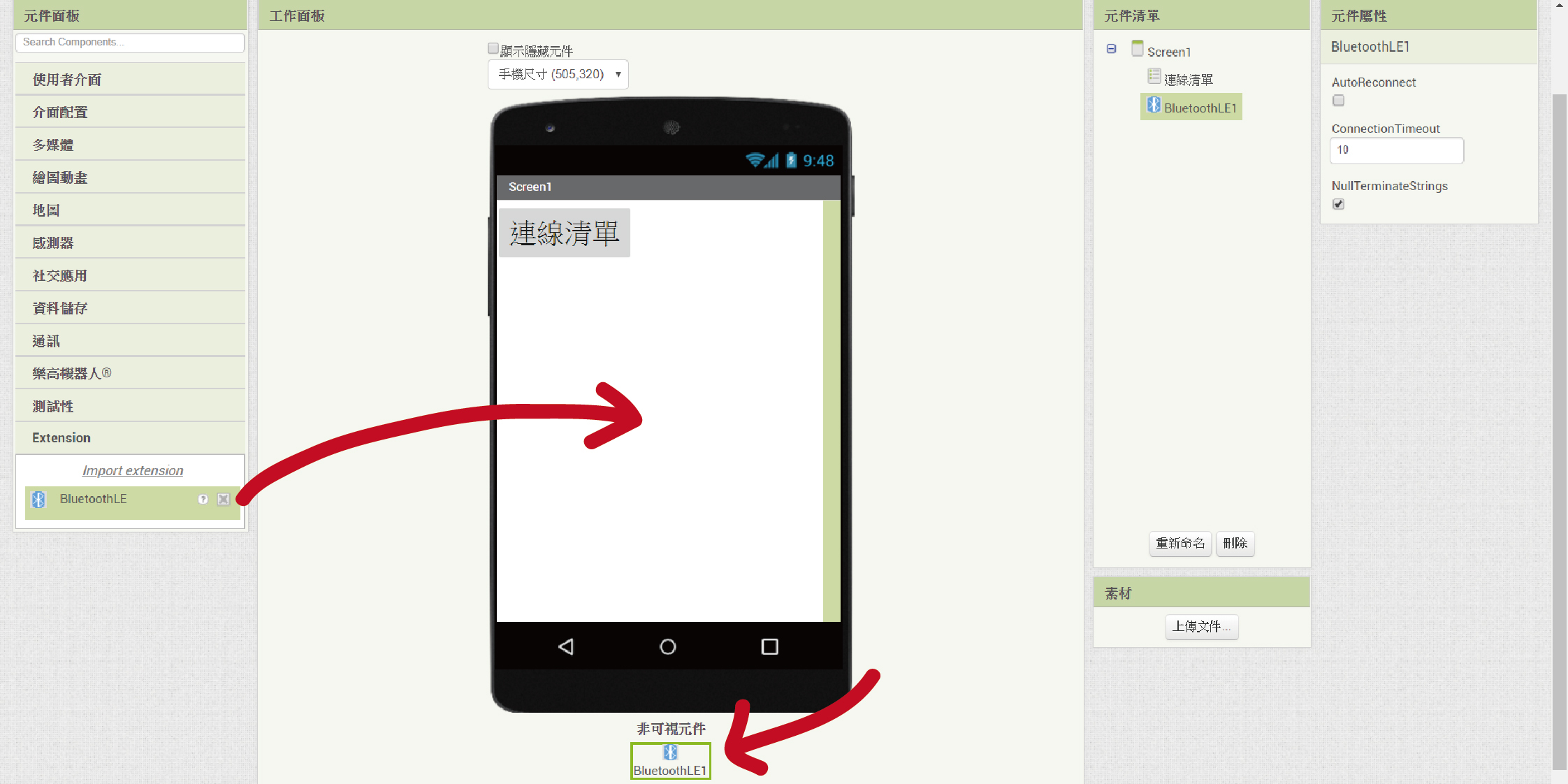 「BluetoothLE」擴充元件跟「計時器」一樣都是非可視元件。