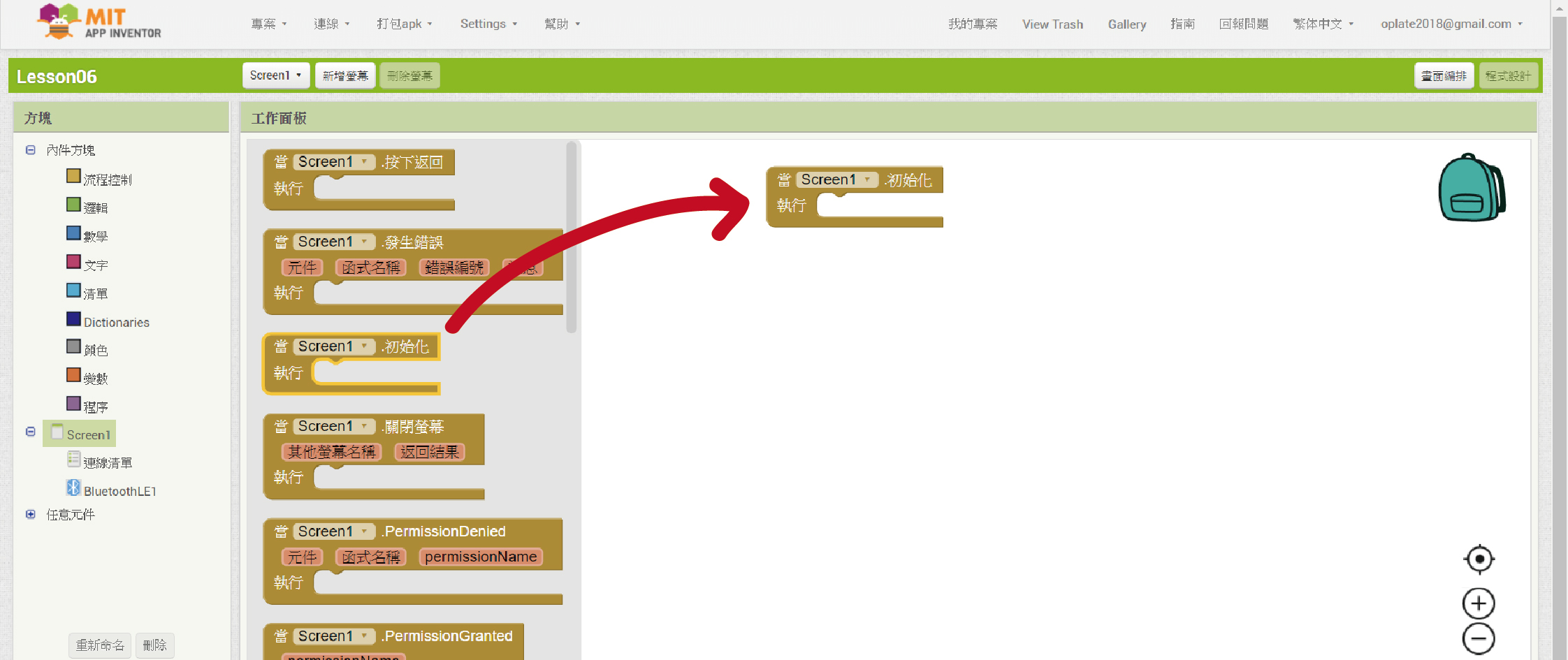 從「Screen1」裡拉進「當”Screen1”. 初始化 執行」程式方塊。