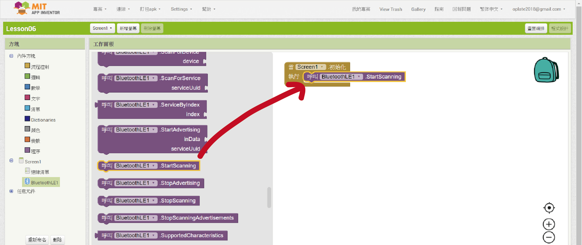 9. 從「BluetoothLE1」裡拉進「呼叫”BluetoothLE1”. StartScanning」程式方塊。