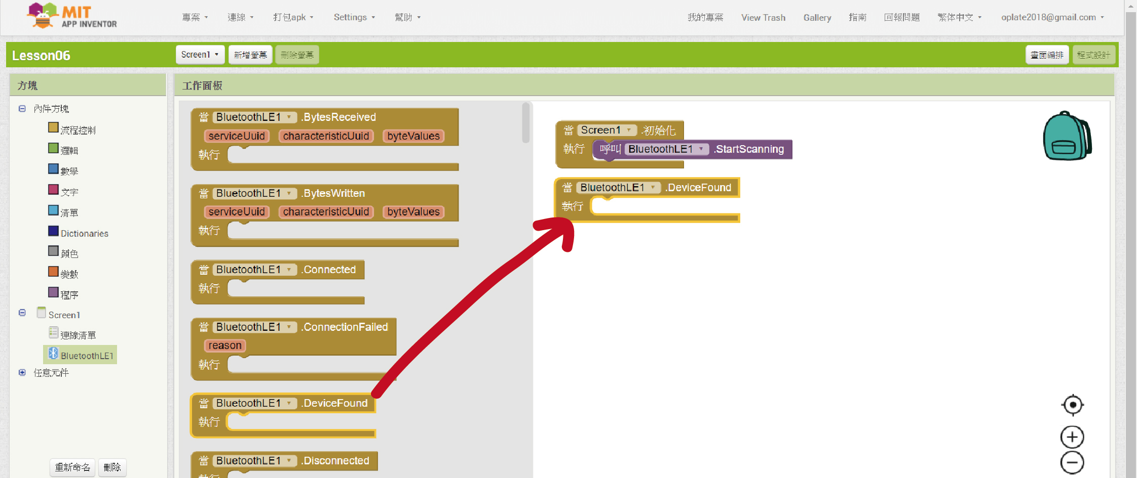 10. 從「BluetoothLE1」裡拉進「當”BluetoothLE1”. DeviceFound 執行」程式方塊。