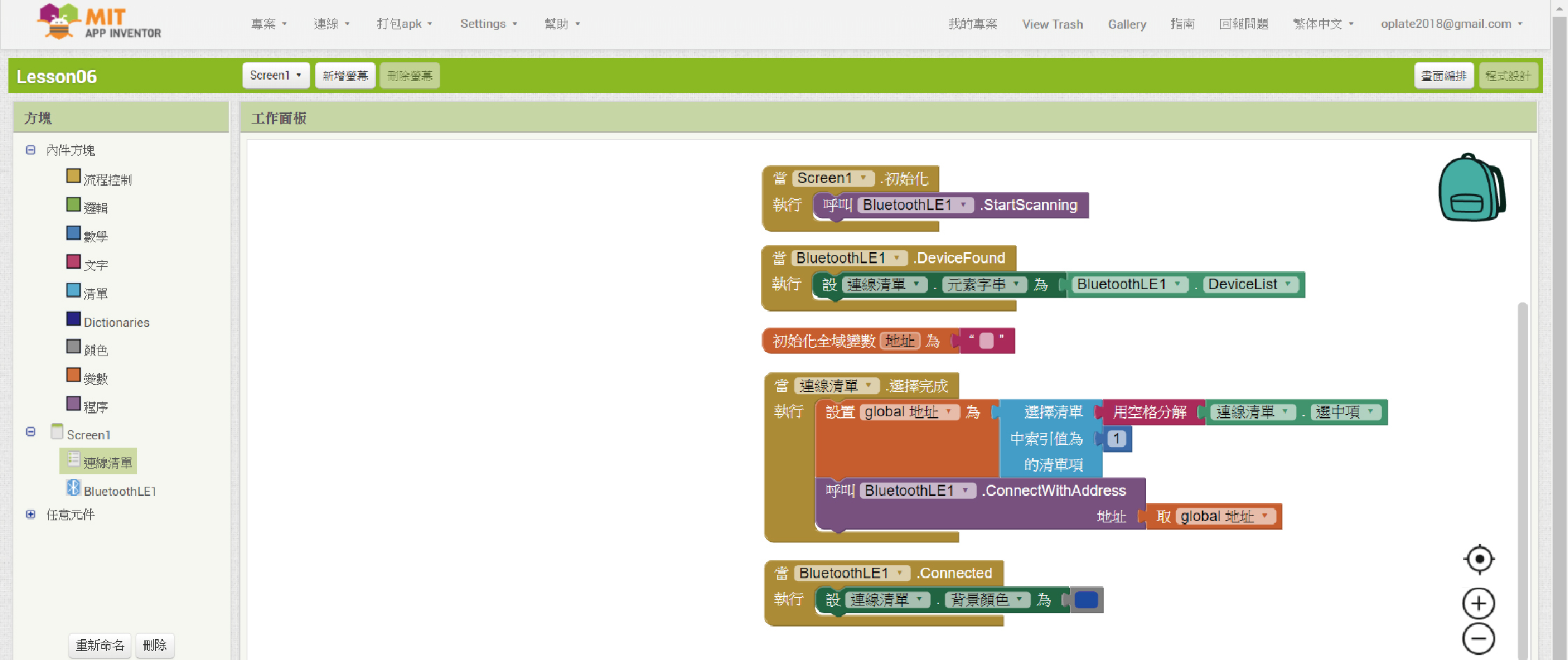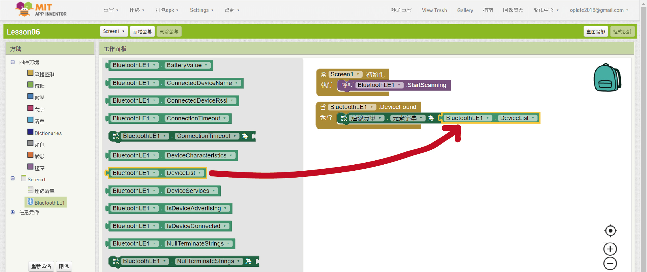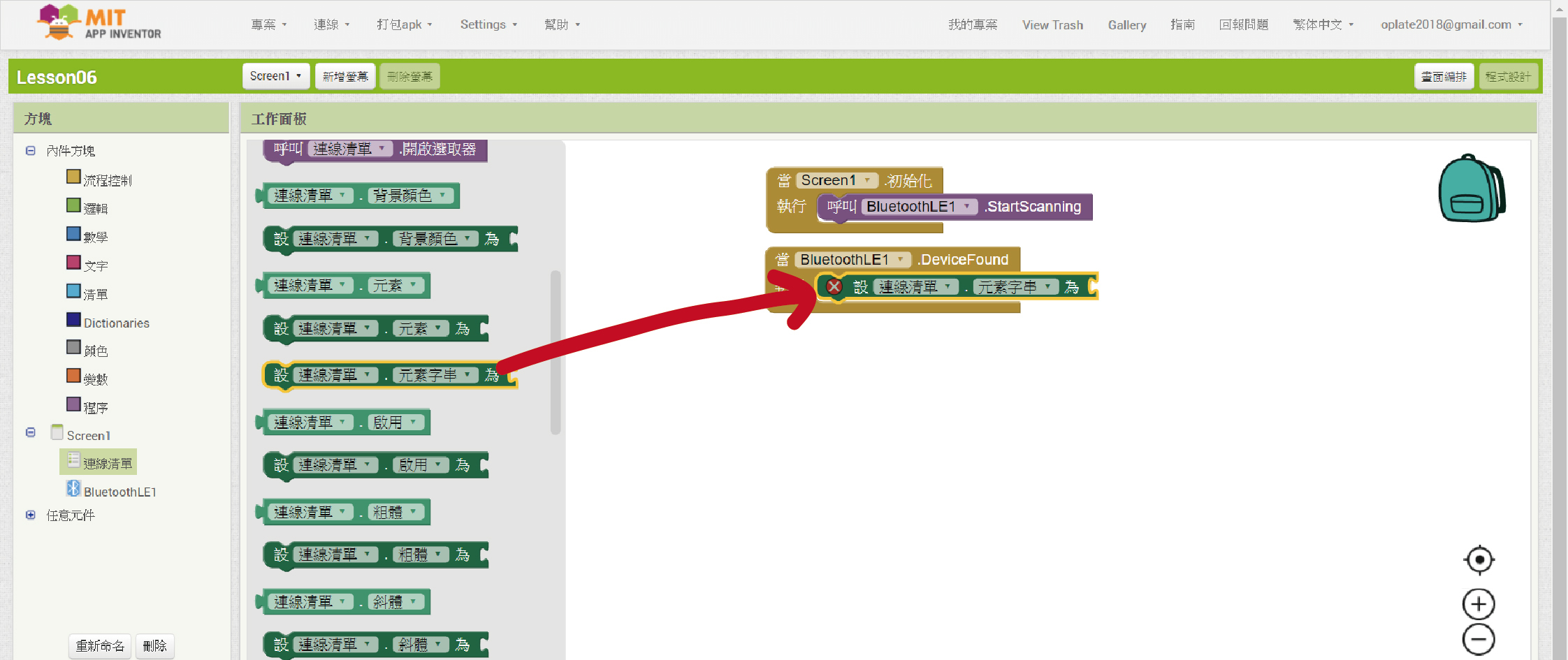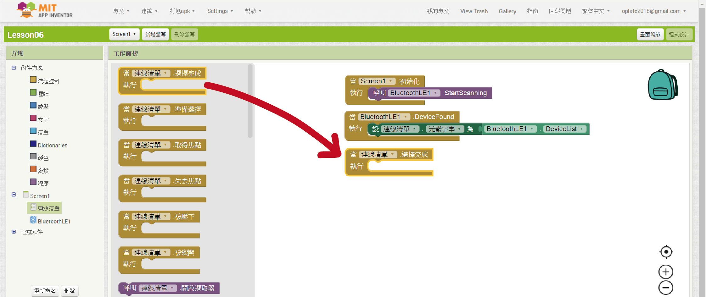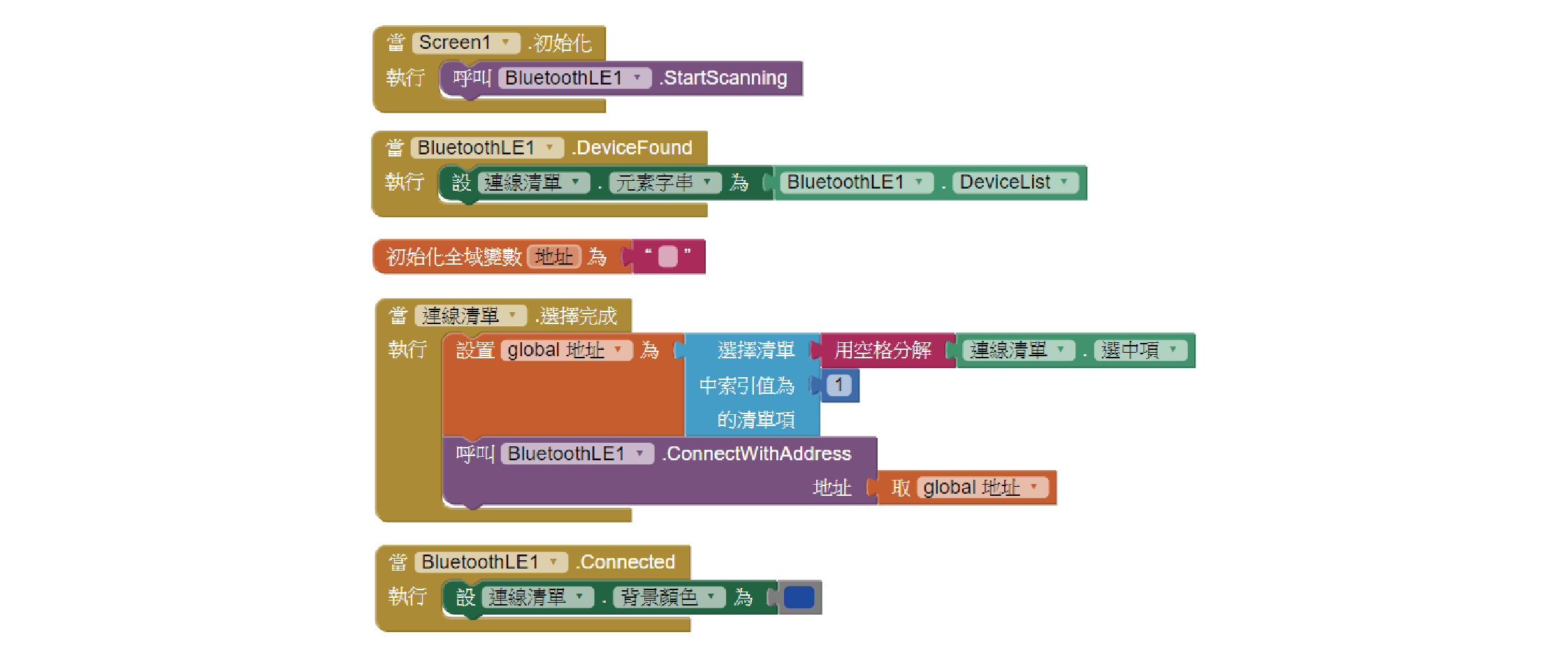 這段程式方塊組合是說,當元件「BluetoothLE1」找到周遭的藍芽設備後,清單選擇器元件「連線清單」就會將這些搜尋到的藍芽設備一一列出來。