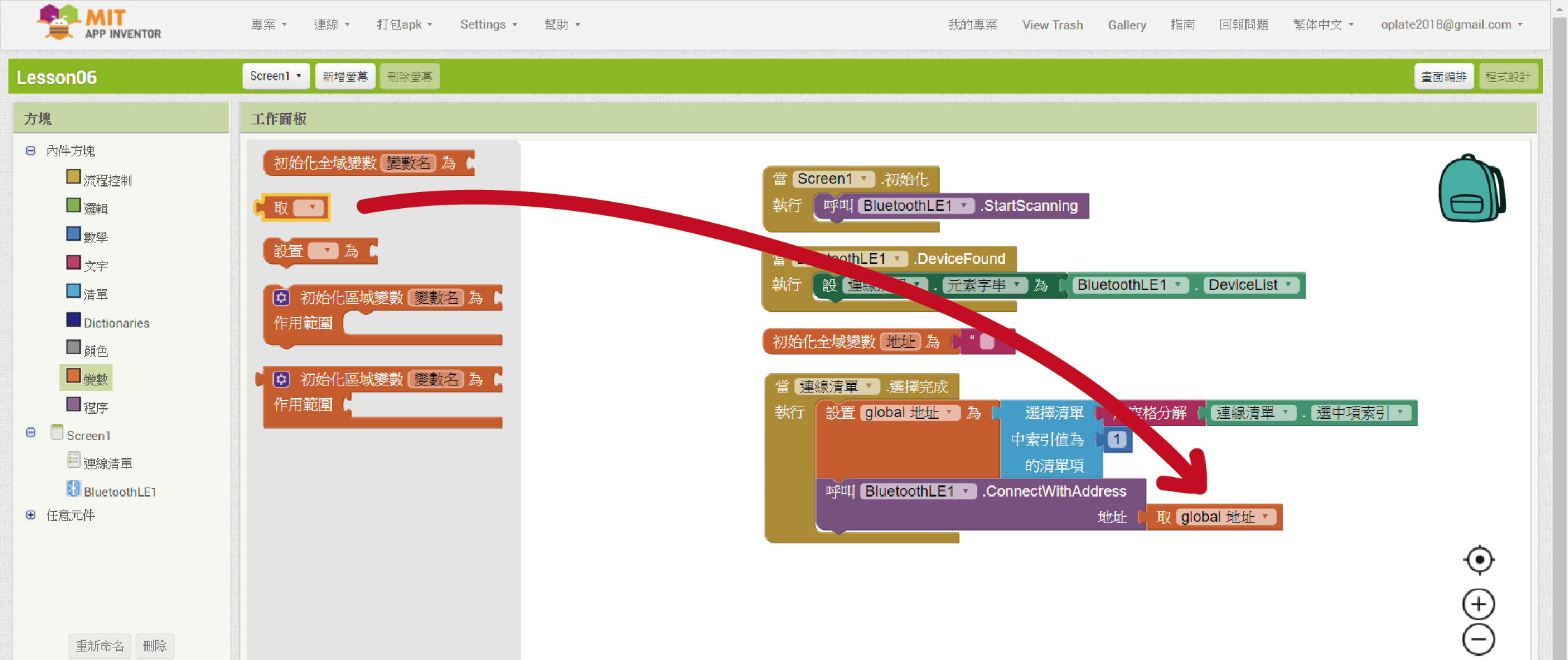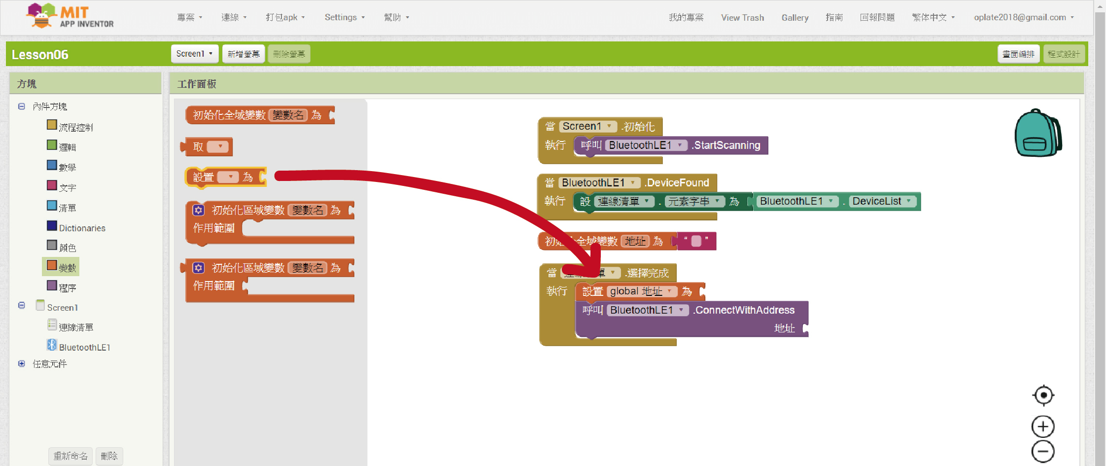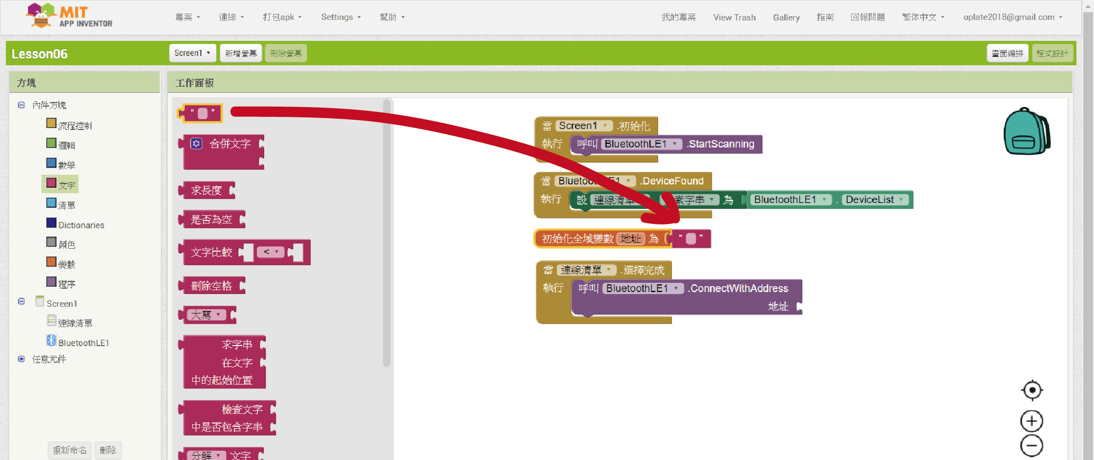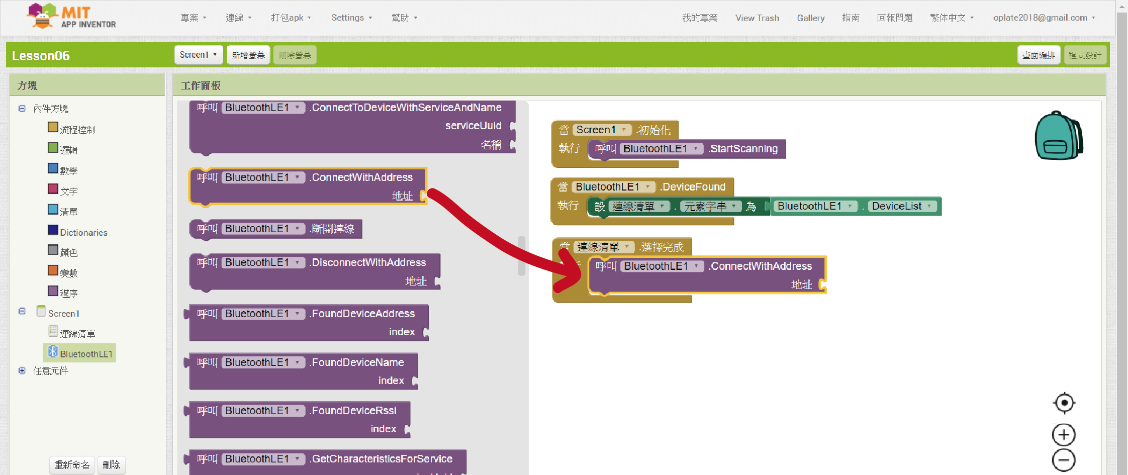 從「BluetoothLE1」裡拉進「呼叫”BluetoothLE1”. ConnectWithAddress 地址」程式方塊。