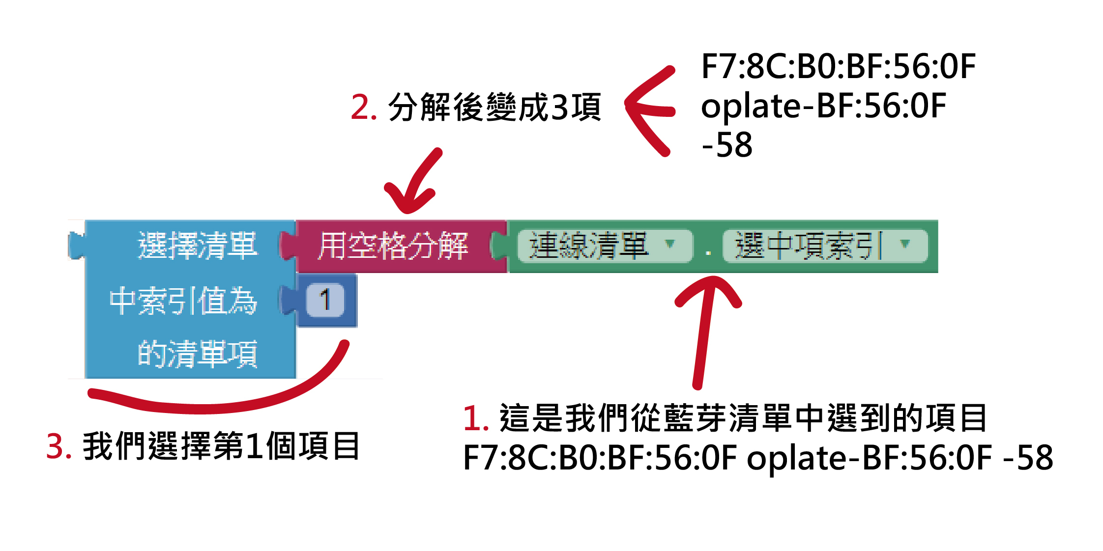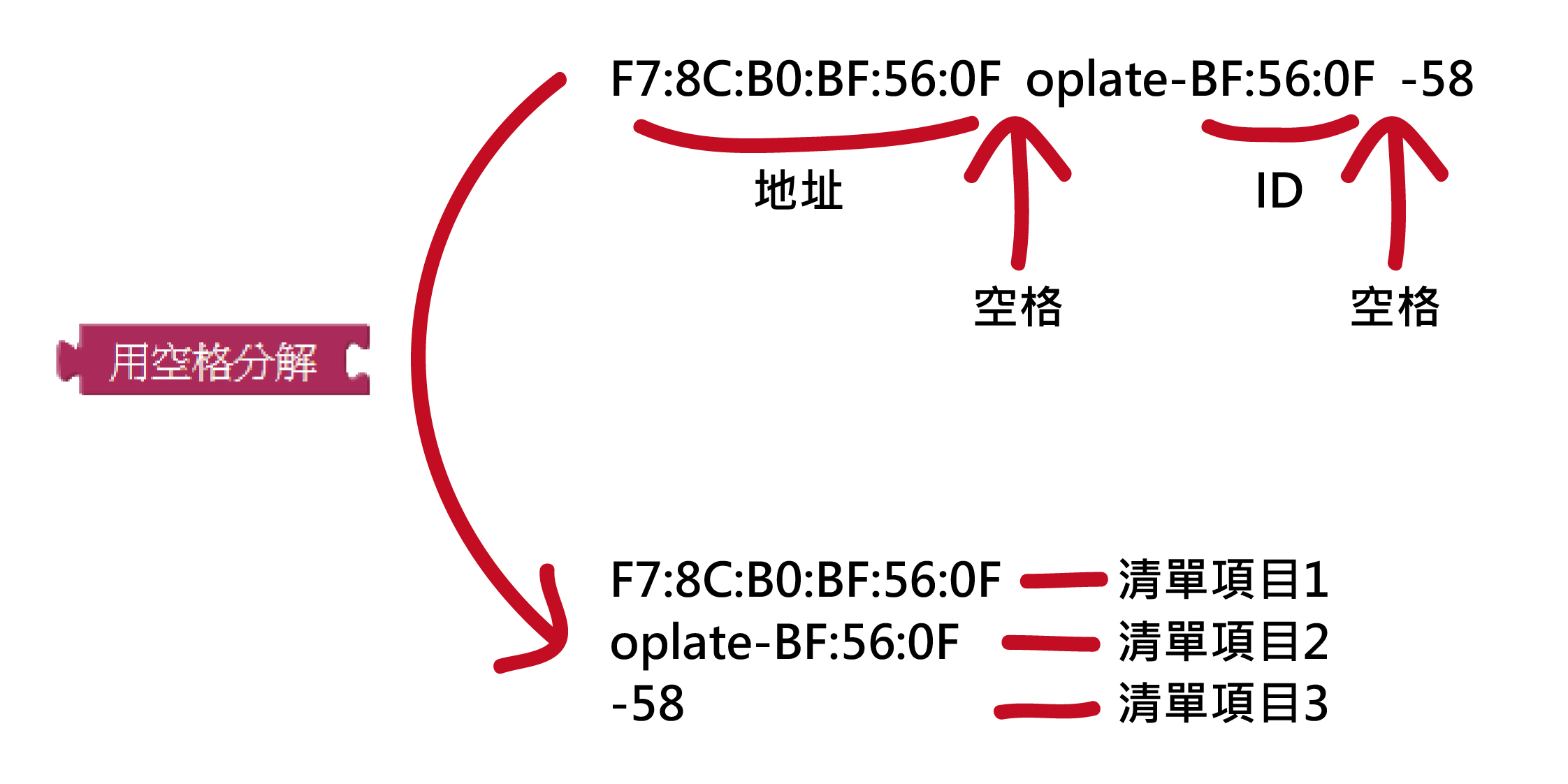 而「內件方塊」中「文字」裡的「用空格分解」程式方塊可以把一串文字用其中的空格去分開,並依序做成一個清單,如圖。