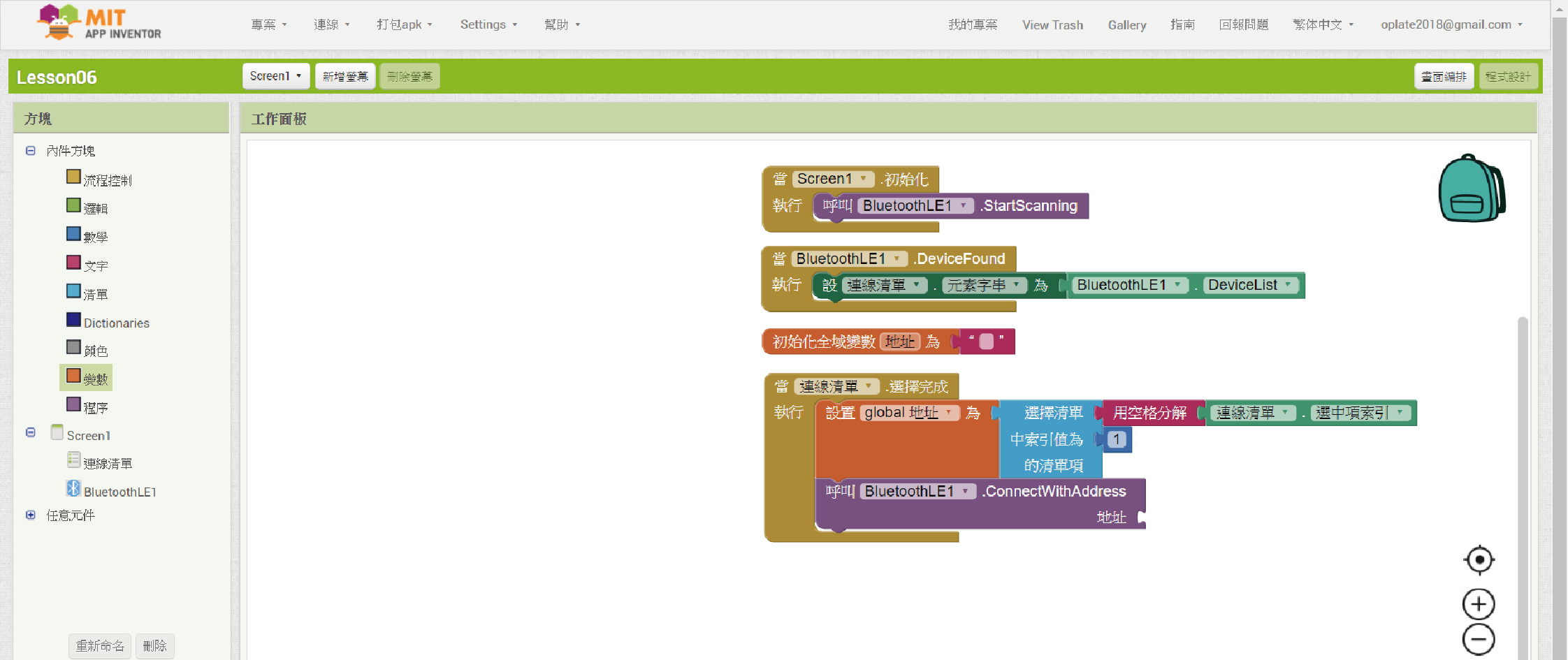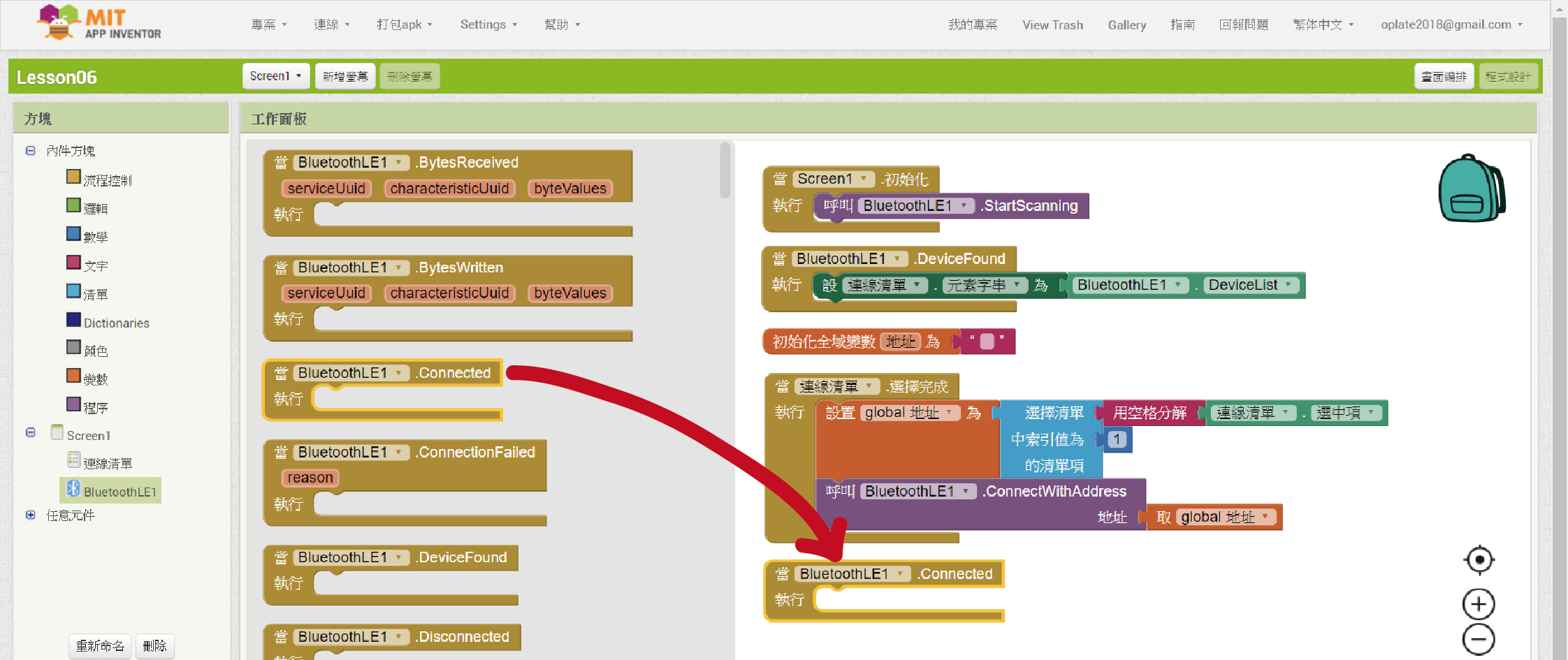 23. 「當”BluetoothLE1”. Connected 執行」程式方塊是說當連線成功後我們要執行什麼事。