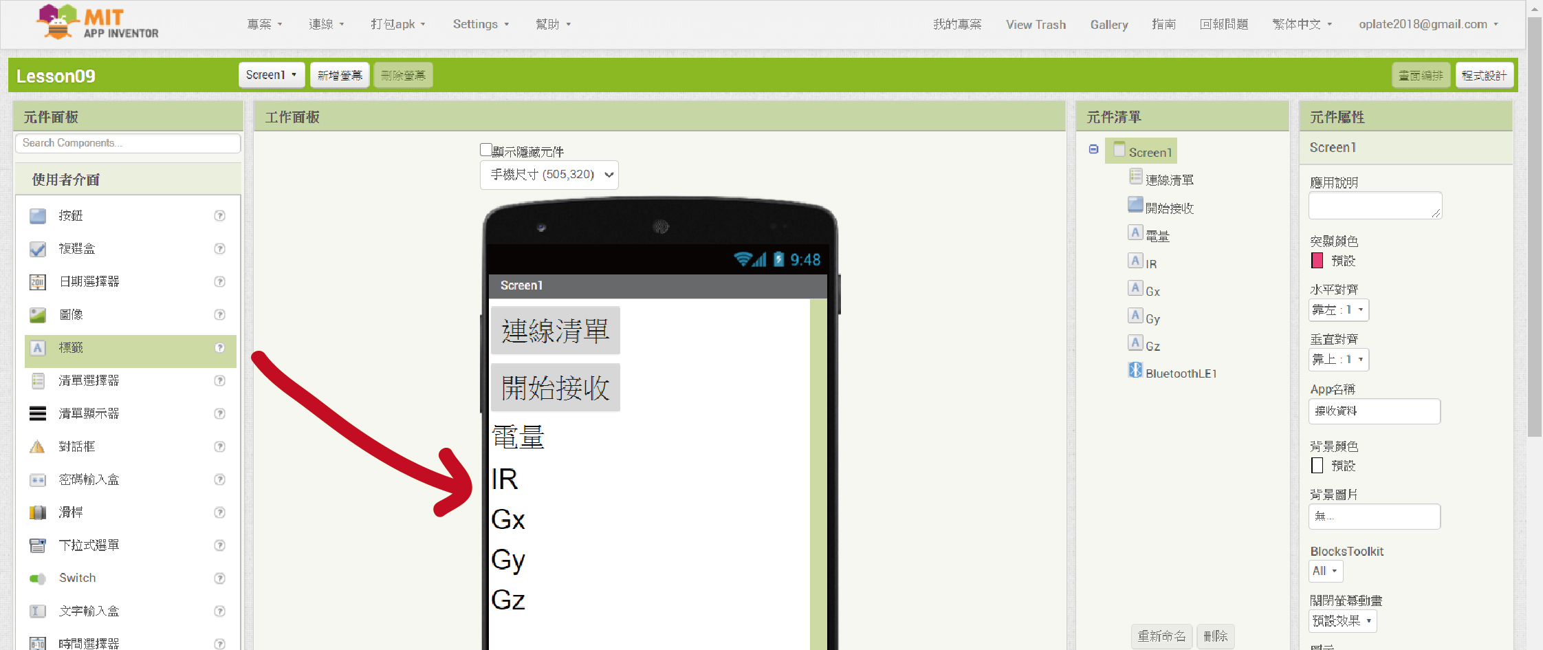 放進一個「開始接收」按紐和五個之後用來顯示電源、IR和G-Sensor數值的標籤。