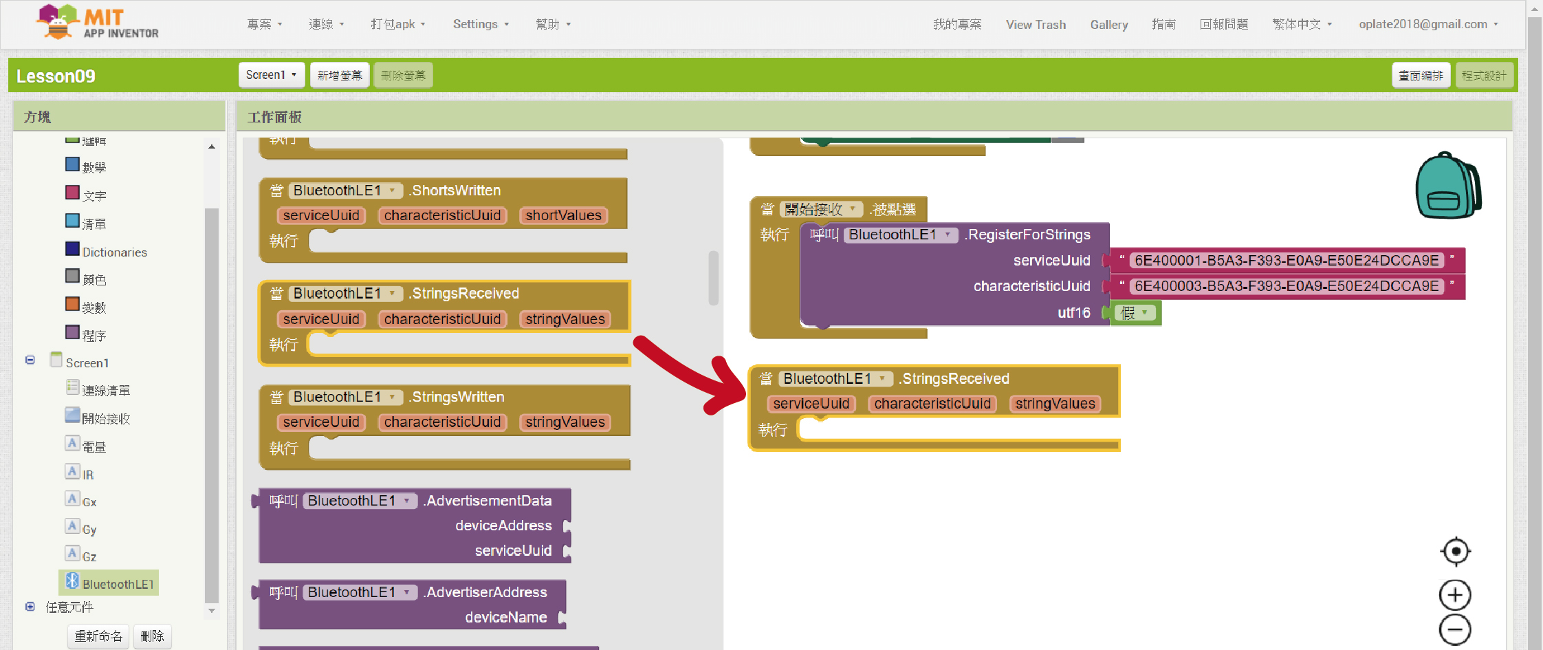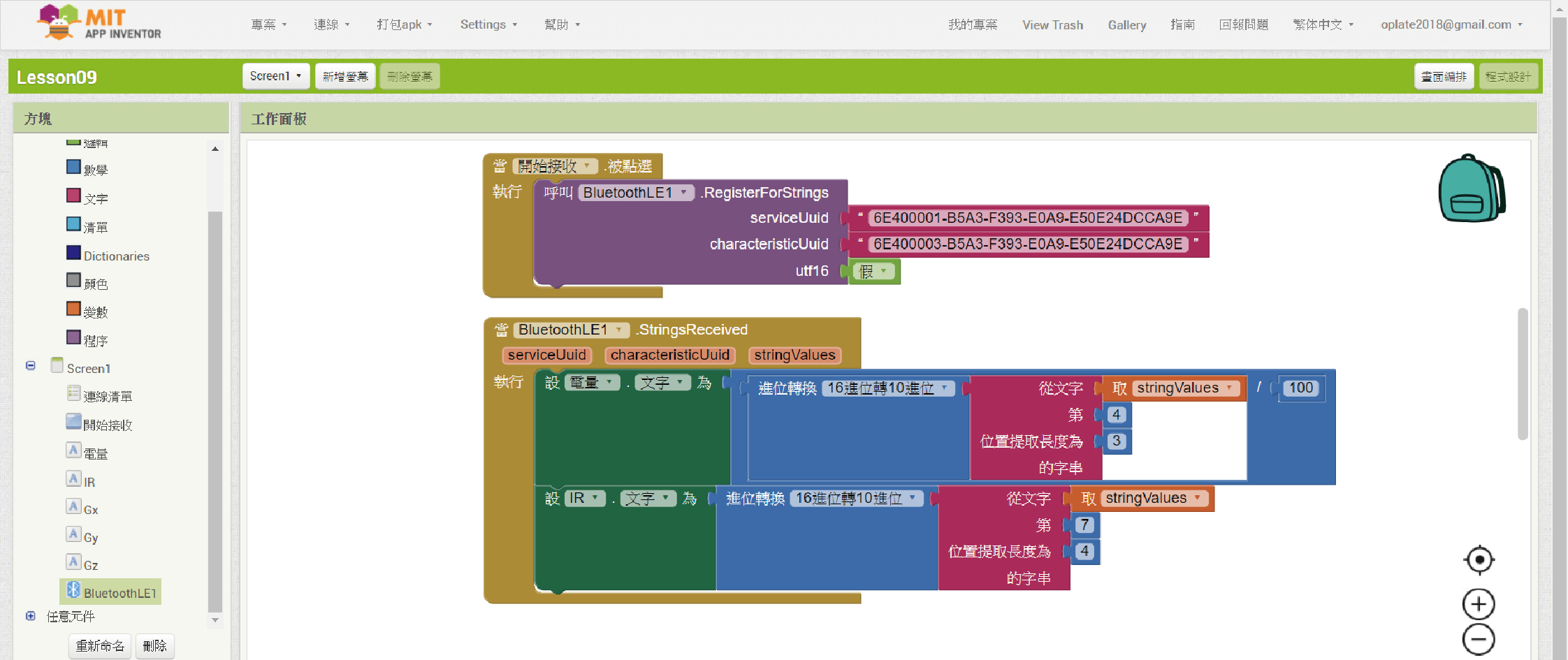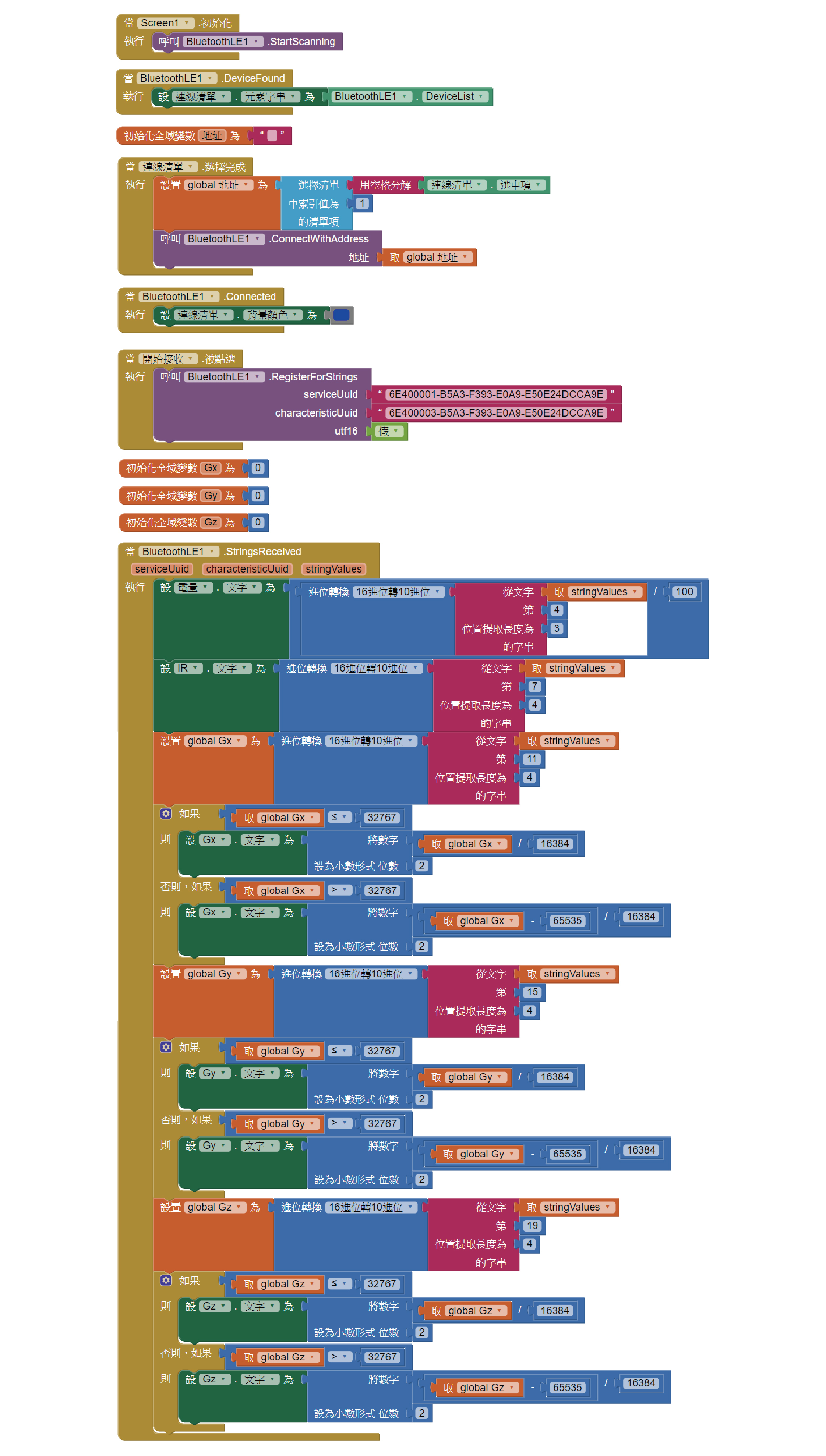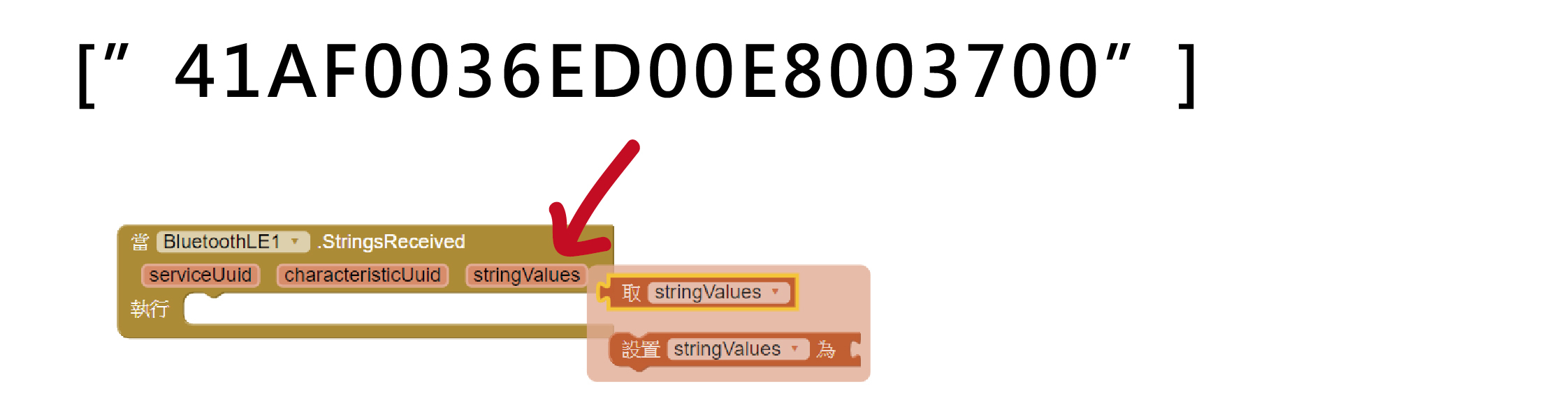 我們可以從「當”BluetoothLE1”. StringsReceived 執行」程式方塊裡取得接收到的資料。