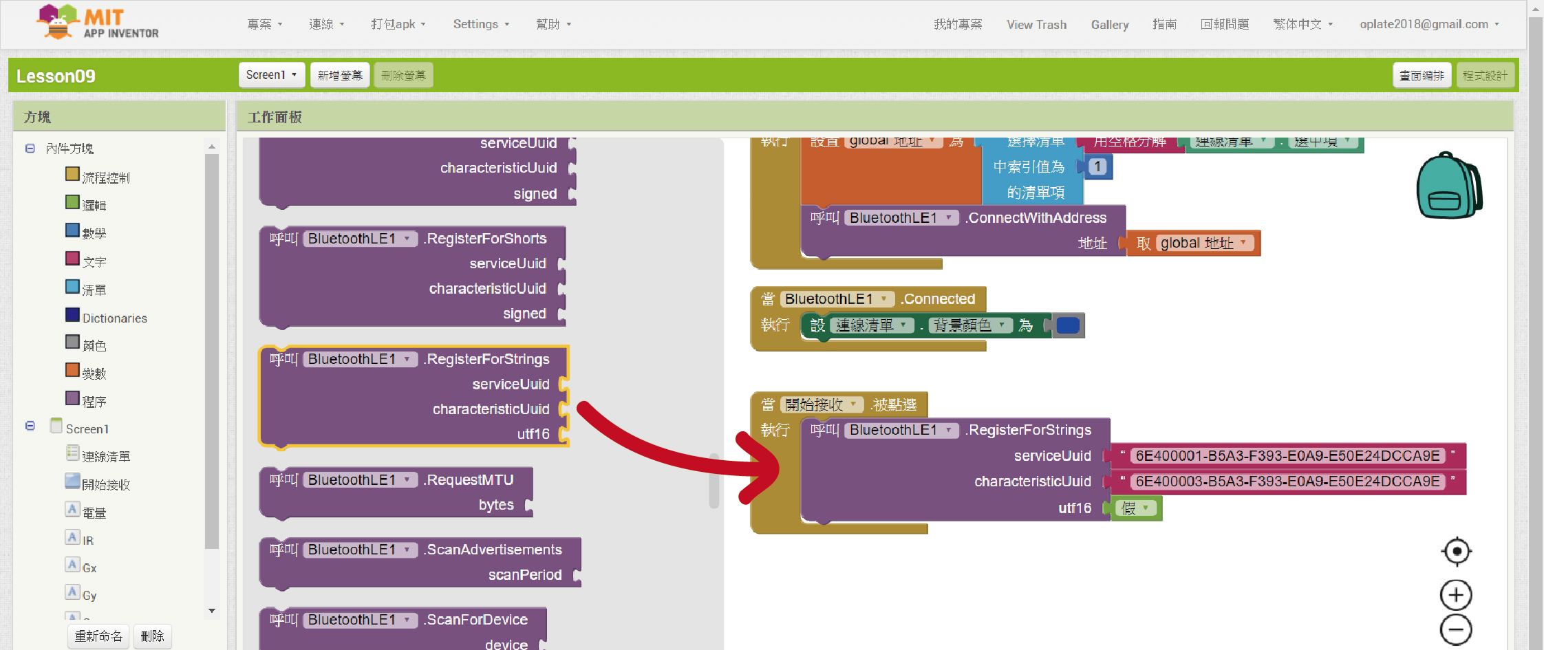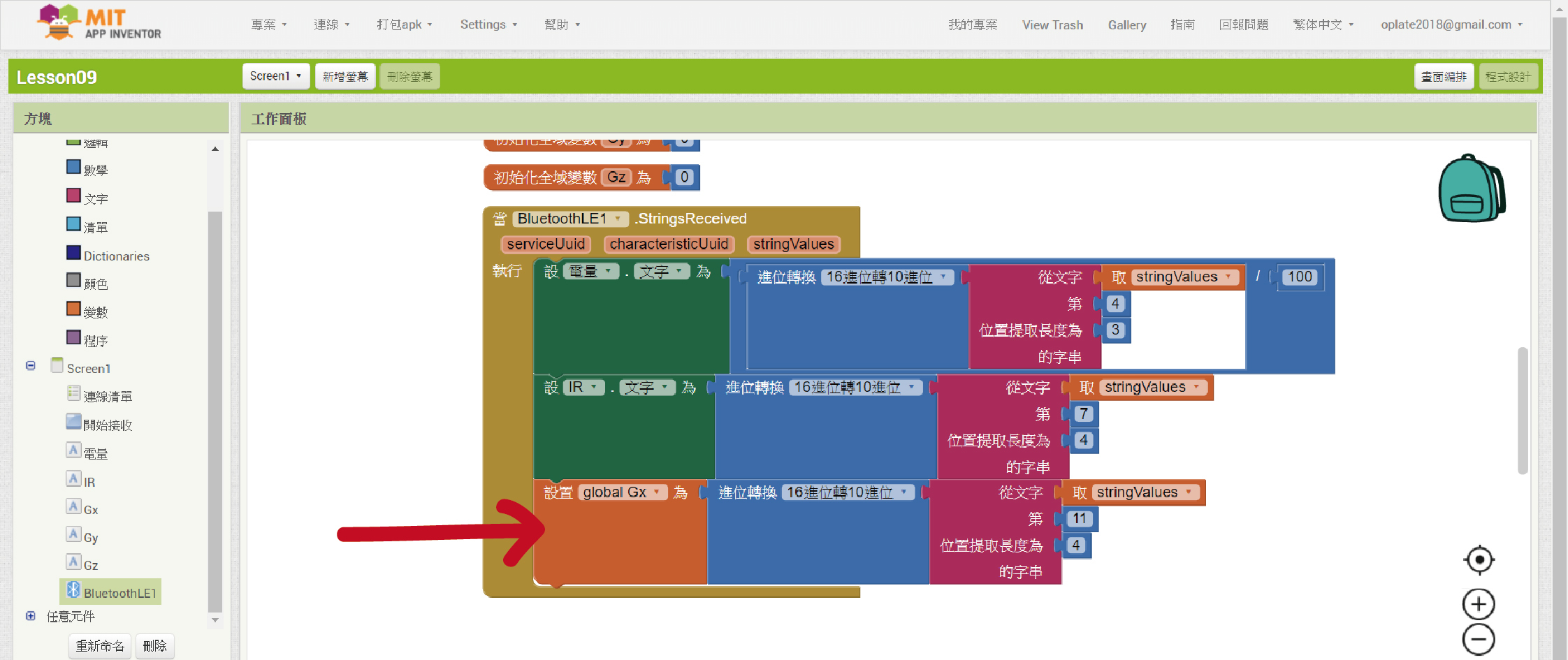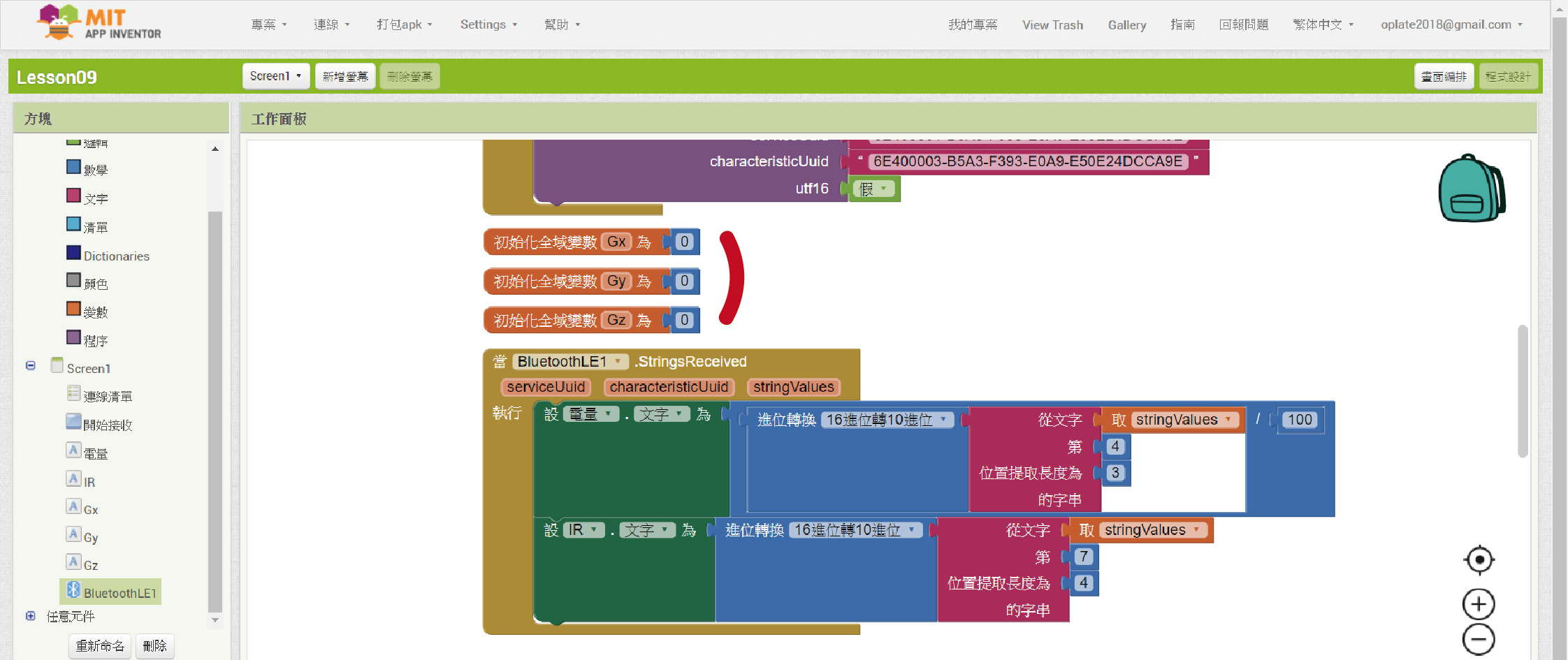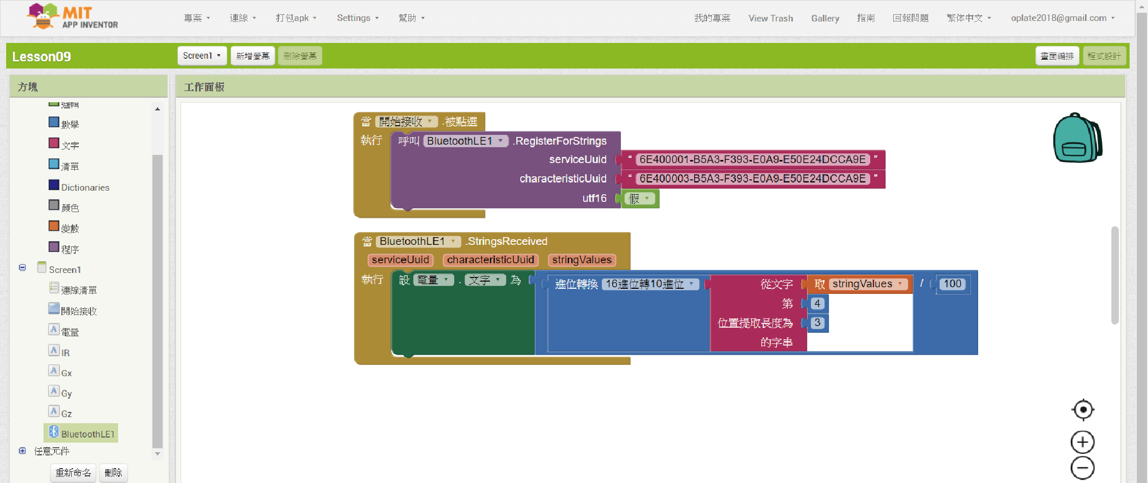 我們可以從「當”BluetoothLE1”. StringsReceived 執行」程式方塊裡取得接收到的資料。