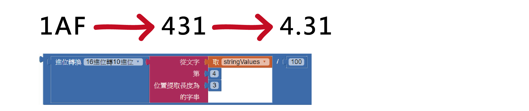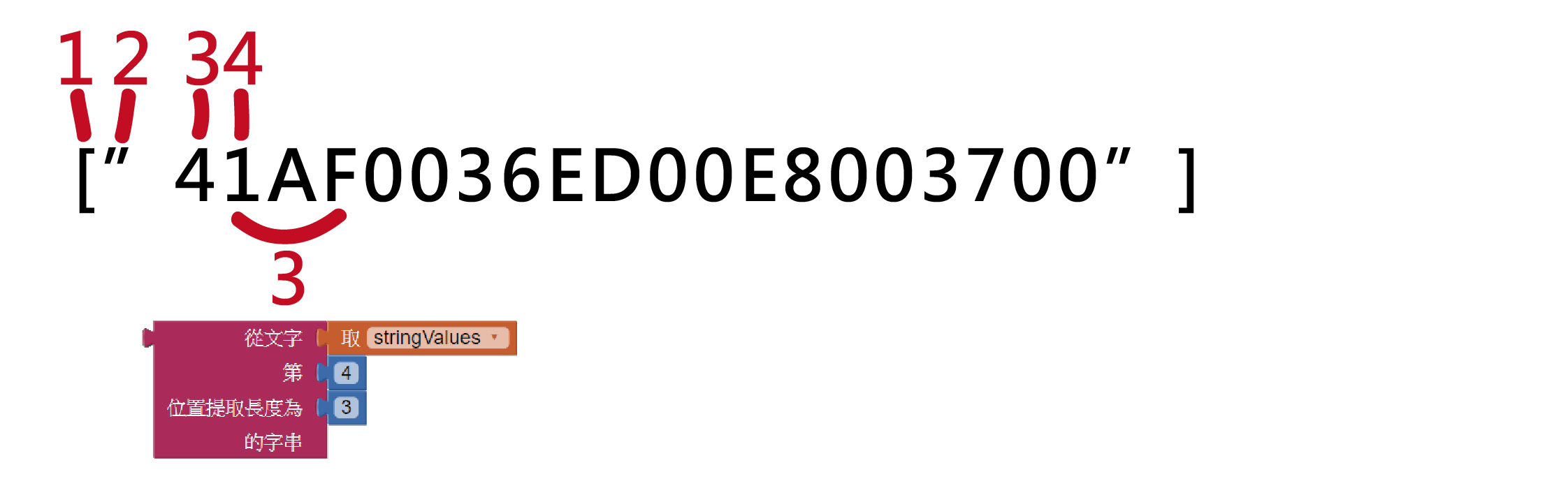 圖中程式方塊可以從一個字串裡擷取出我們想要的部分,我們用它來從原始資料中擷取出1AF。
