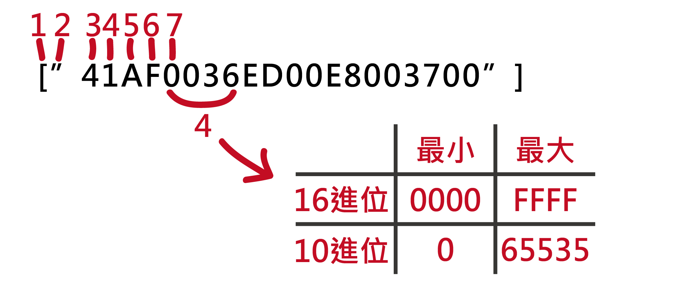 資料由16個英文字母或數字組成,是16進位的格式,分別代表的資料如圖所示。