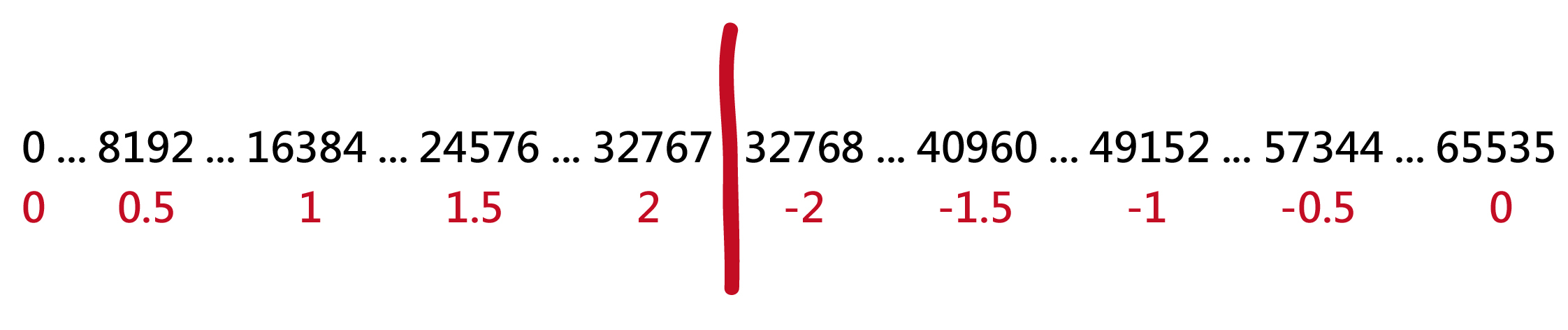 “0 ~ 65535” 從32767和32768的中間切一半, “0 ~ 32767” 分給 “0 ~ 2”, “32768 ~ 65535” 分給 “-2 ~ 0” 。