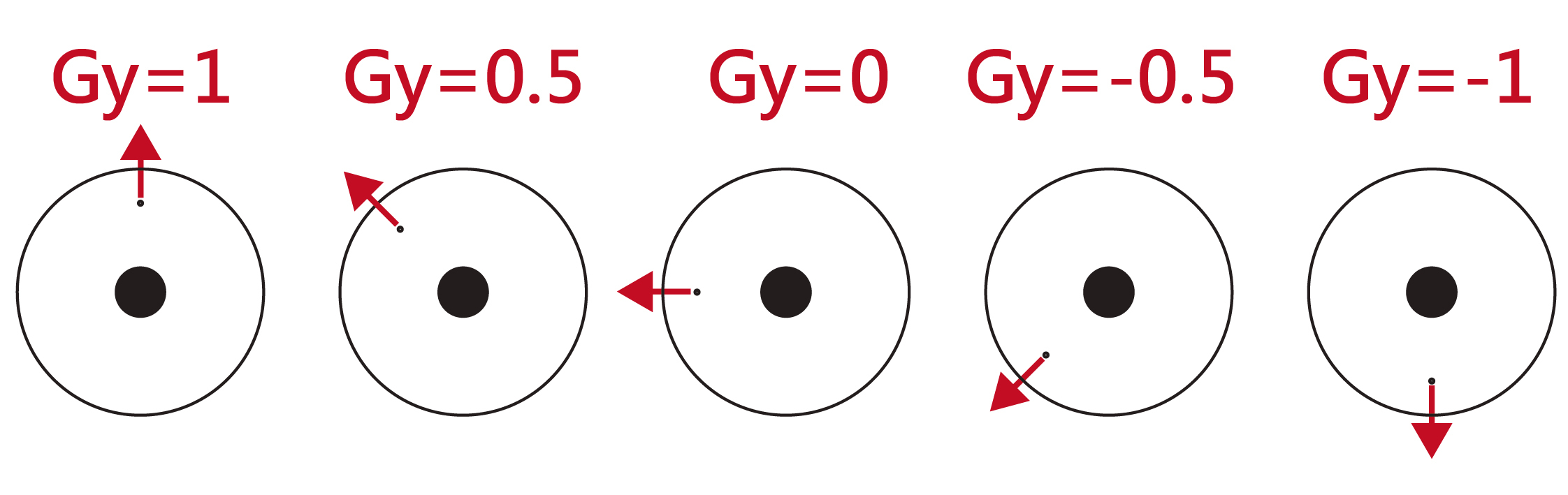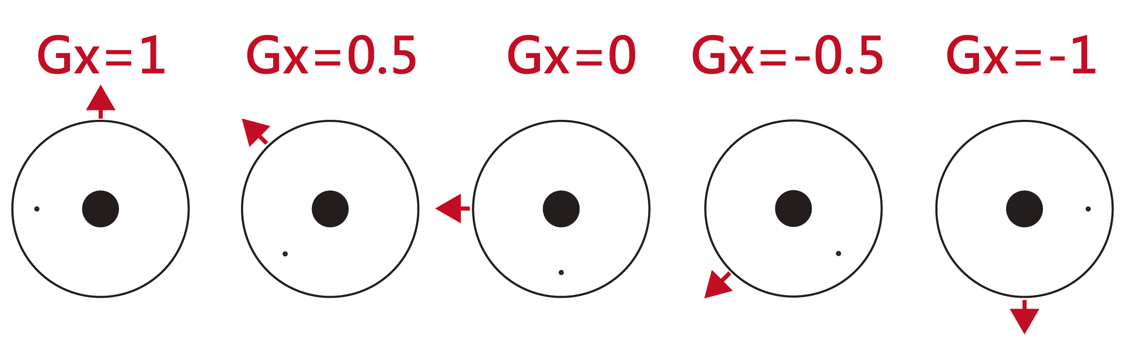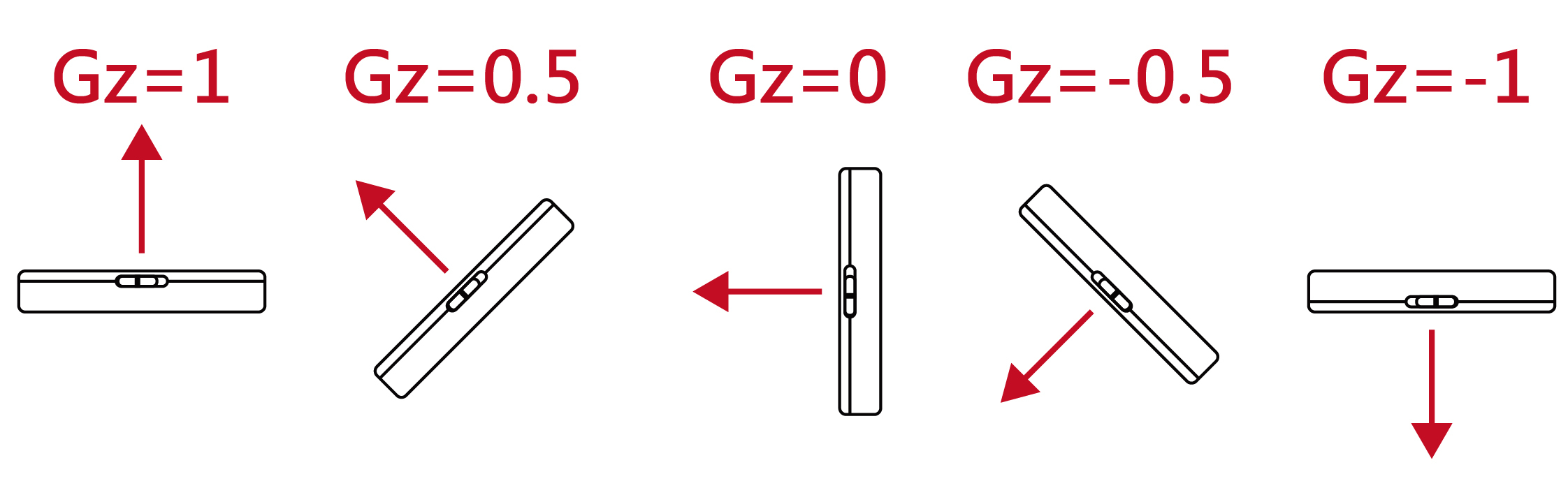 當小黑盤的USB充電孔垂直地面朝上時Gx=1,Gx值與轉動角度相對關係。(小黑點是蜂鳴器孔)