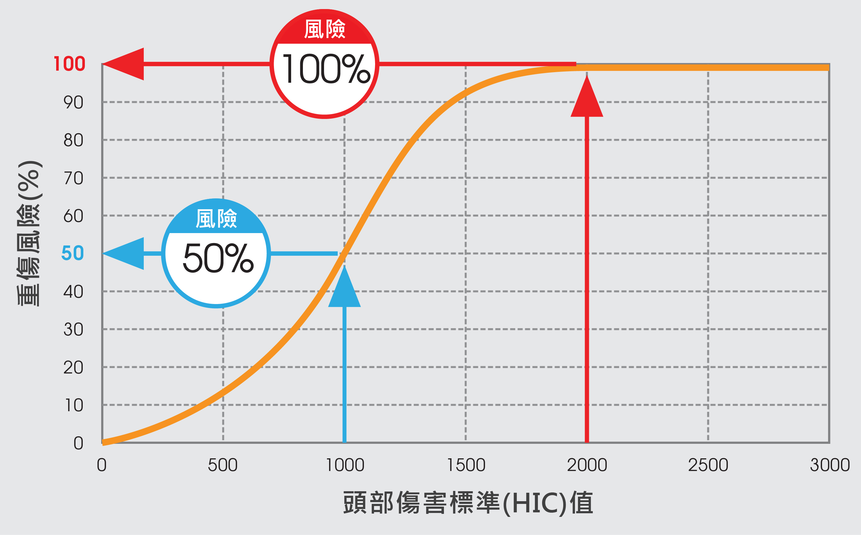 HIC(頭部傷害基準)值是指當腦或頭蓋骨受到衝擊時其損傷程度的數值。以此評估撞車時乘客的安全性或孩童從遊樂場設備摔下的頭部保護標準值等情況。 例如,當頭部遭受HIC值2000的衝擊時,重傷風險是100%。(參照下圖)當HIC值從2000降到1000時,可以將重傷風險變成減半。 abonet以此評估系列產品衝擊吸收性能,提供客人情報並致力於商品的開發和改良。 |