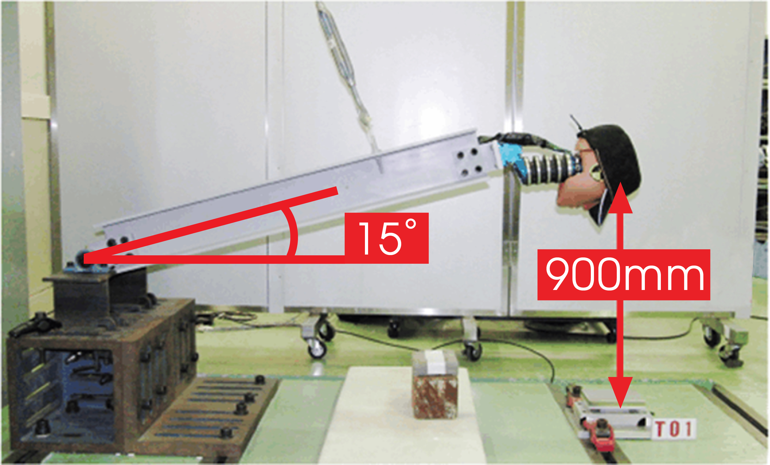 【實驗裝置】 身體部分為H型鋼,頭頸部則使用假人(Hybrid 3型第50百分位男性假人) 質量47.8kg,旋轉中心至頭頂約1500mm(日本70歲男性平均身長:1.065m,體重:59.3kg)(參照下圖) 【實驗條件】 角度約15度,高度約從900mm高的碰撞面落下(無帽情況下HIC值=2000之條件) 從頭部3軸之加速度算出HIC值,在各項產品、幾個地方的碰撞位置施測。 【注意】 abonet雖能緩和衝擊,但不能100%完全吸收衝擊以保護頭部。 |