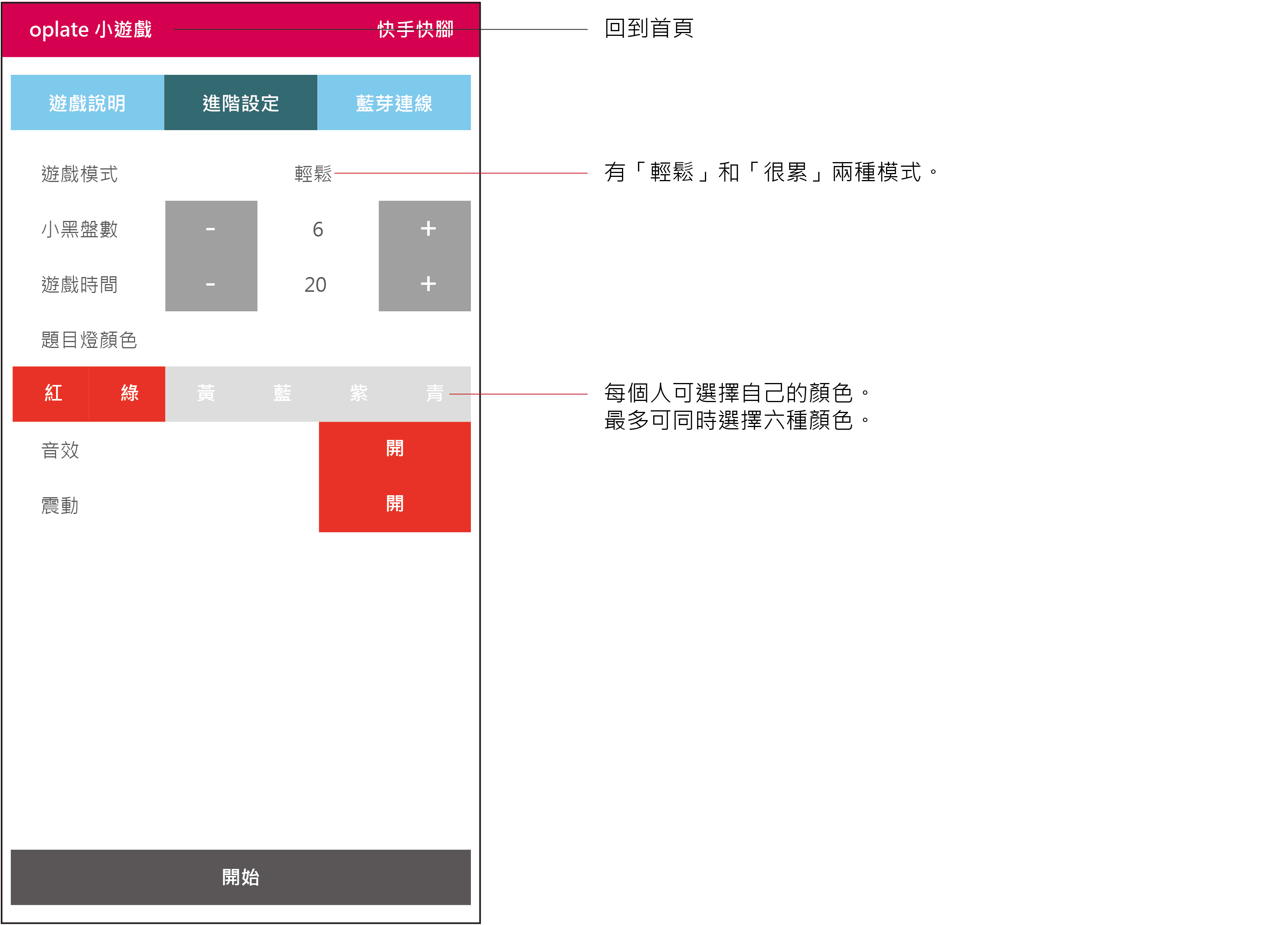 「輕鬆」模式只要用感應就能讓小黑盤變色,「很累」模式則是要甩動小黑盤數次才會變色。