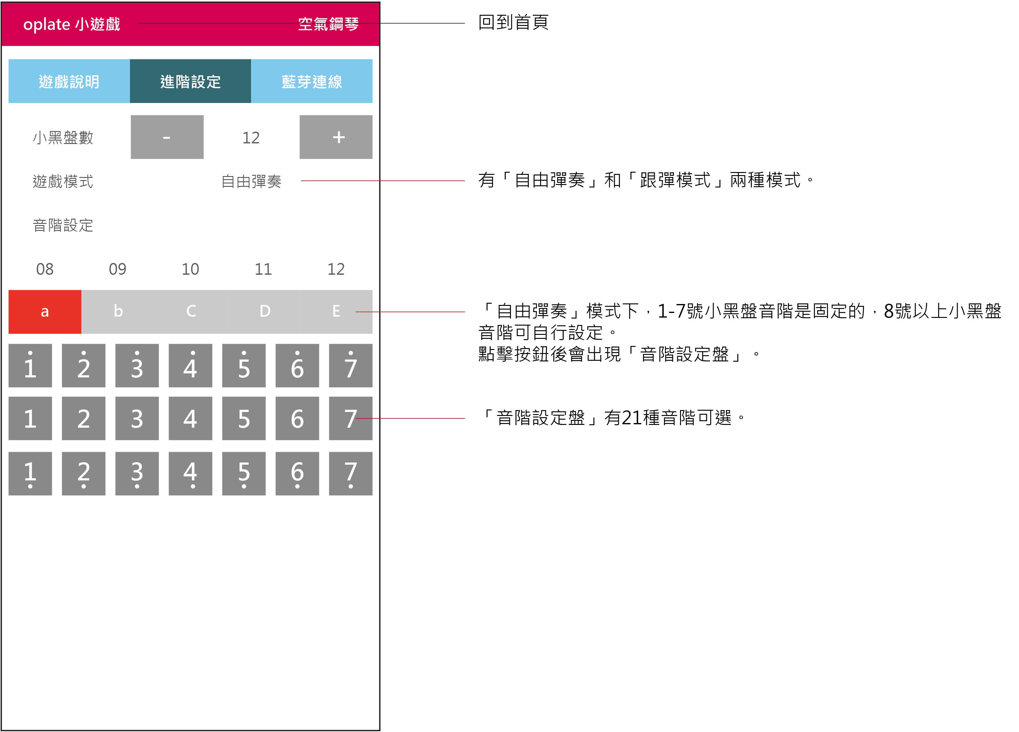 遊戲模式為「自由彈奏」時,可選擇的小黑盤數為1到12個,前7個小黑盤的聲音 固定為Do到Si。