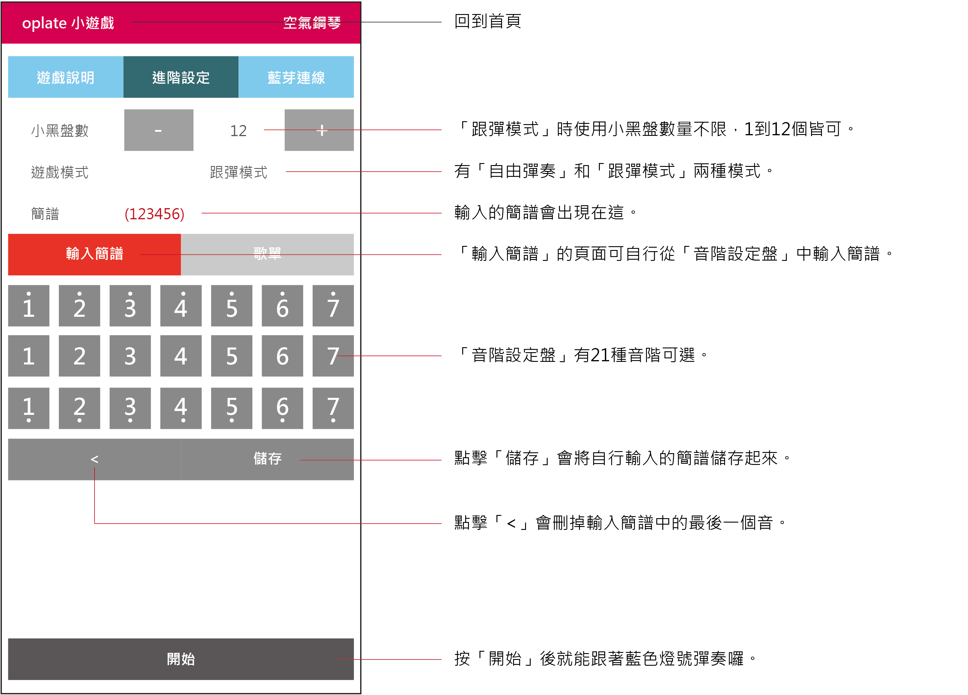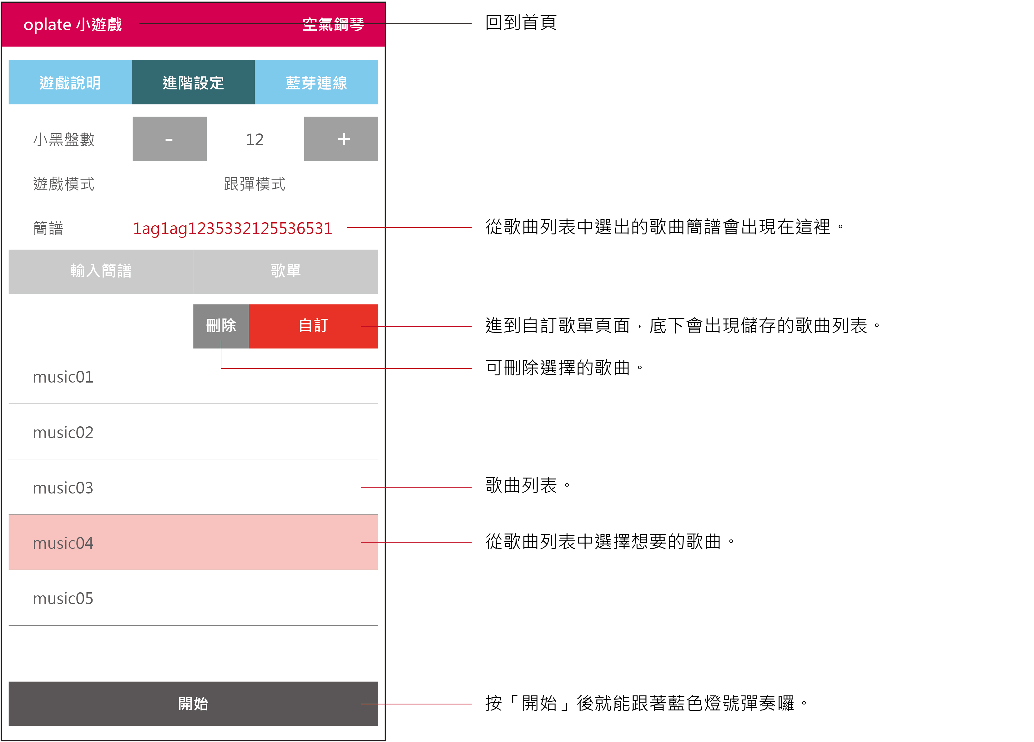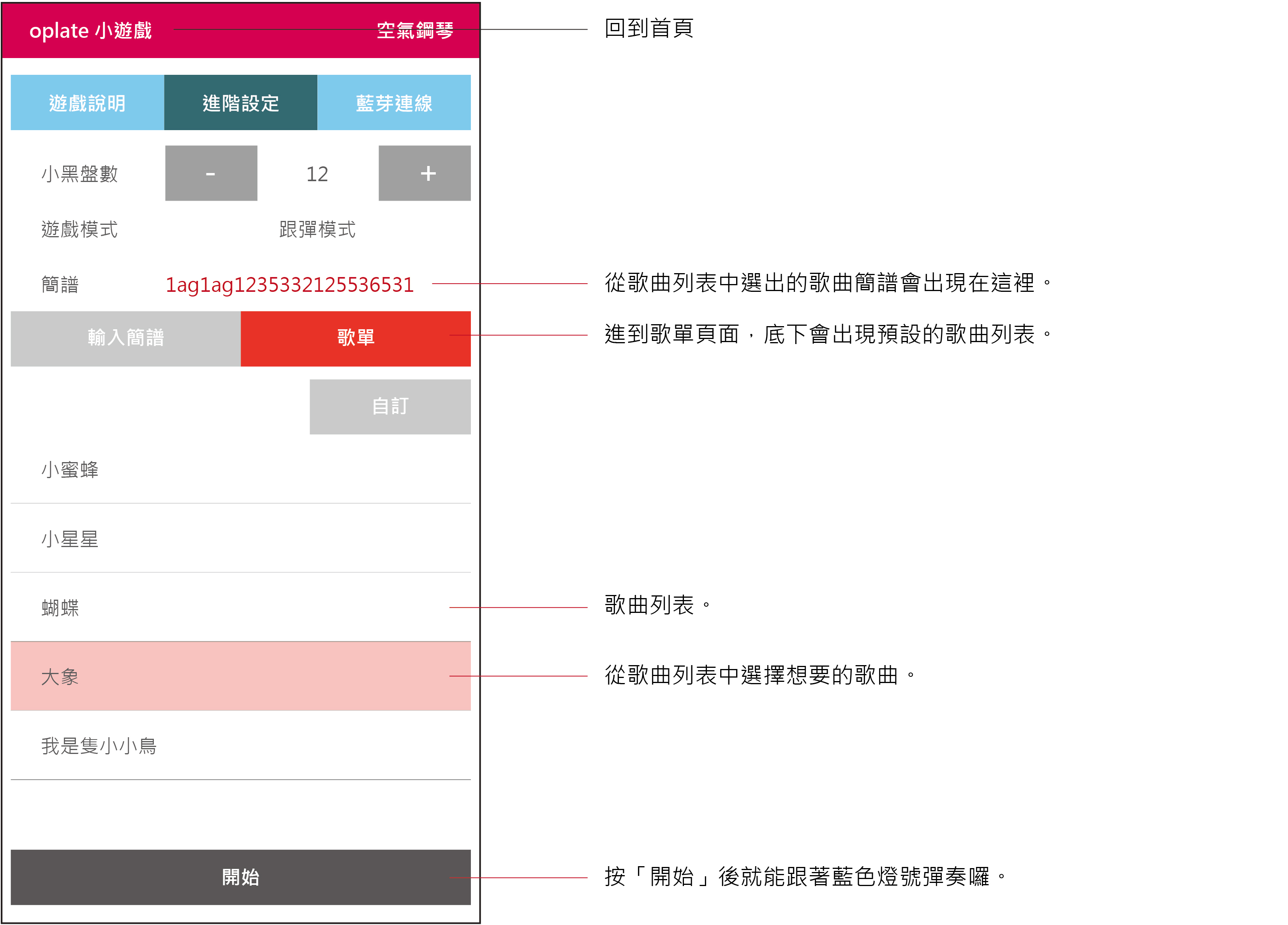 2. 「跟彈模式」可以自行輸入簡譜或是使用現有歌單,按「開始」後就能跟著藍色燈號彈奏囉。