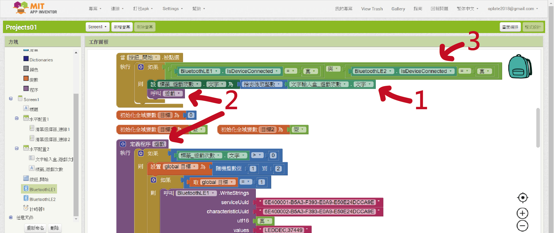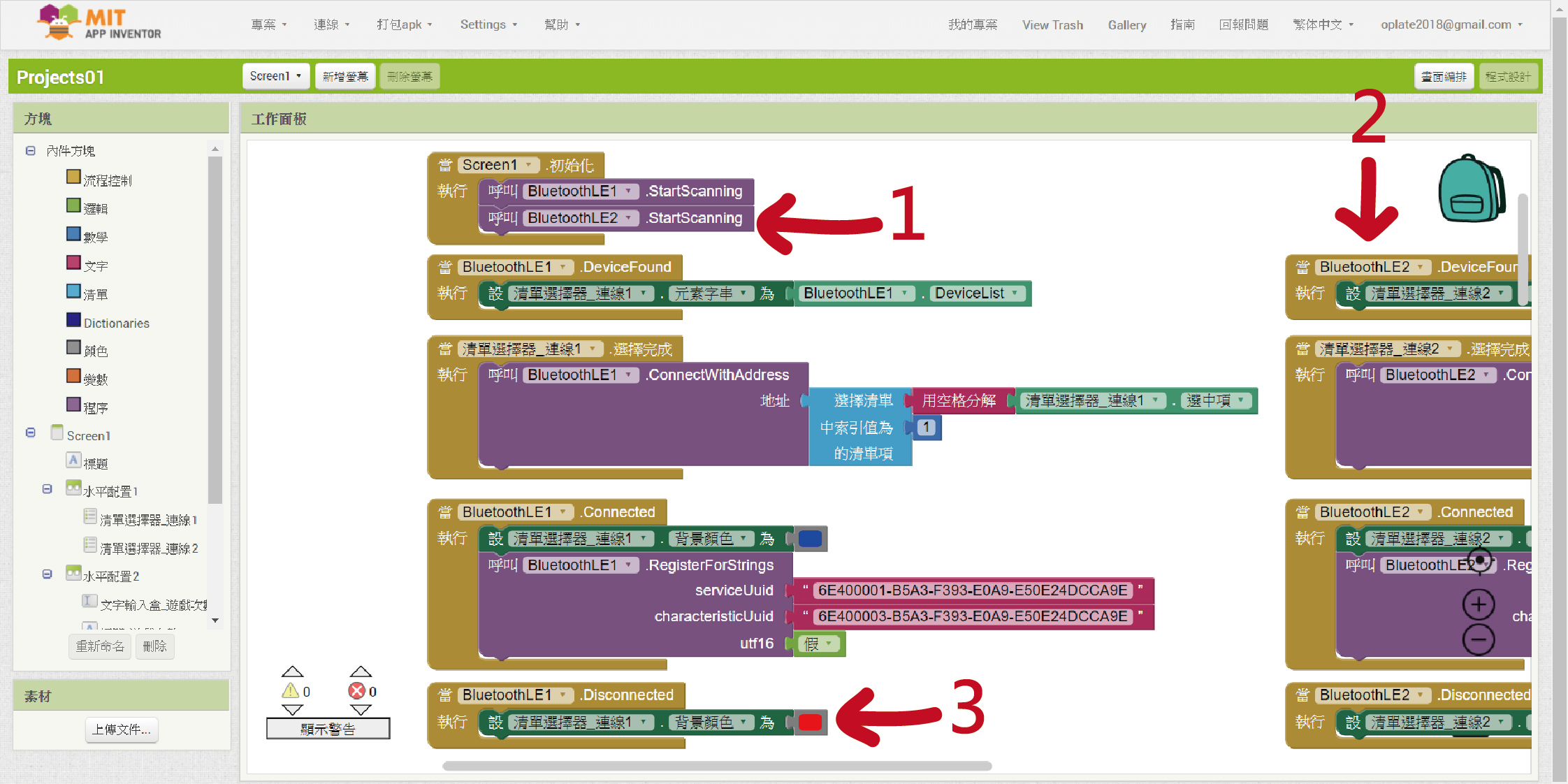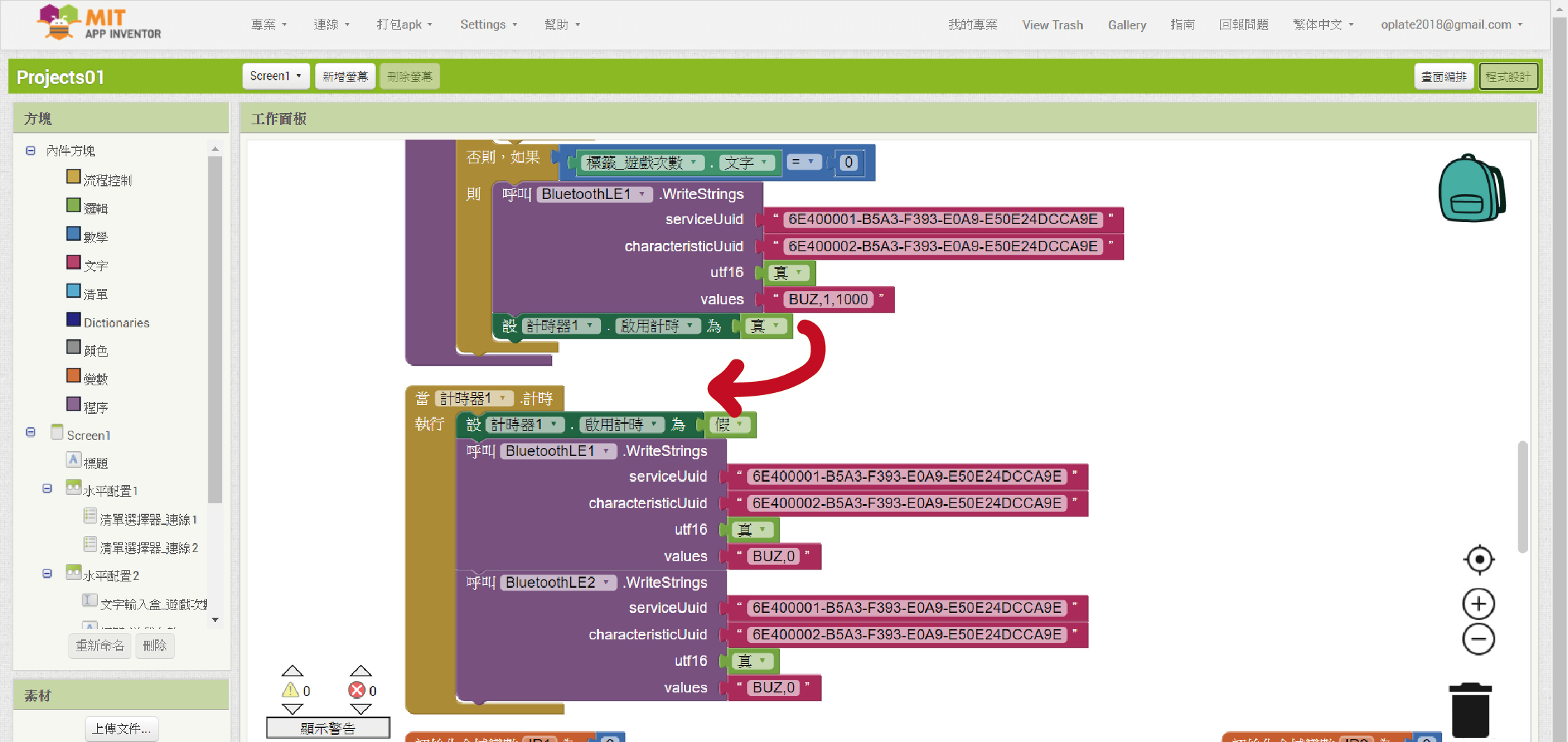 4. 進到「畫面編排」,圖中為藍芽連線的程式方塊組合。