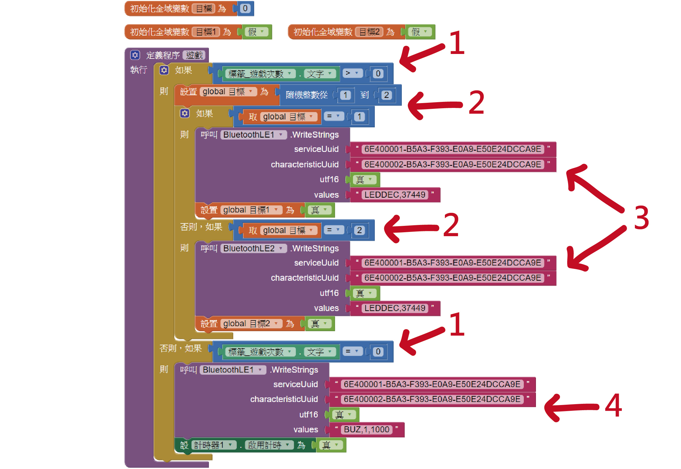 程式方塊是隨機從1和2中選一個設為變數「目標」,變數「目標」=1代表1號小黑盤,2代表2號小黑盤。