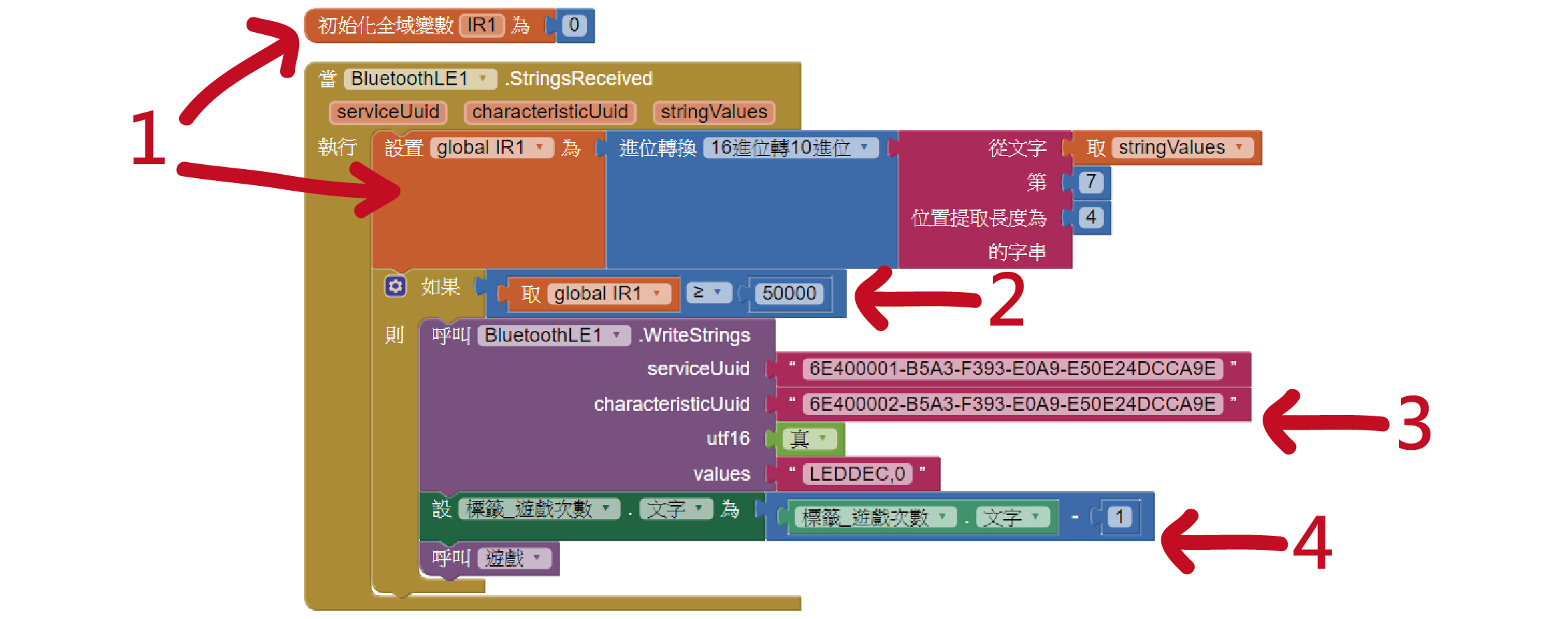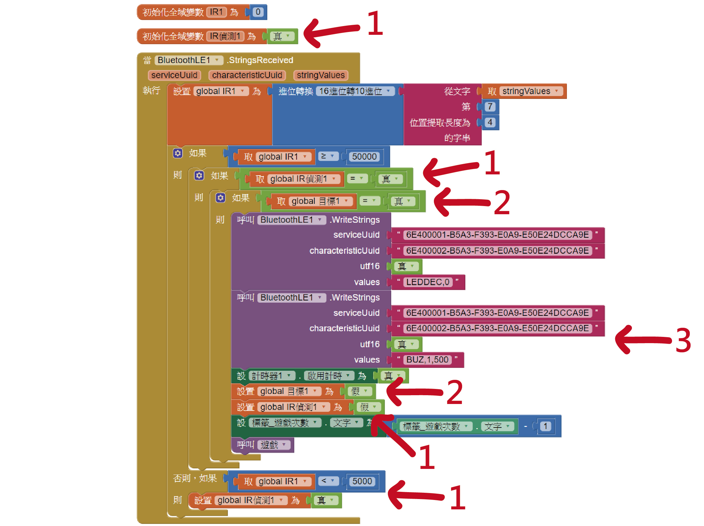 當條件符合感應到的IR值>50000同時變數「IR偵測1」=「真」時,才能執行其中的內容。內容裡會先將變數「IR偵測1」變成「假」,如此就不會重複執行了。