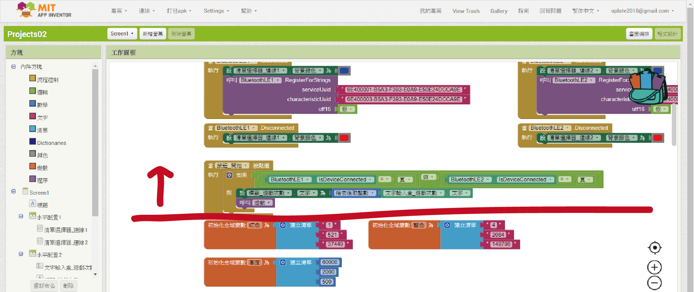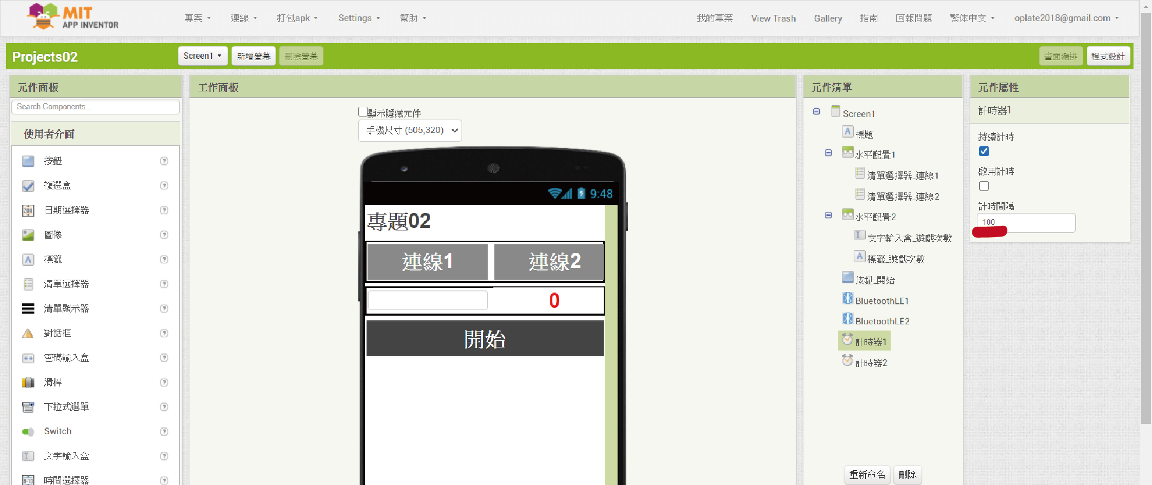 1. 「計時器1」的「計時間隔」為100,代表每0.1秒會執行一次以下的動作,就是每0.1秒看一下兩手有沒有在正確高度。