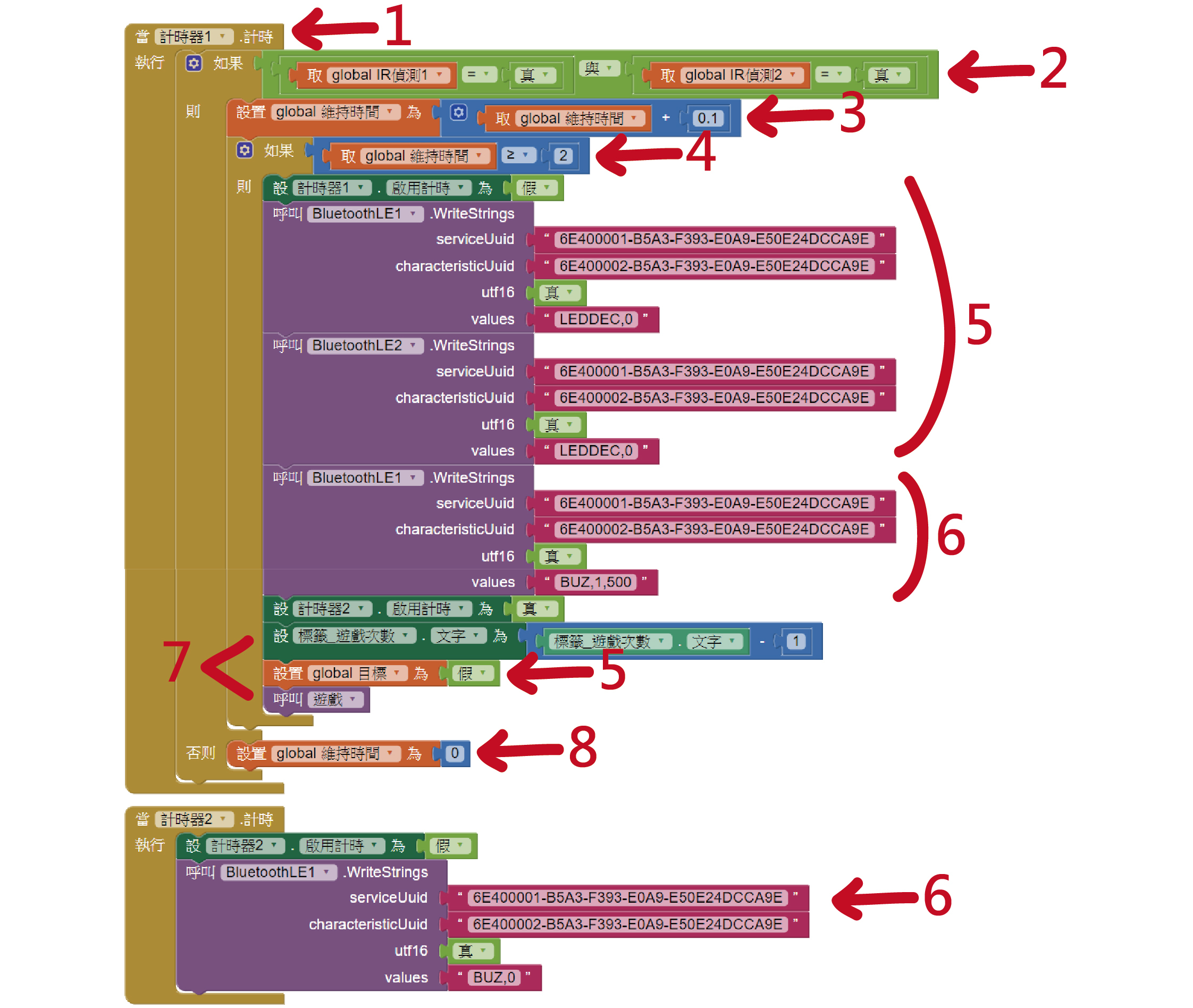 8. 以上當變數「偵測1」和「偵測2」都為「真」的時候,變數「維持時間」就會隨著「計時器1」增加。